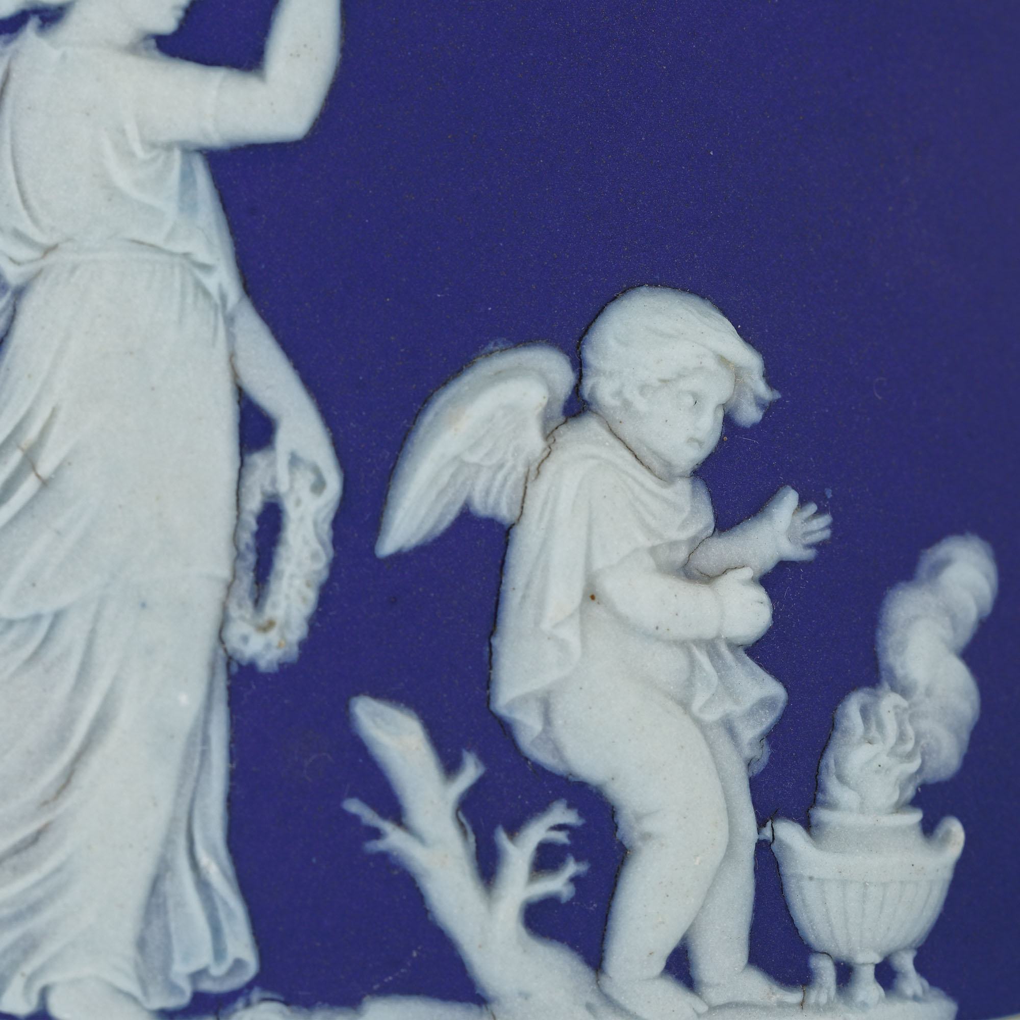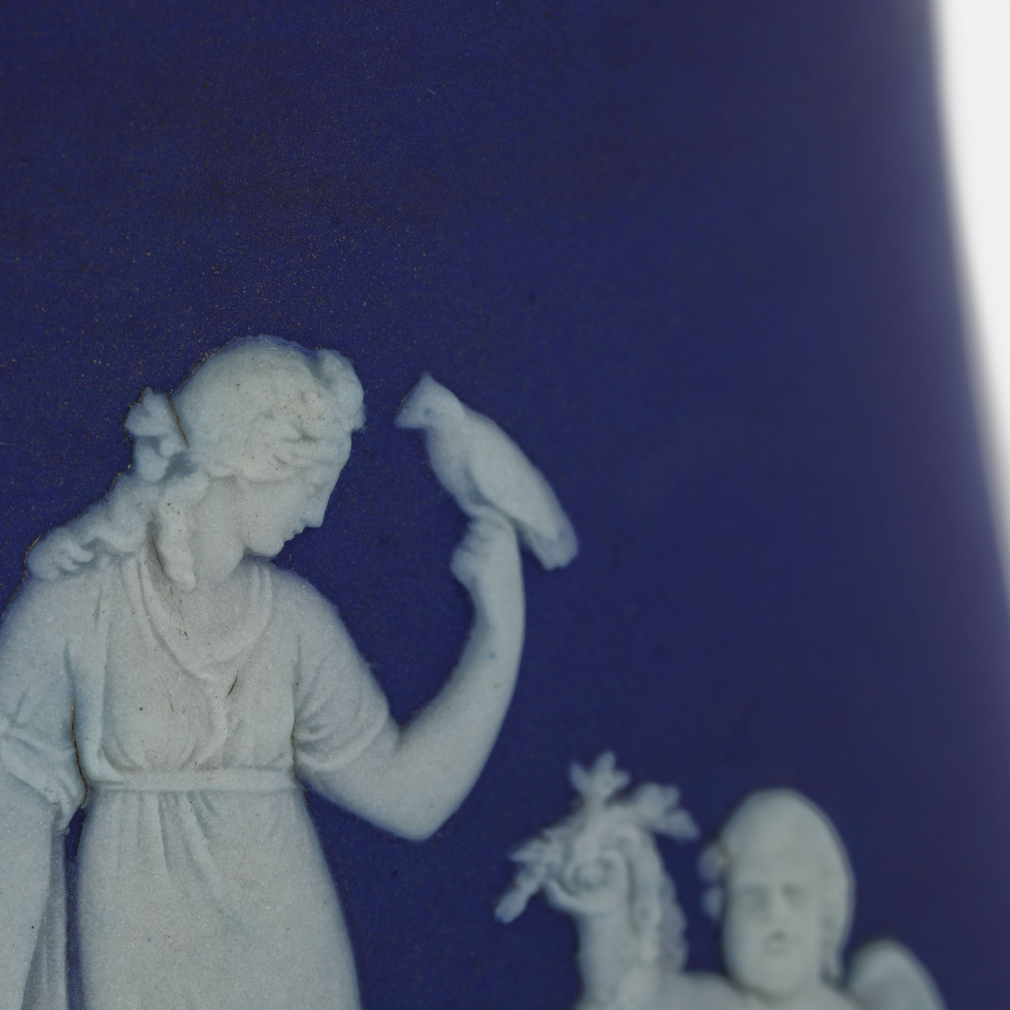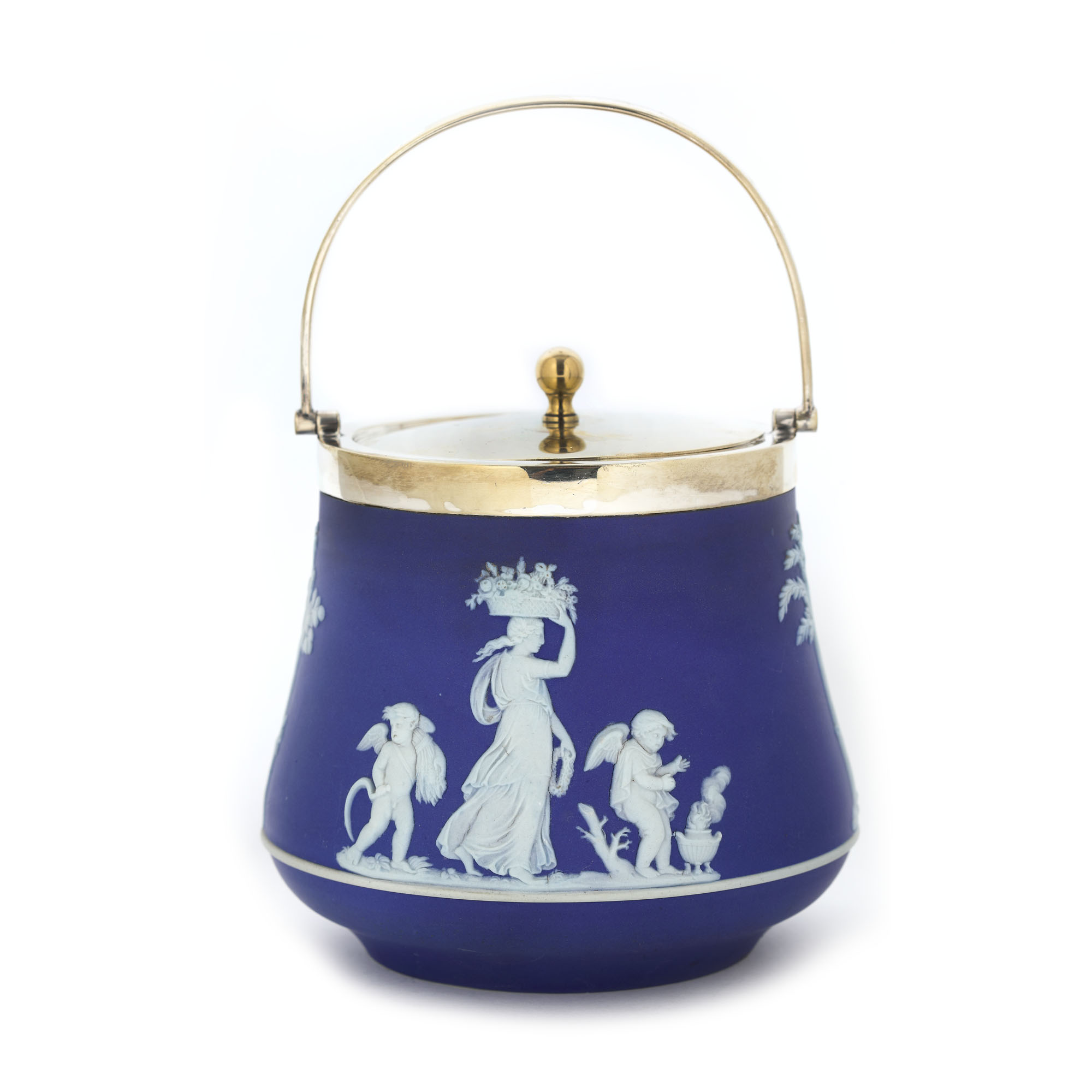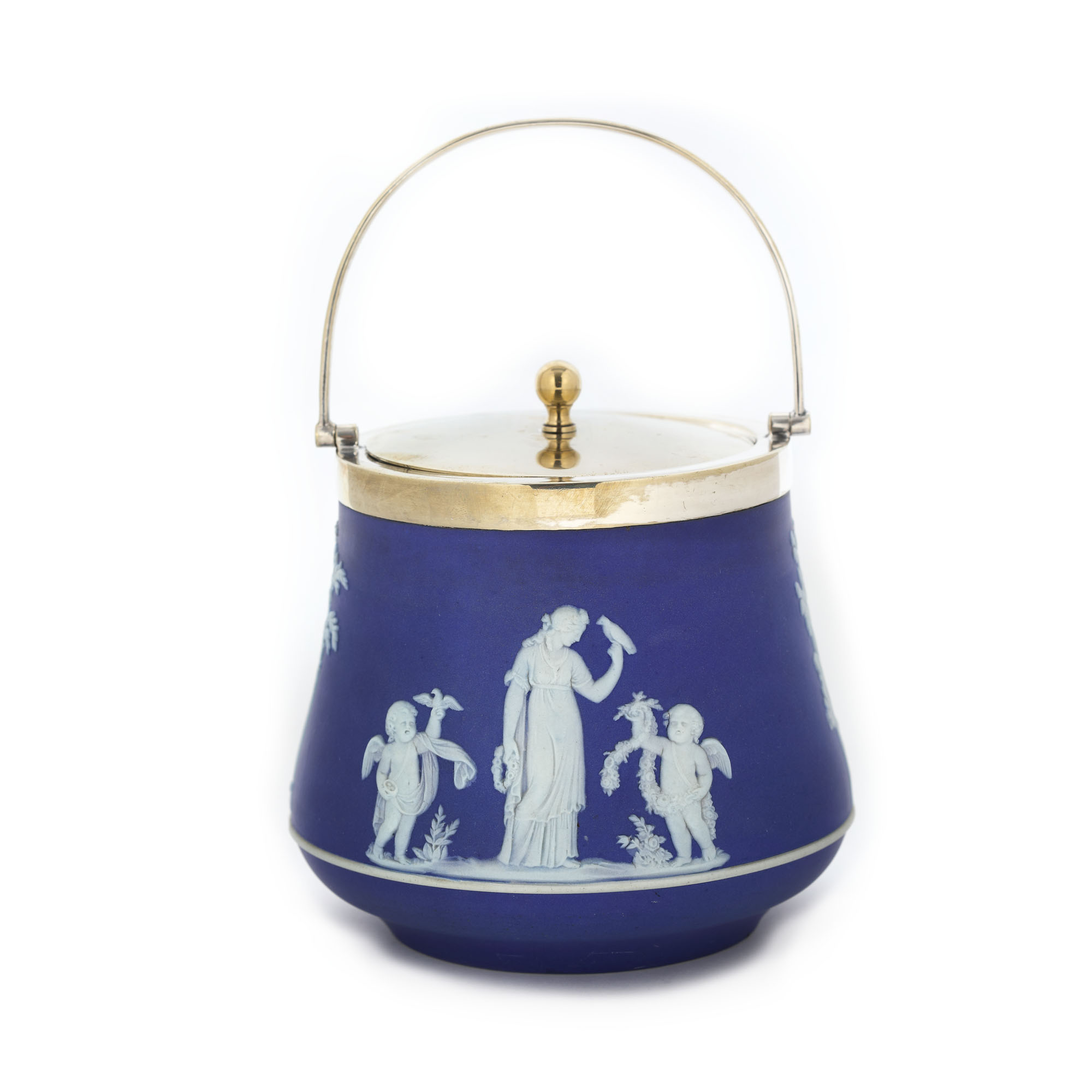 132. Biscotieră din porțelan Wedgwood, cu ansă, decorată în cameo cu vestale și putti, cca. 1900