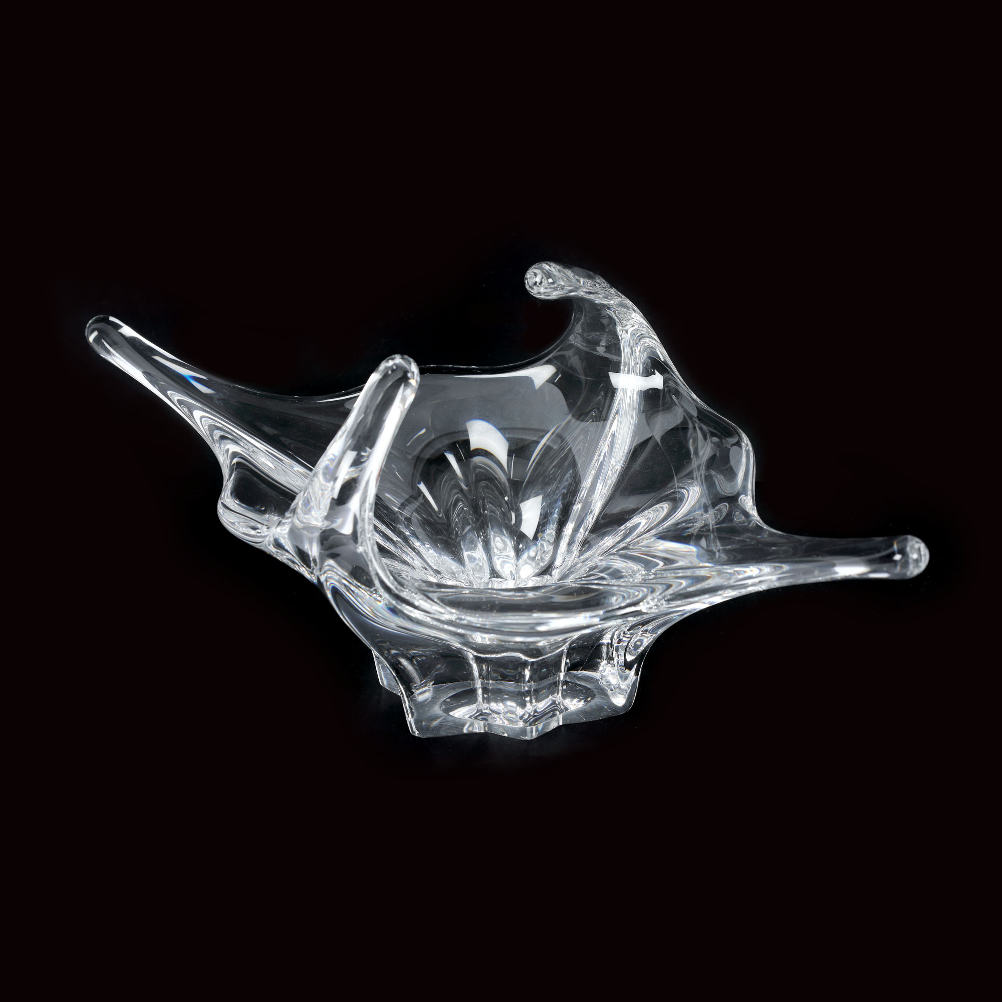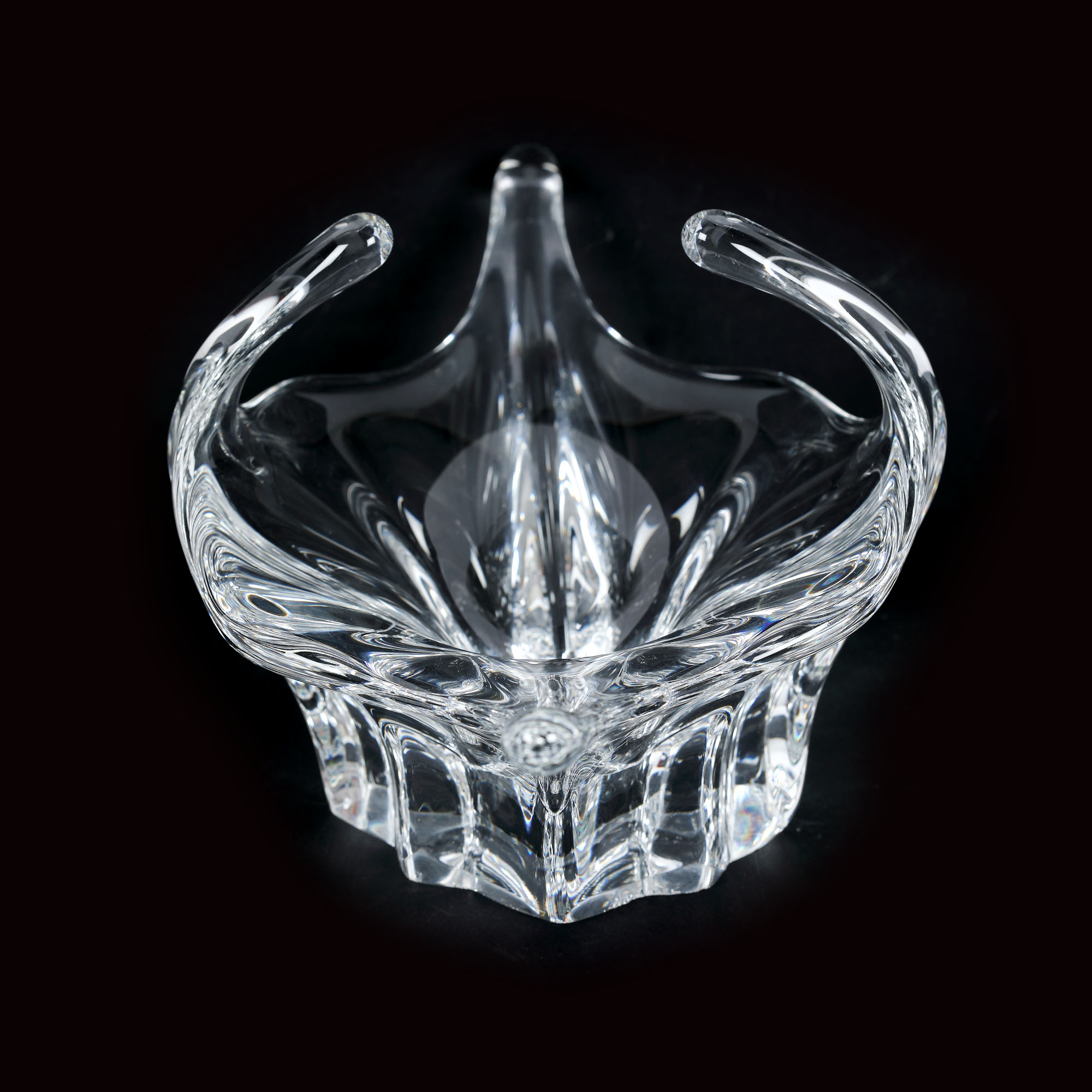Bombonieră de formă ovală, pe talpă pătrată, cu anse prelungi. Marcat prin gravare.