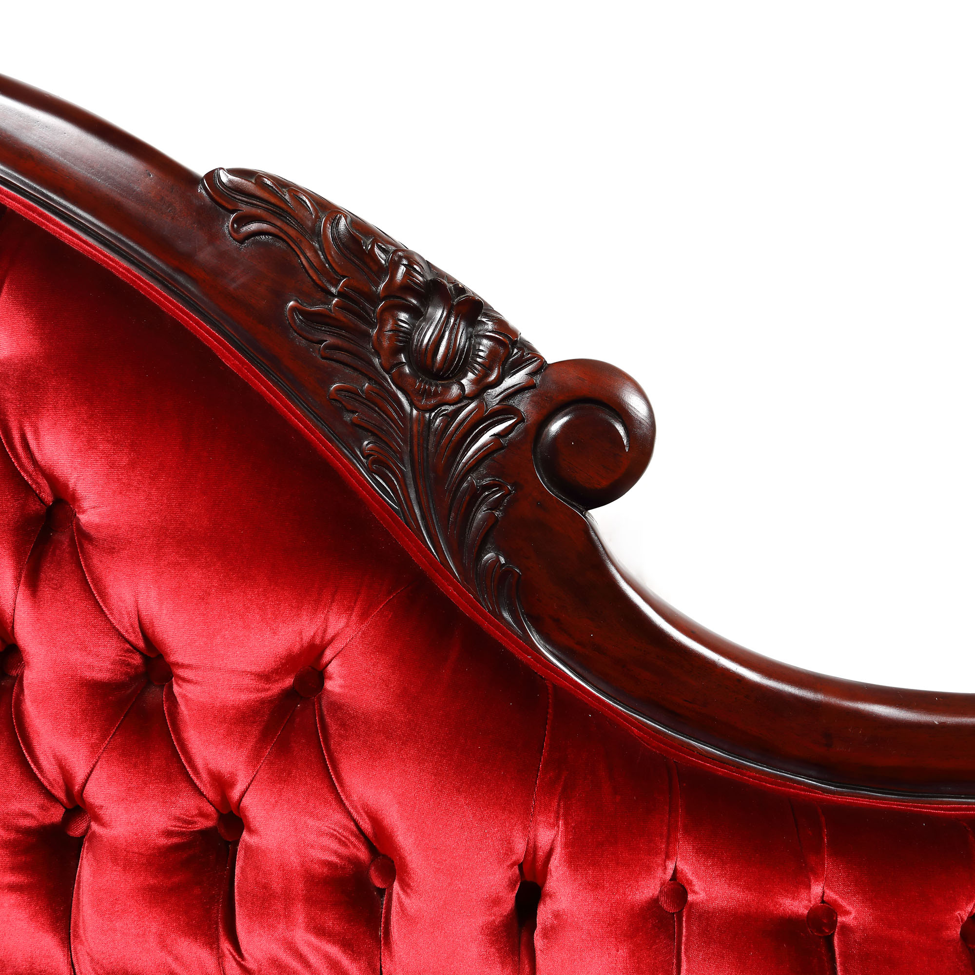 Canapea tip recamier, cu cotiere și spătar capitonate, cu butoni, din lemn sculptat în decor vegetal.