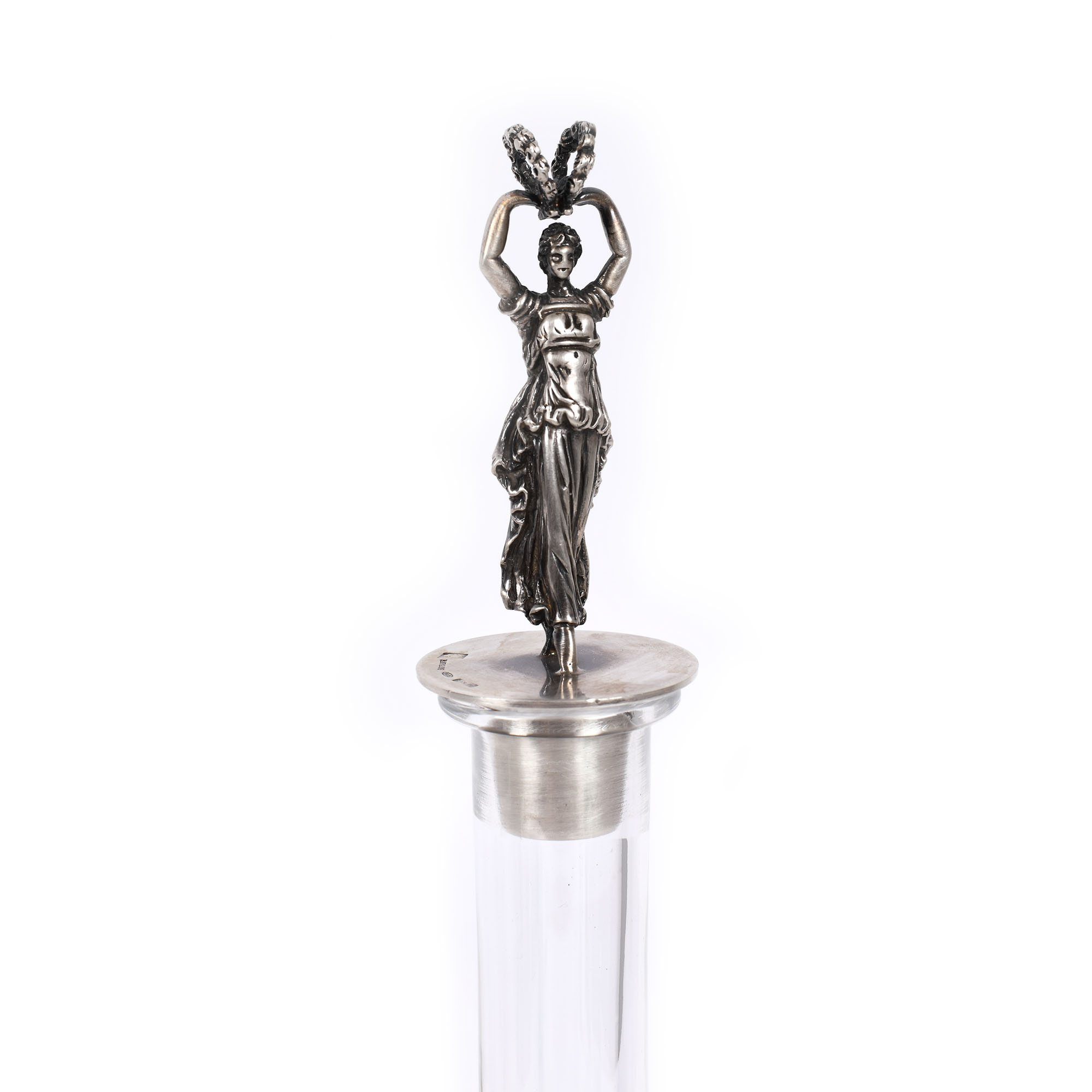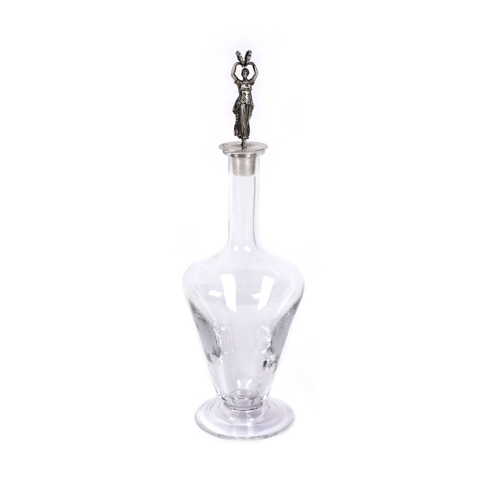 Carafă pe talpă circulară, corp piriform, gât lung cilindric, cu dop din argint, fiugurând personaj feminin „Victorie”. Marcat, poansonat.