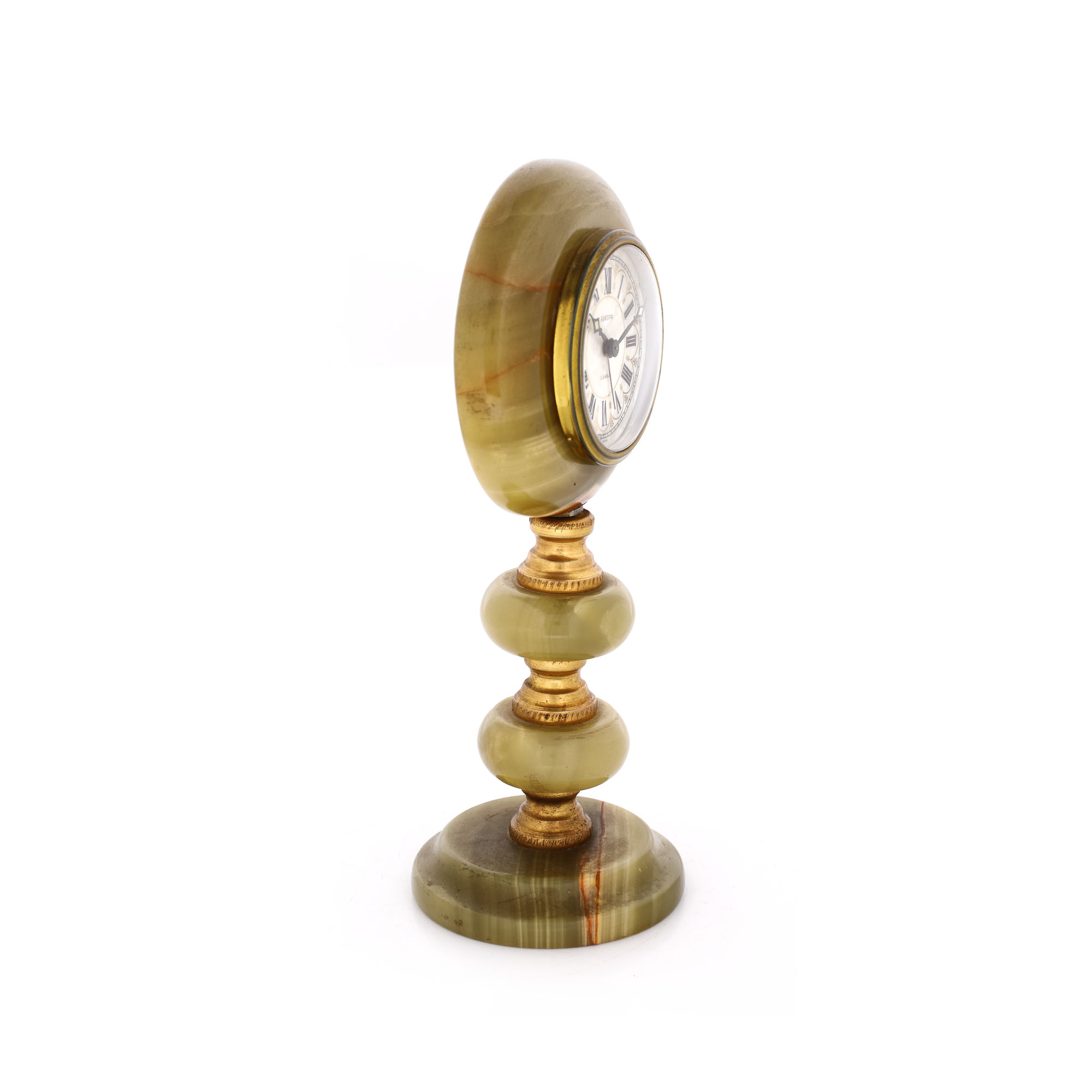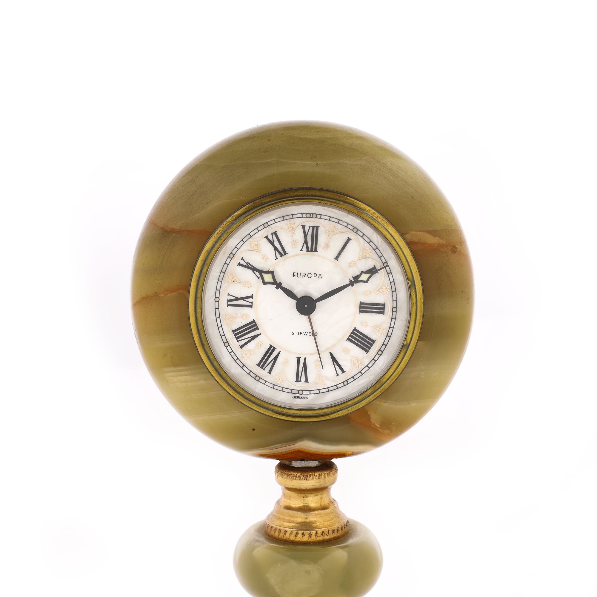 Cadran din sidef, montat în suport din onix, cu picior sfere și bază circulară. Mecanismul necesită revizie.