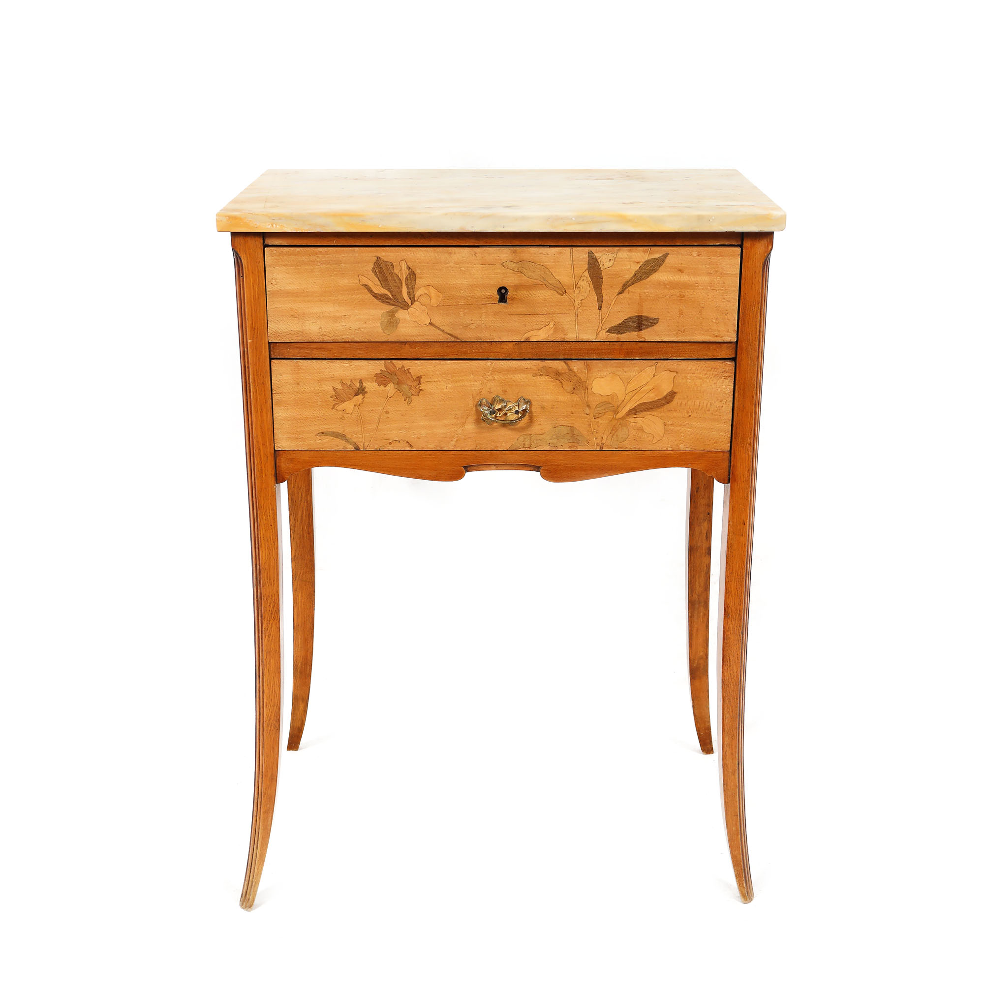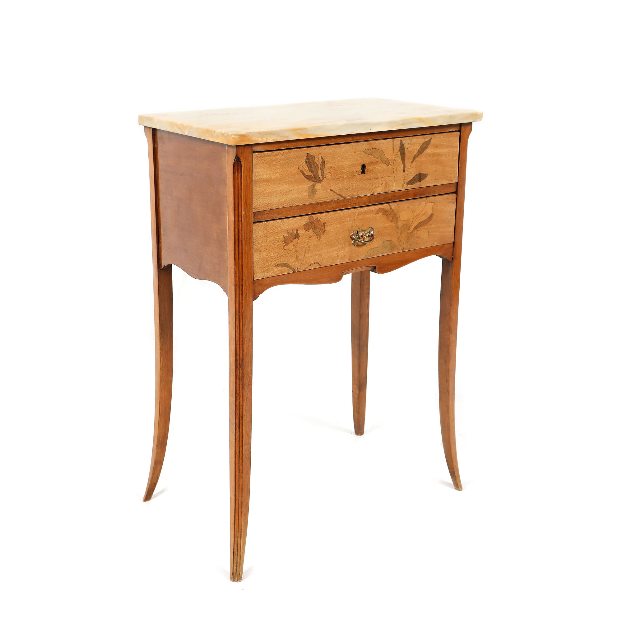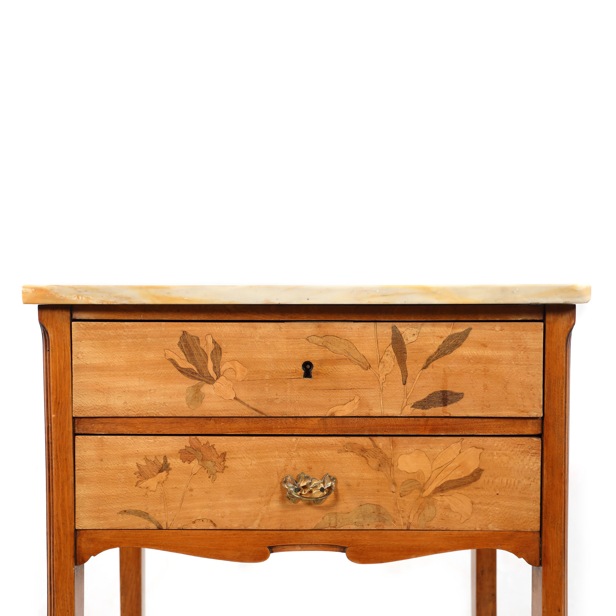 Comoda mica, cu 2 sertare cu decor floral, marchetat, și blat din marmură. Stil Art Nouveau, manieră Gallé.