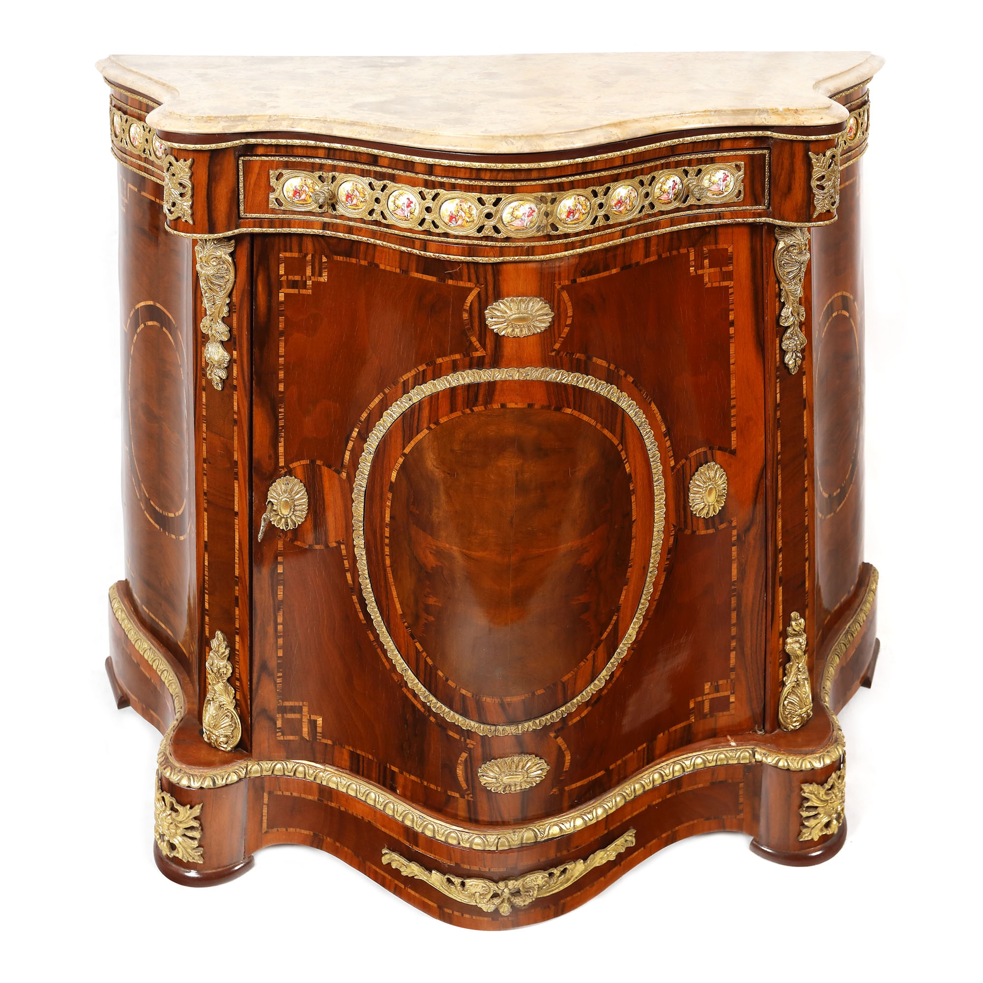 Cabinet „en arbalète” pe picioare mărunte cu ușă mare, cu decor cartușe marchetate și aplicații de bronz, montanți cu ornamente bogate din bronz (rocailles), centură decorată cu medalione pictate cu scene galante; blat detașabil din stucomarmură.
