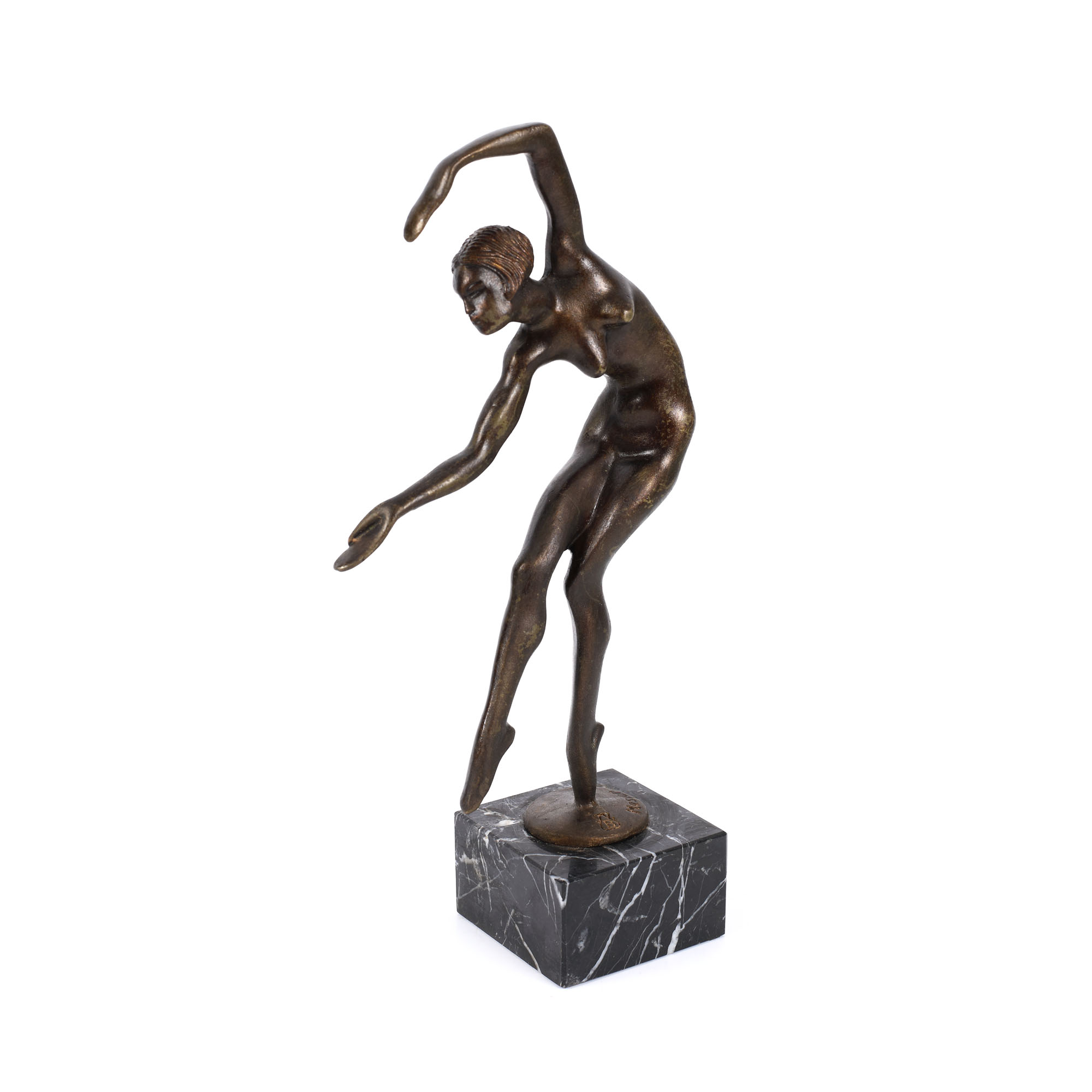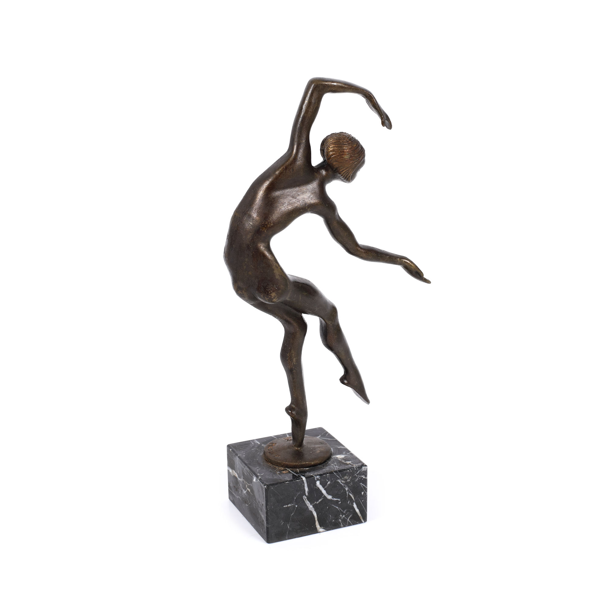 Nud feminin, în poziție dinamică, din bronz, pe soclu din marmură. Stil Art Deco.