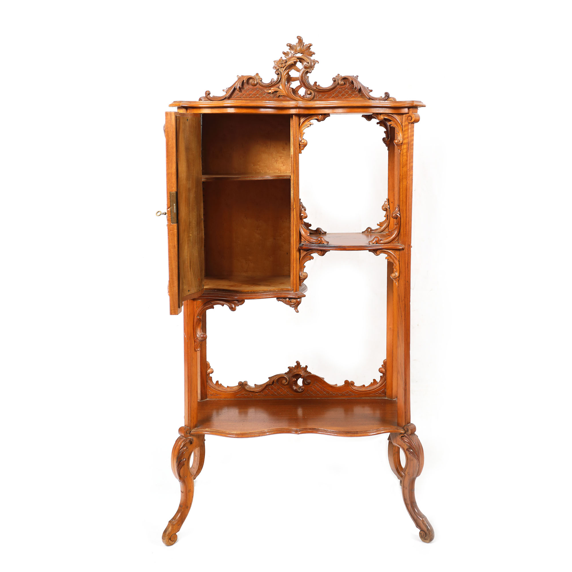 Etajeră pe picioare scurte galbate, unite prin etajere și dulăpior cu ușă. Pe ușă pictură campestră în medalion rocaille. Fronton motiv vegetal Rocaille.
