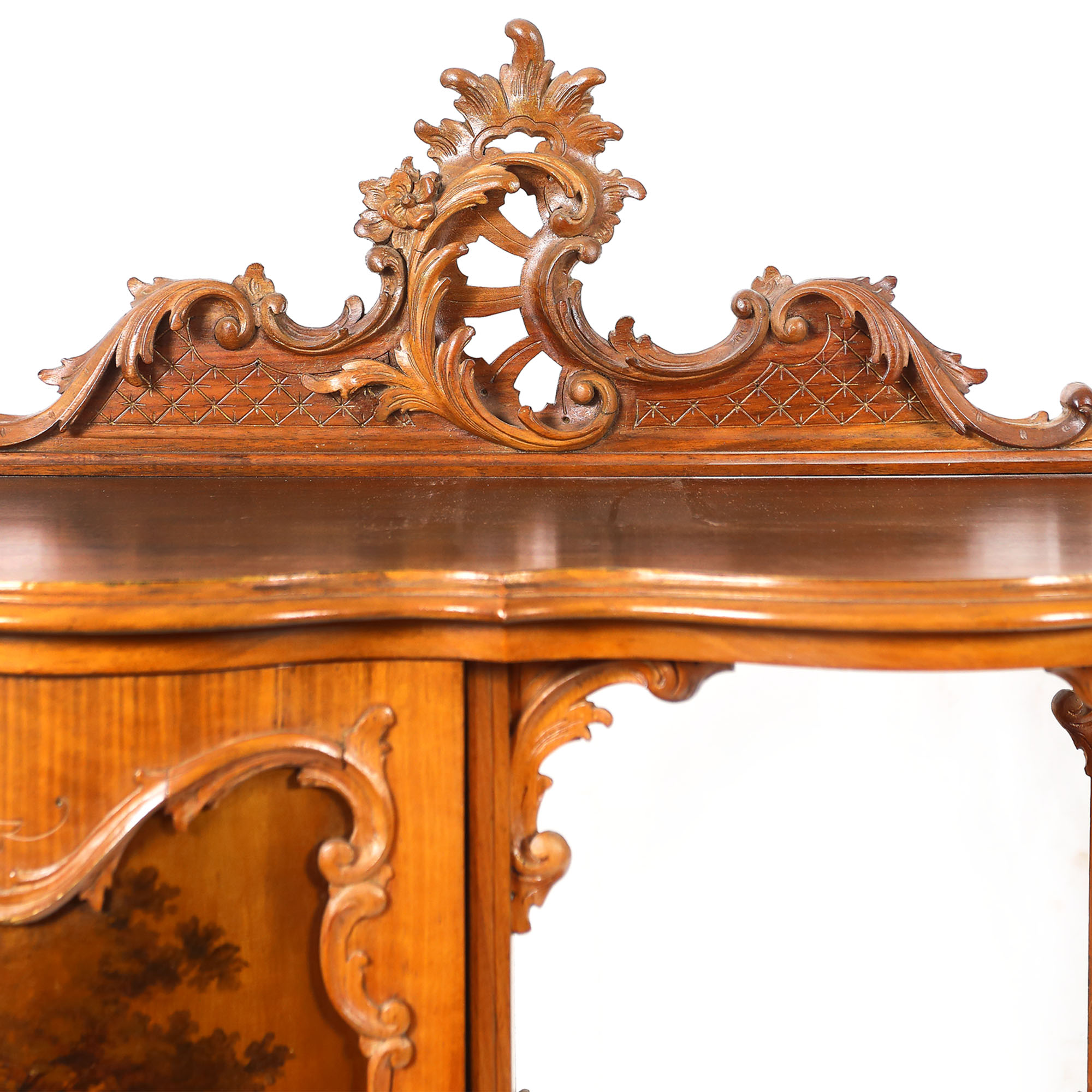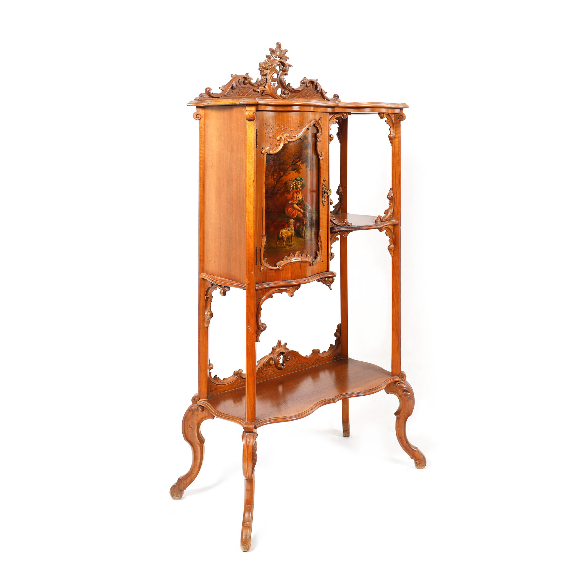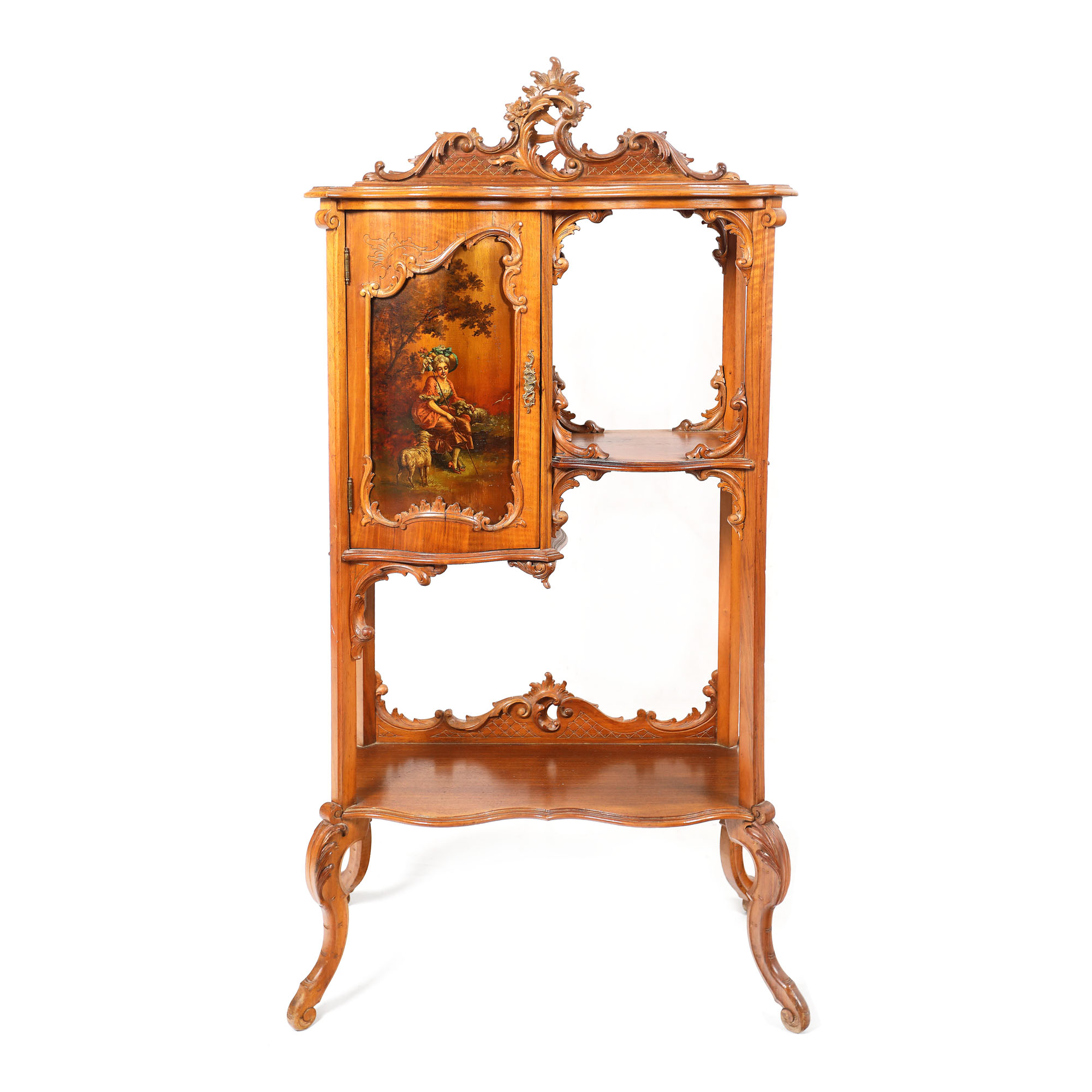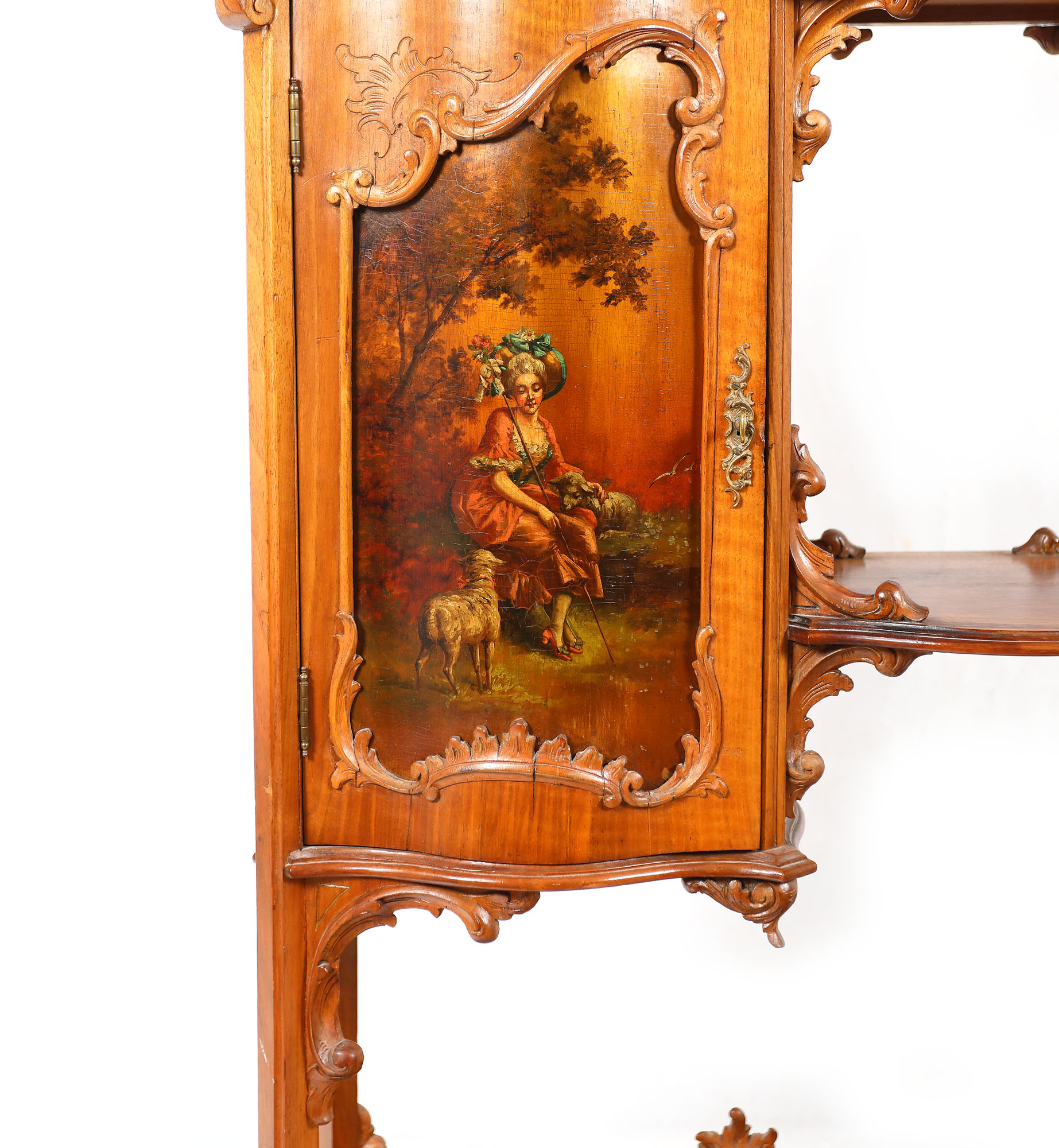 84. Etajeră Neo-Rococo din lemn de mahon sculptat, decorată cu panou pictat manual, ilustrând o scenă bucolică, sfârșitul sec. XIX