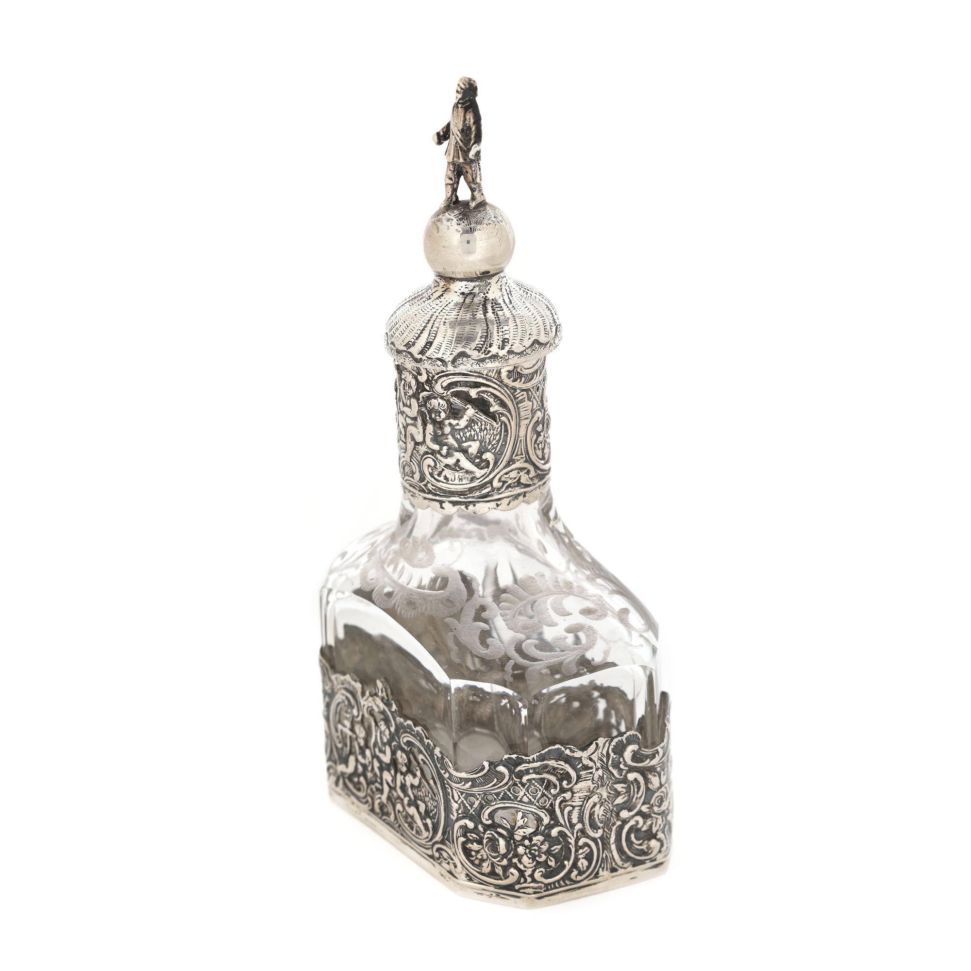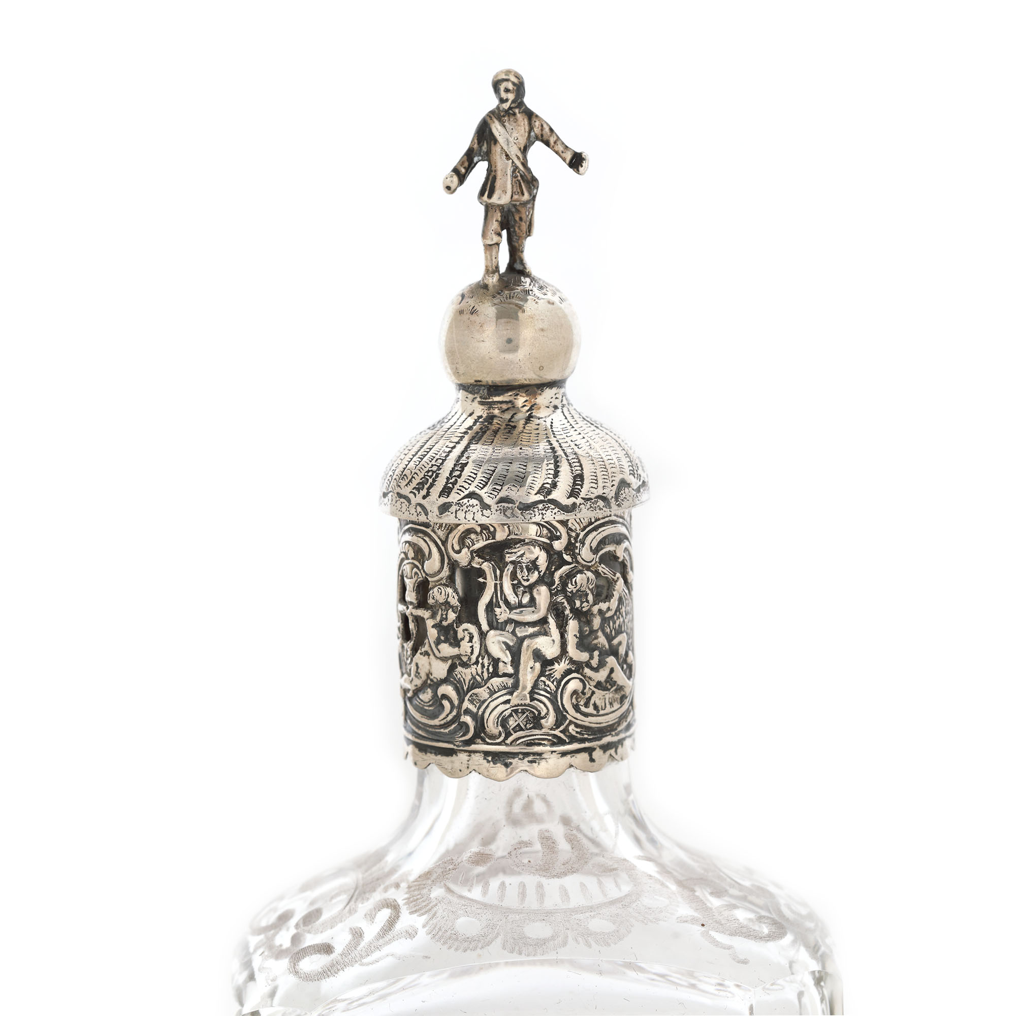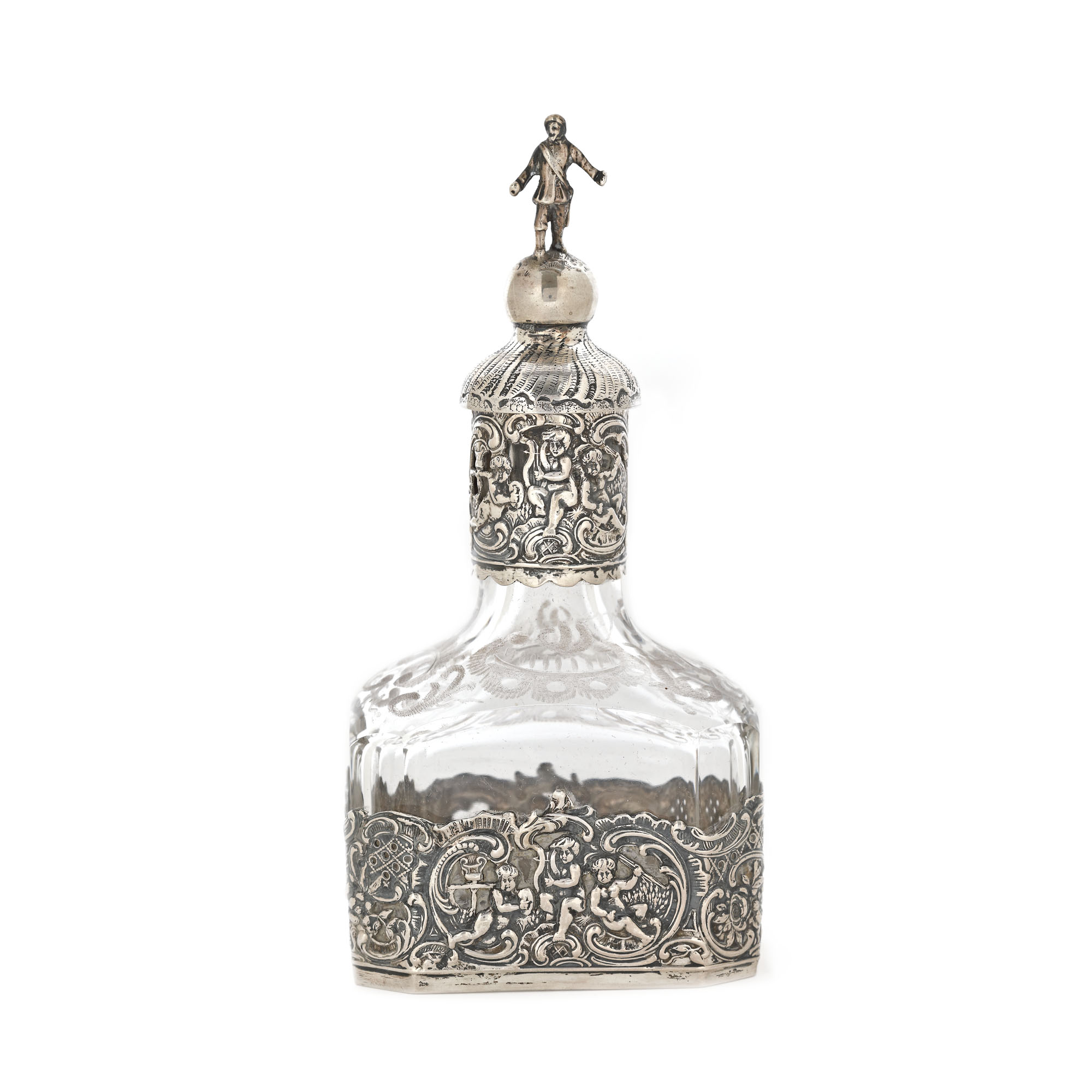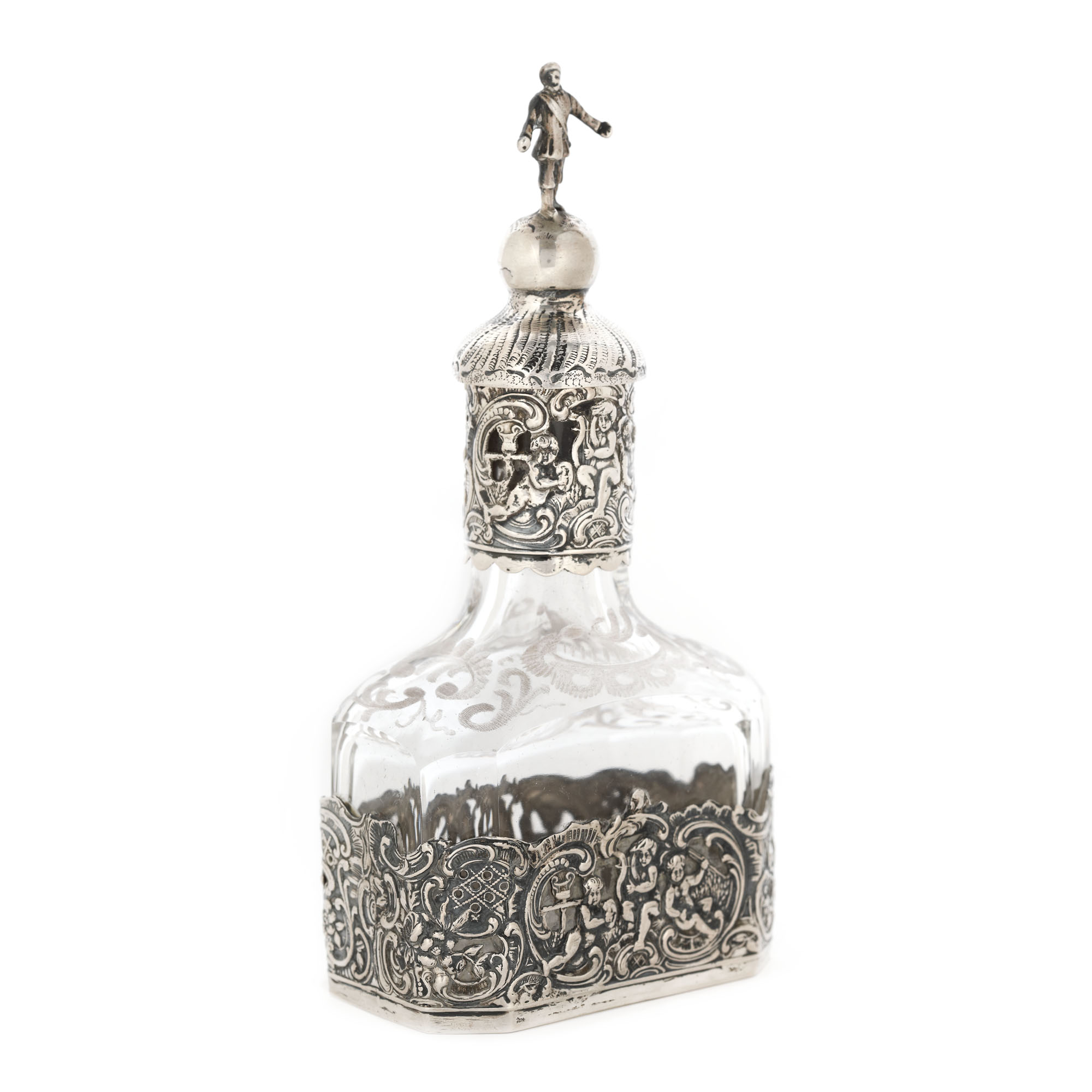 Flacon cu bază dreptunghiulară, cu corpul din cristal gravat cu motiv vegetal, în manșon din argint, ajurat, cu scenă de gen (putti muzicanți), gât și dop cu același decor din argint. În stil Neo-Rococo. Marcat.