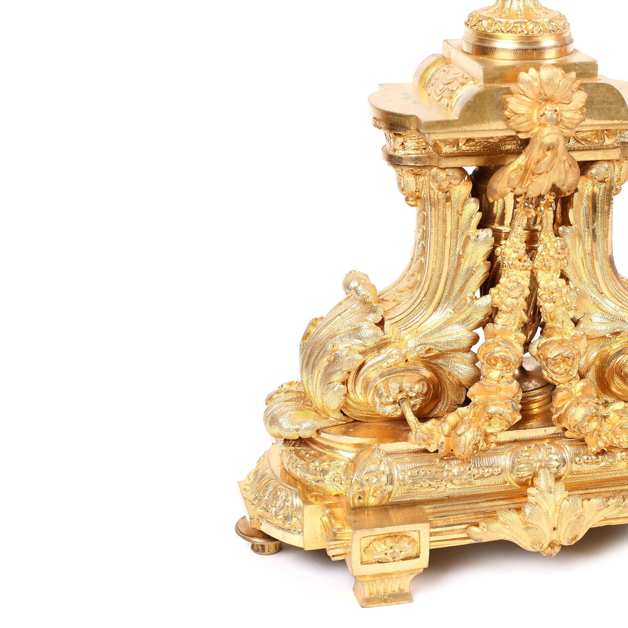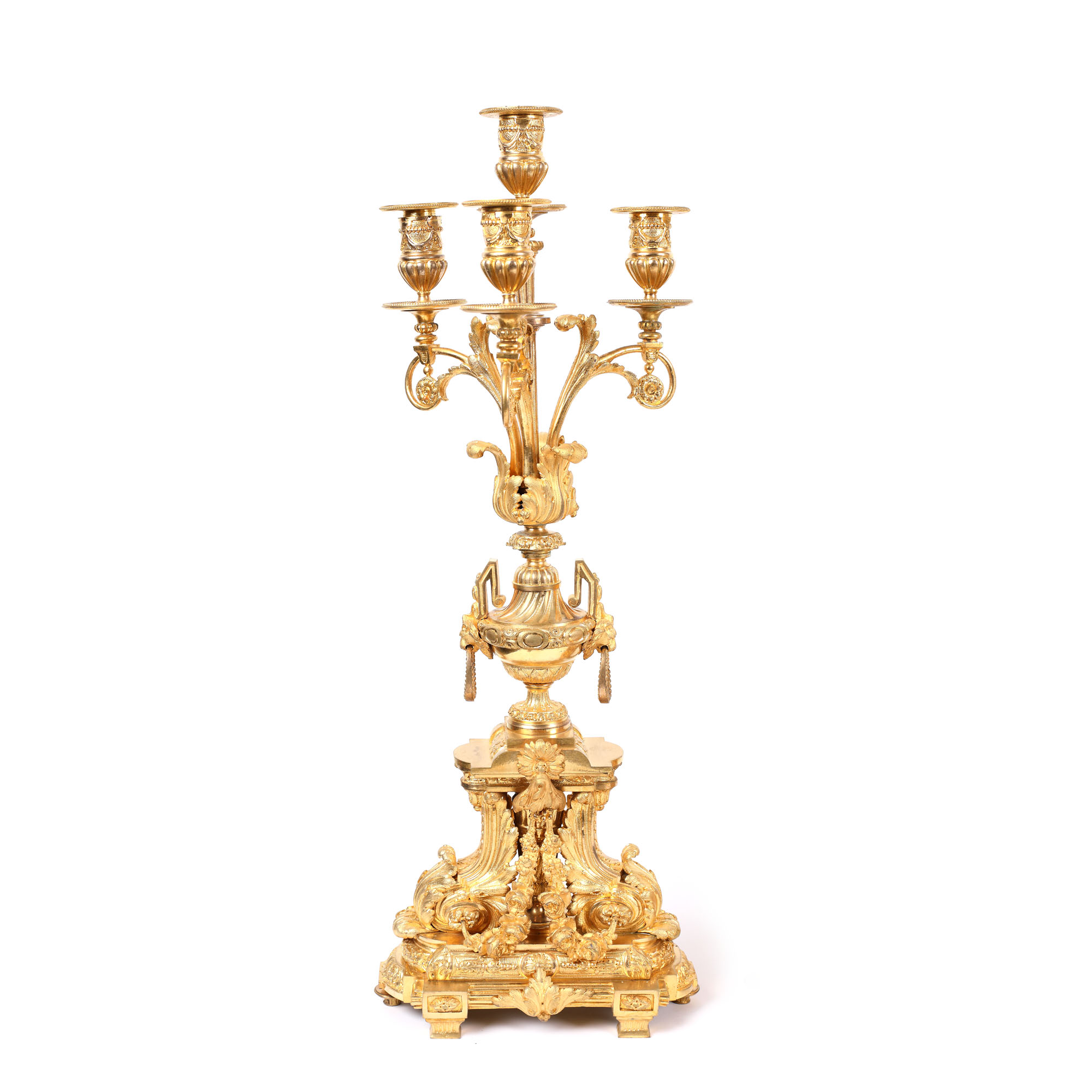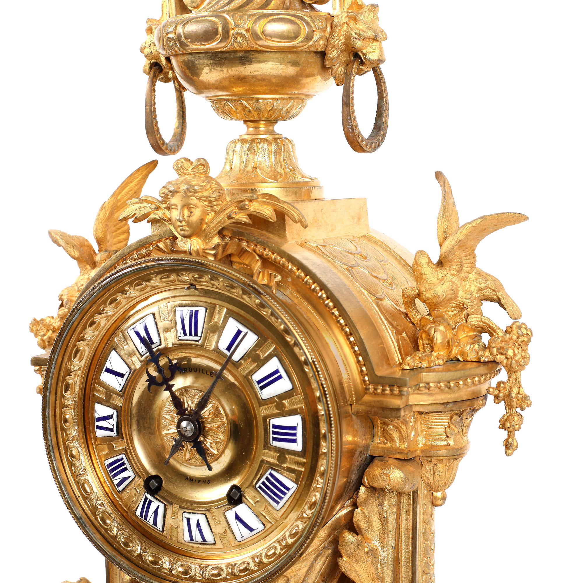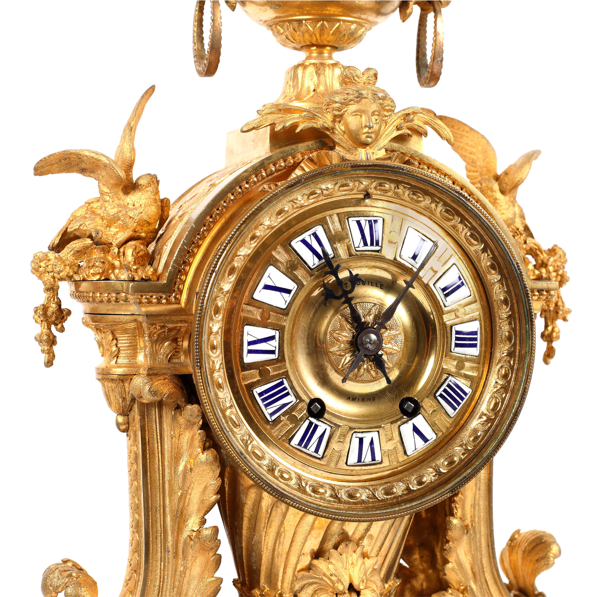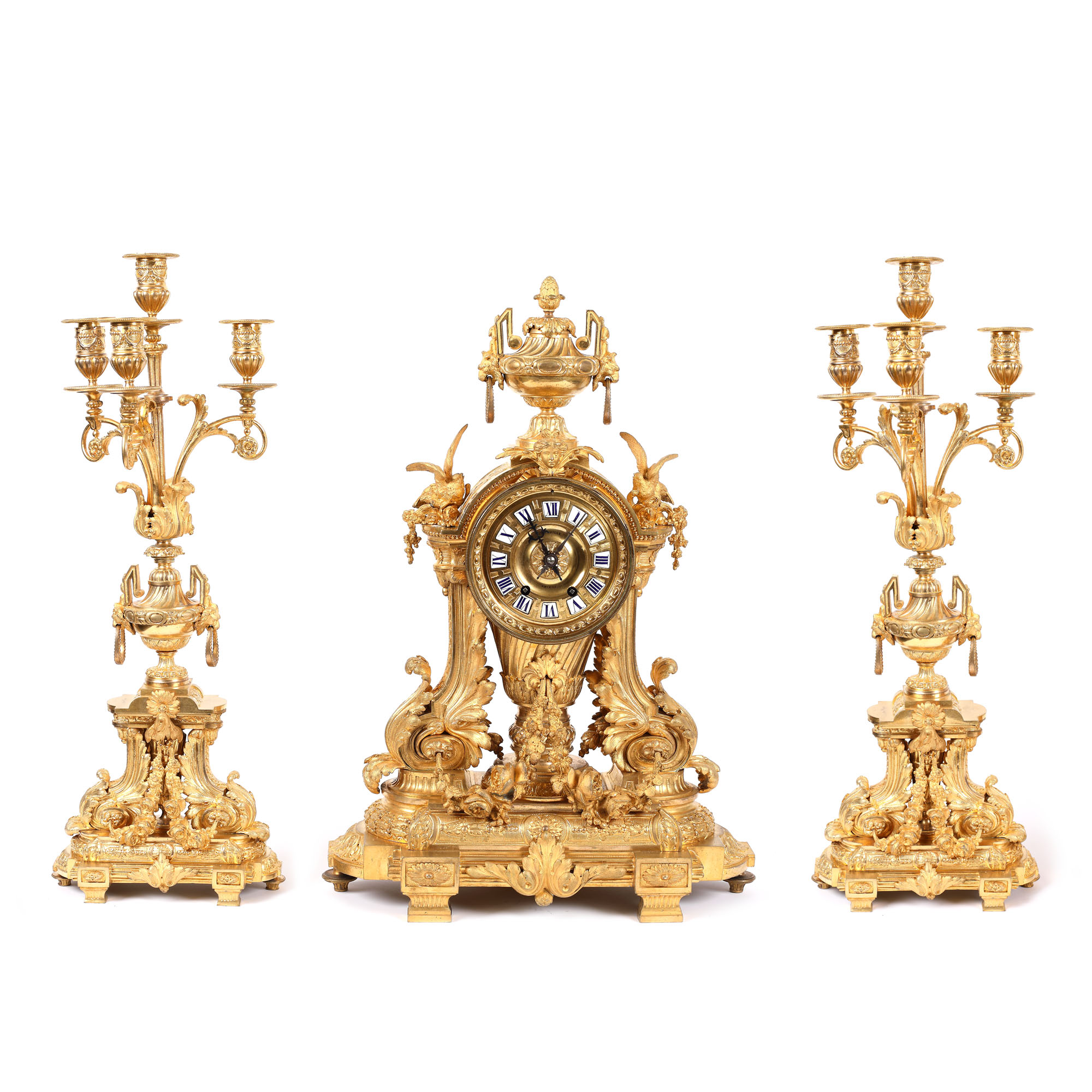 Garnitură monumentală de șemineu formată din ceas și două sfeșnice cu câte 4 lumini, piese bogat decorate cu palmete si rozete, ghirlande floral-vegetale, porumbei, vasce si lei cu anse in gură. Mecanismul necesită revizie.