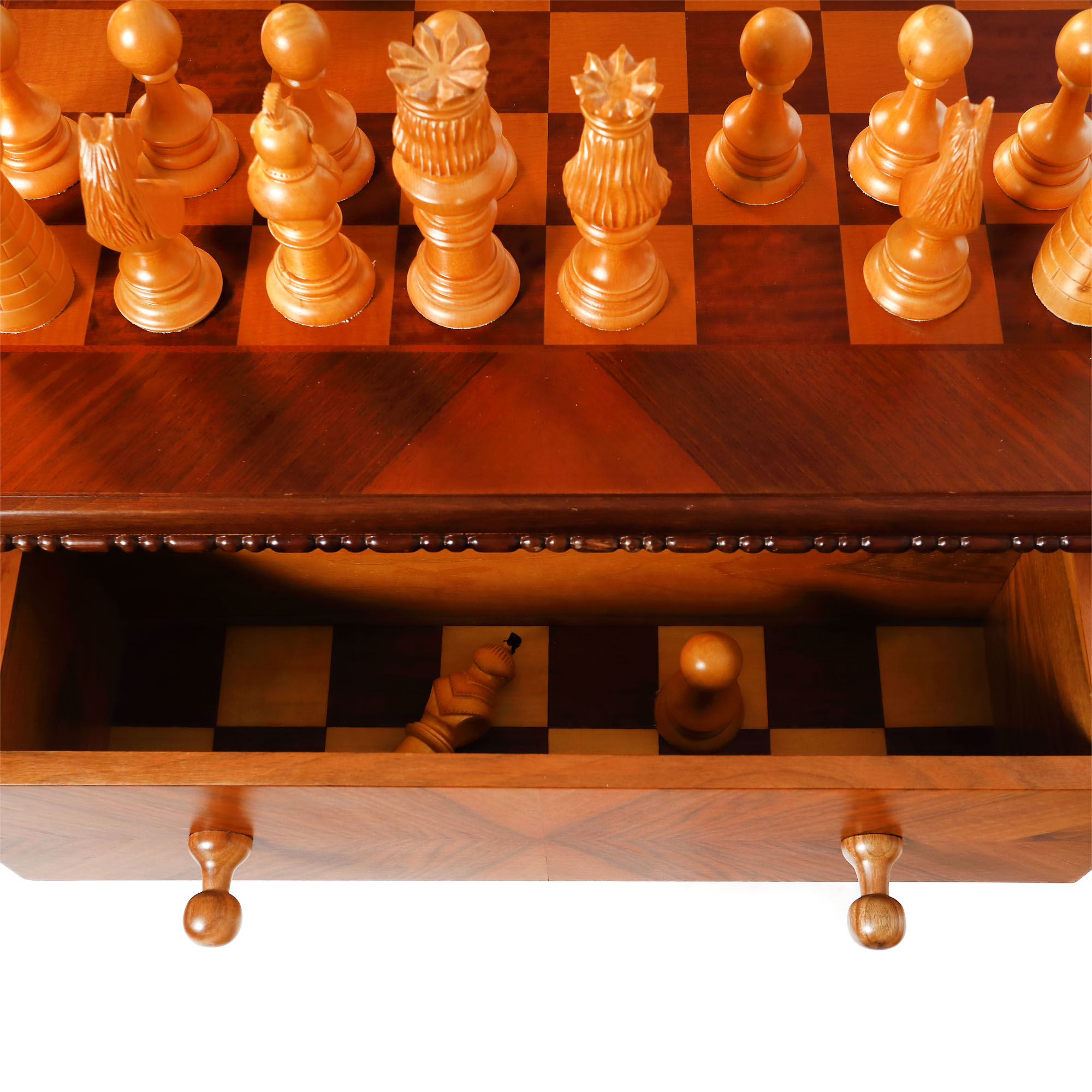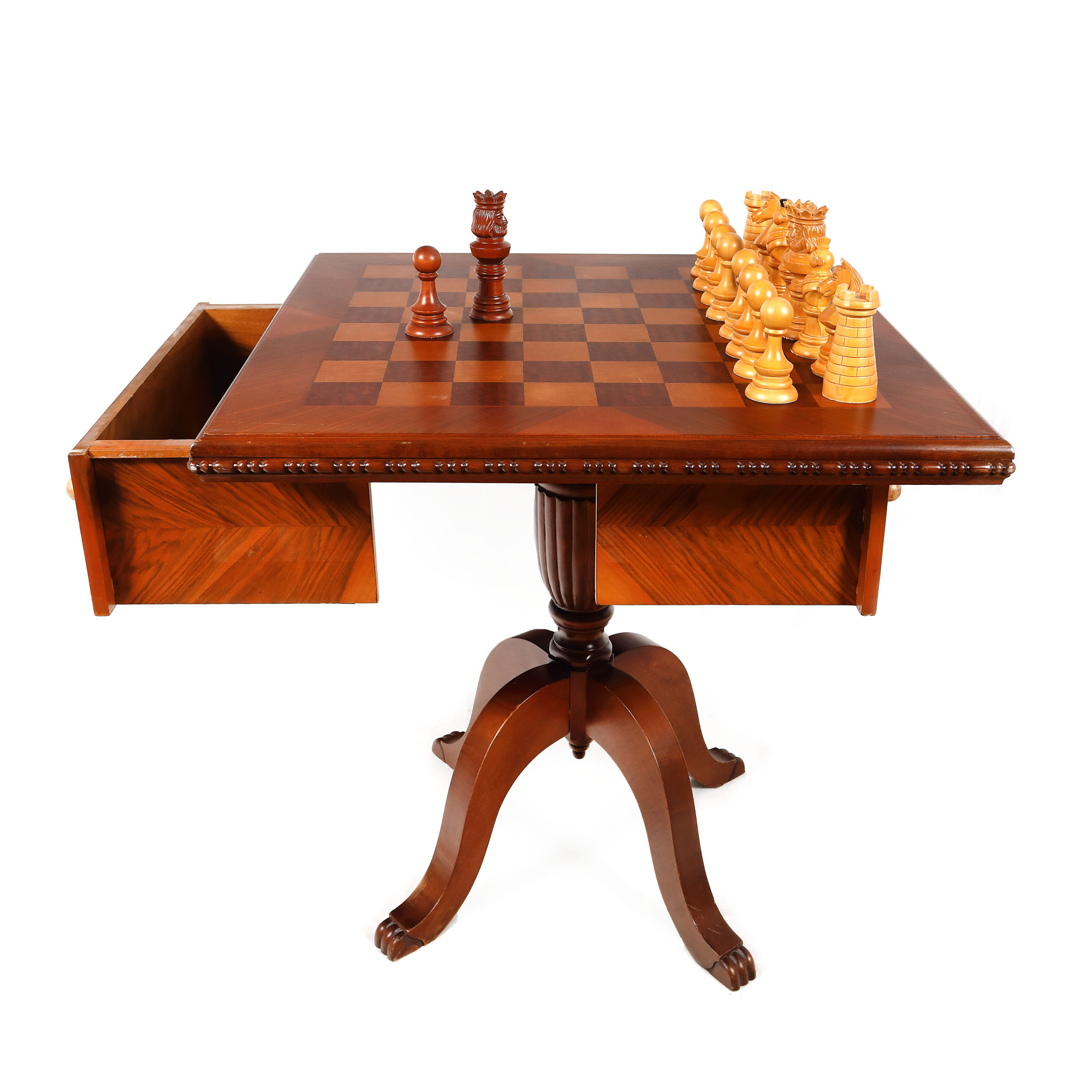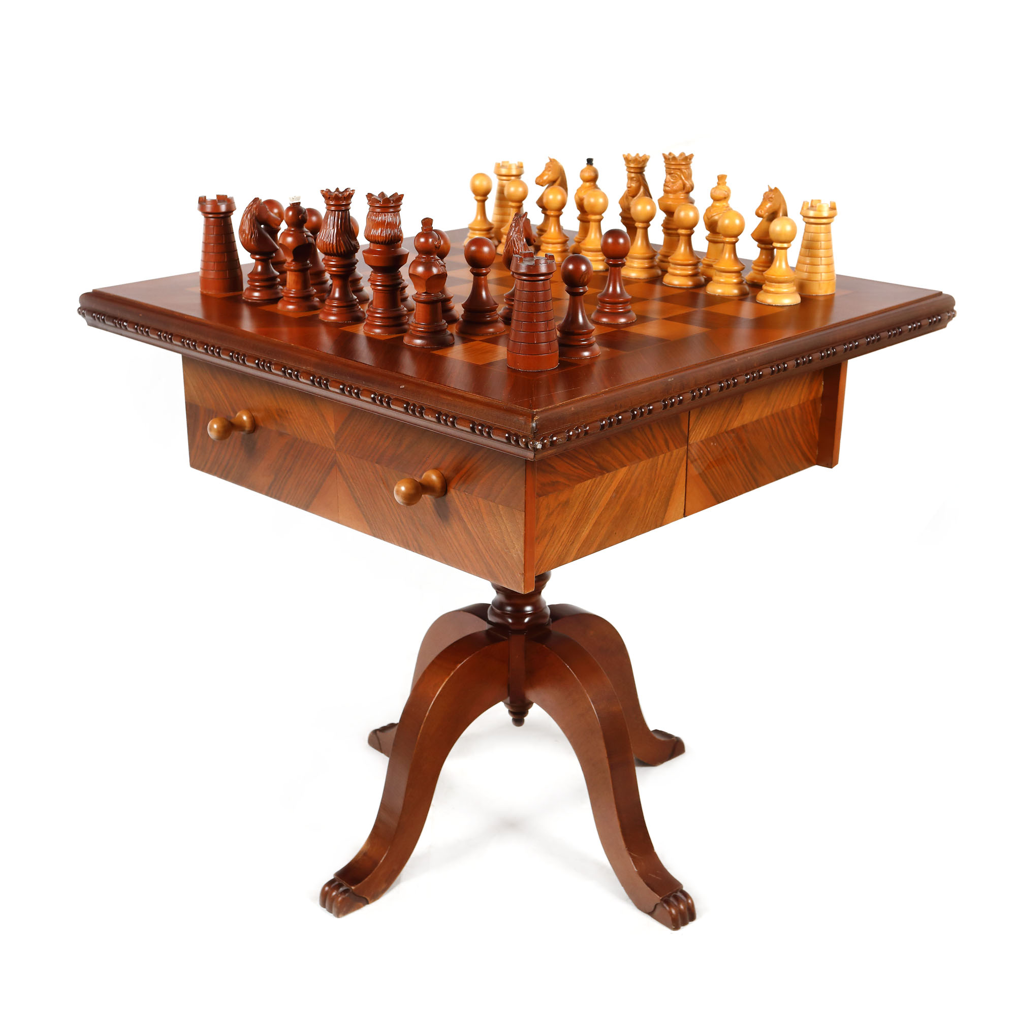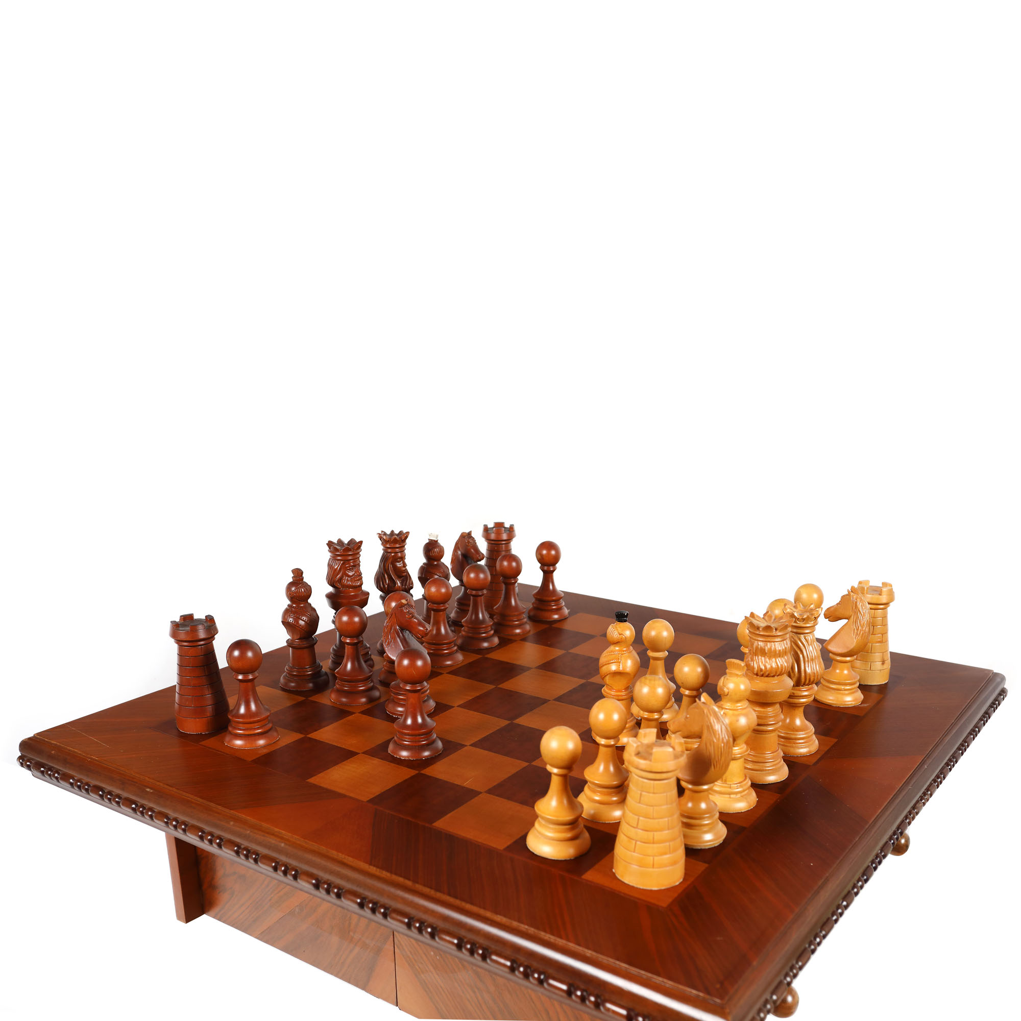Masă de șah, masivă, cu picior balustru, canelat, ramificat în patru tălpici, cu două sertare masive la centură și blat pătrat, cu bordură perlată. Cu picior de rezervă. Din colecția Nicolae Ceaușescu. Certificat APPS.