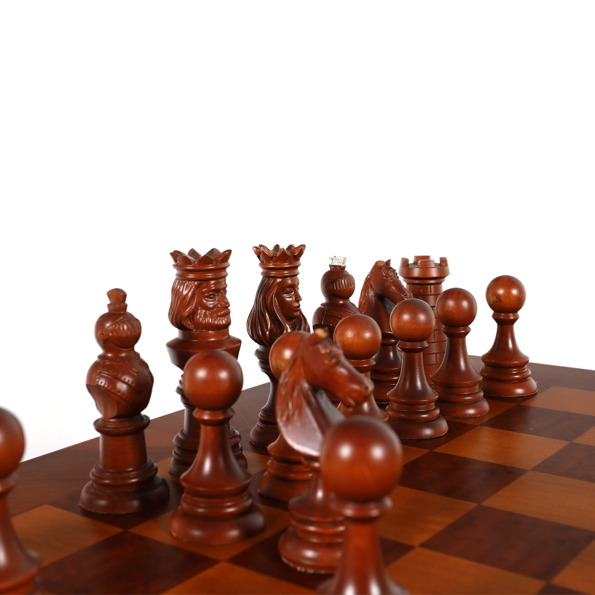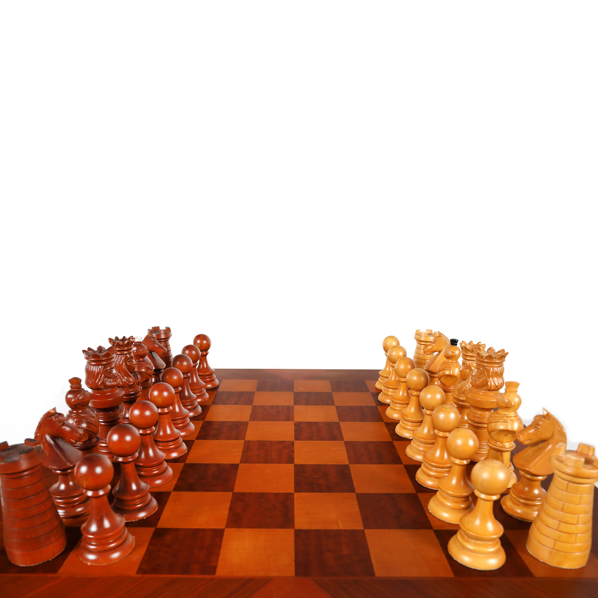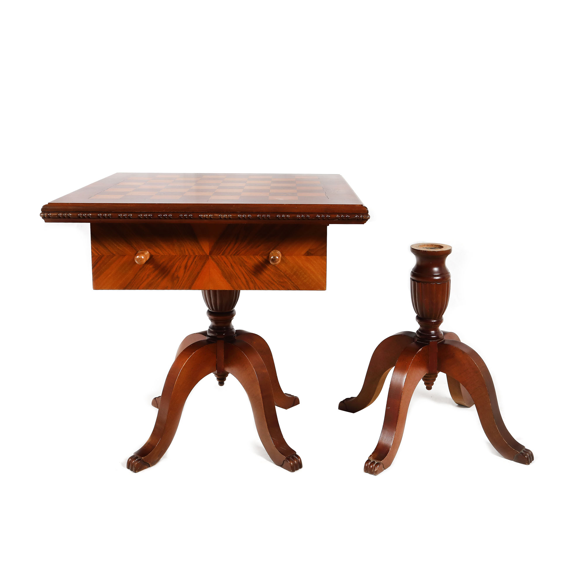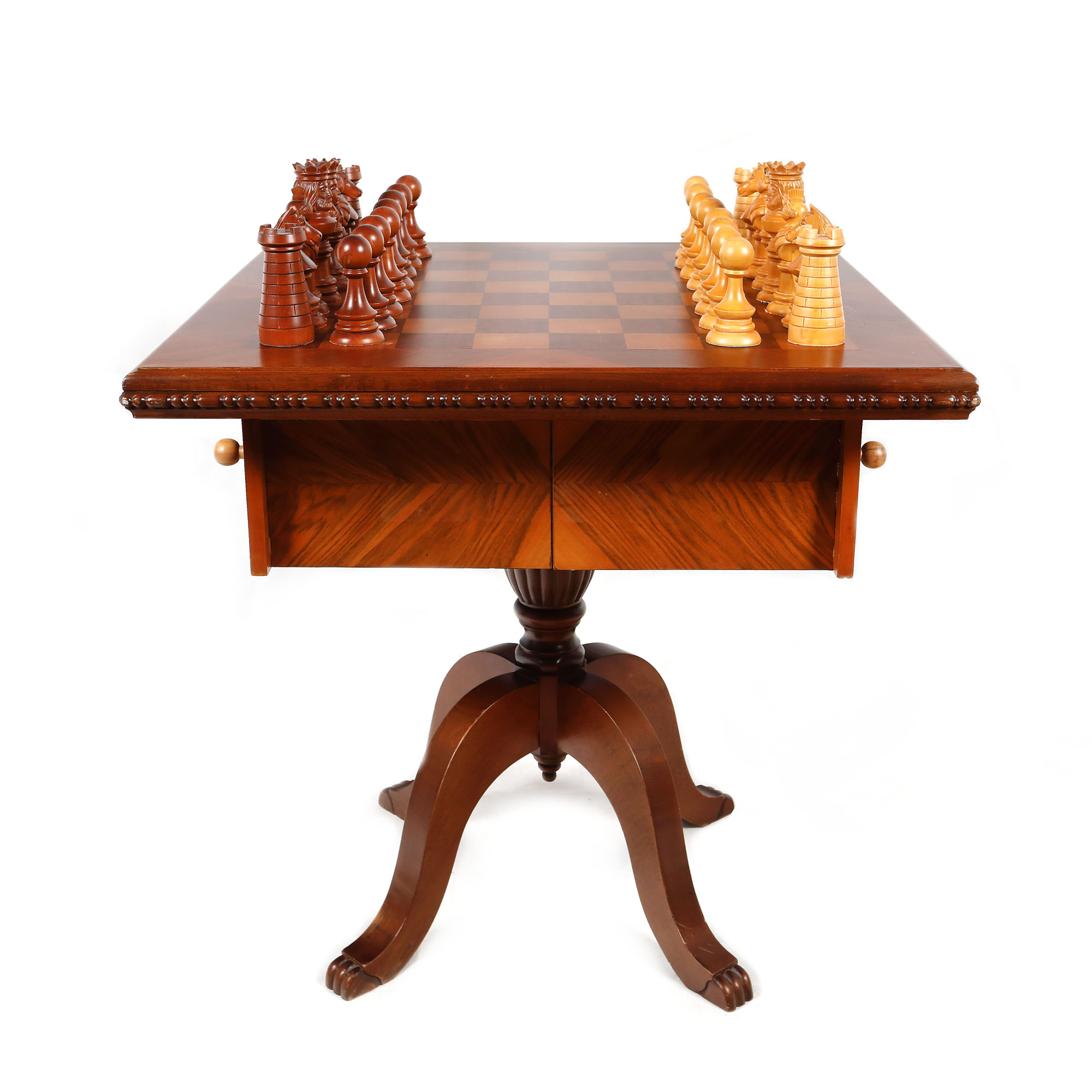 Masă de șah, masivă, cu picior balustru, canelat, ramificat în patru tălpici, cu două sertare masive la centură și blat pătrat, cu bordură perlată. Cu picior de rezervă. Din colecția Nicolae Ceaușescu. Certificat APPS.