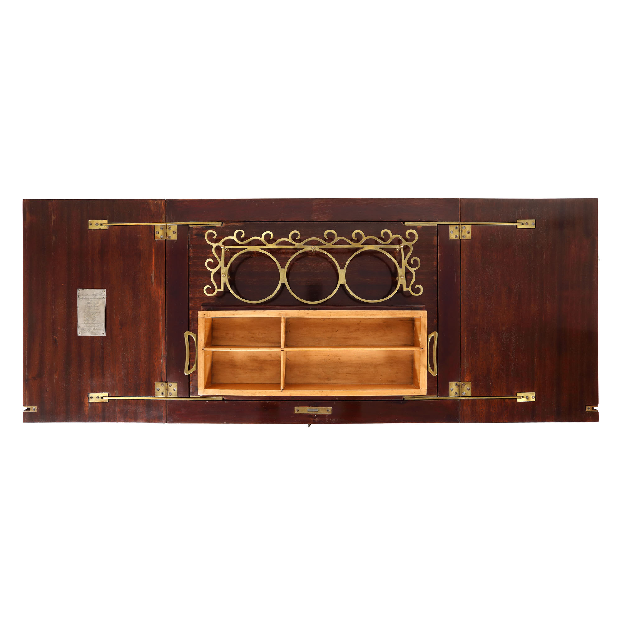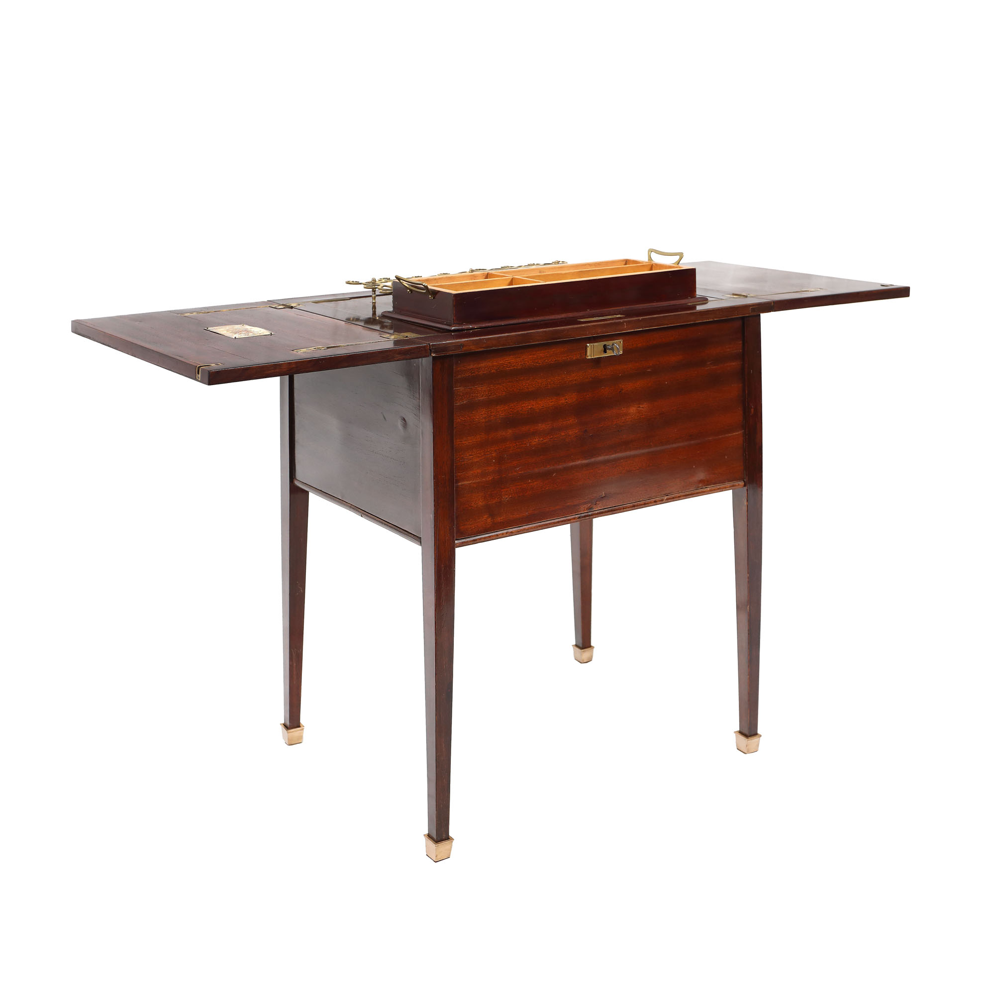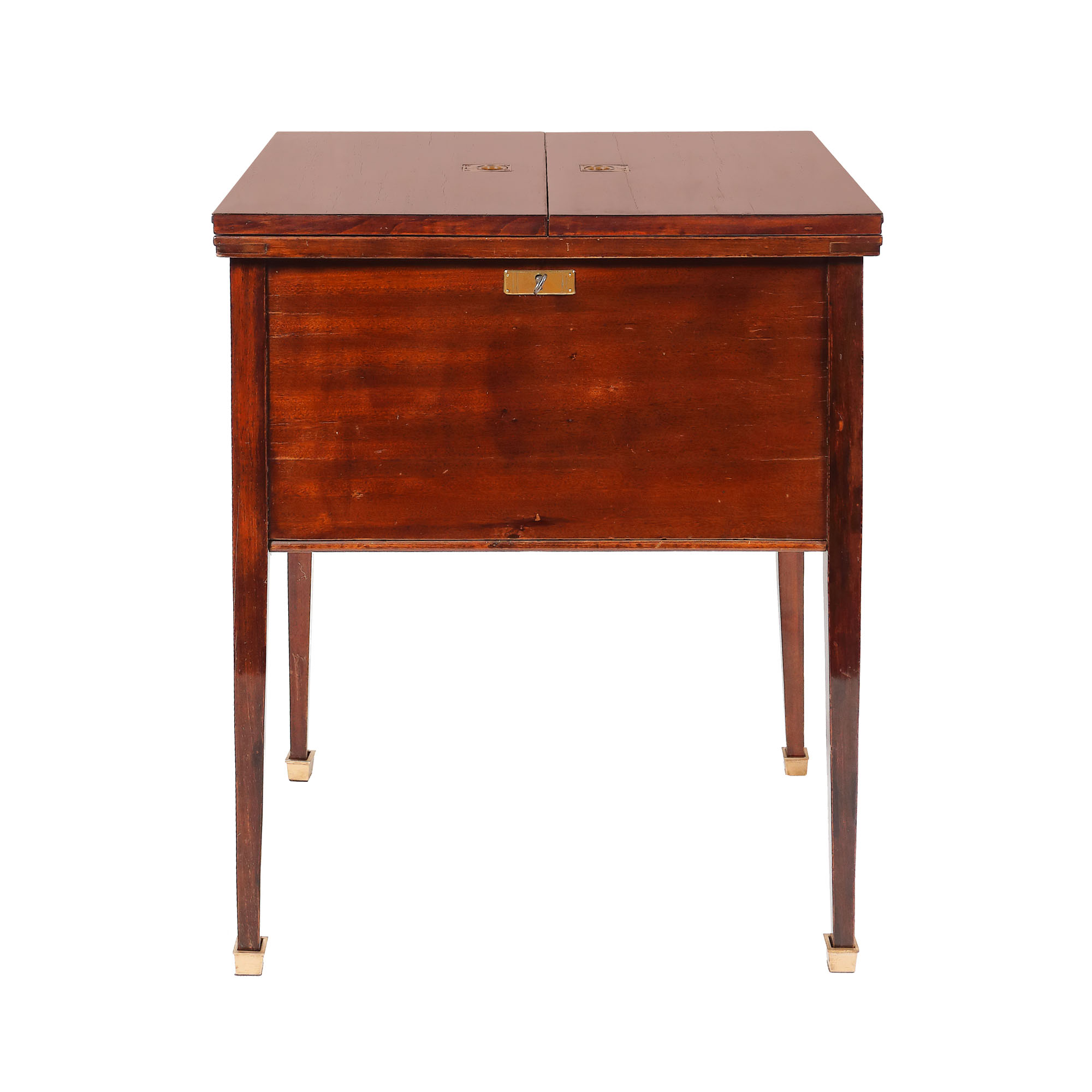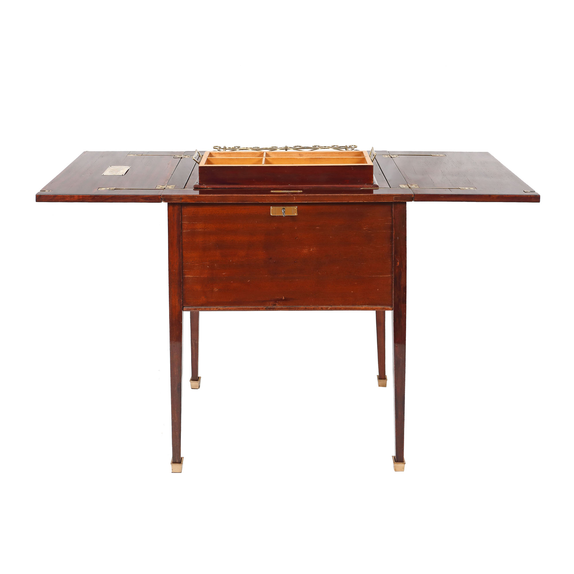 Masă pe picioare drepte, cu saboți din aluminiu, blat cu aripi rabatabile, conținând cutie compartimentată din lemn, anse și suporturi din bronz. Inscripție dedicatorie în limba maghiară: "Cu sincere, amicale și iubite felicitări, Alba Iulia - 11 noiembrie 1909", urmată de numirea prietenilor care avansează felicitările către sărbătorit.