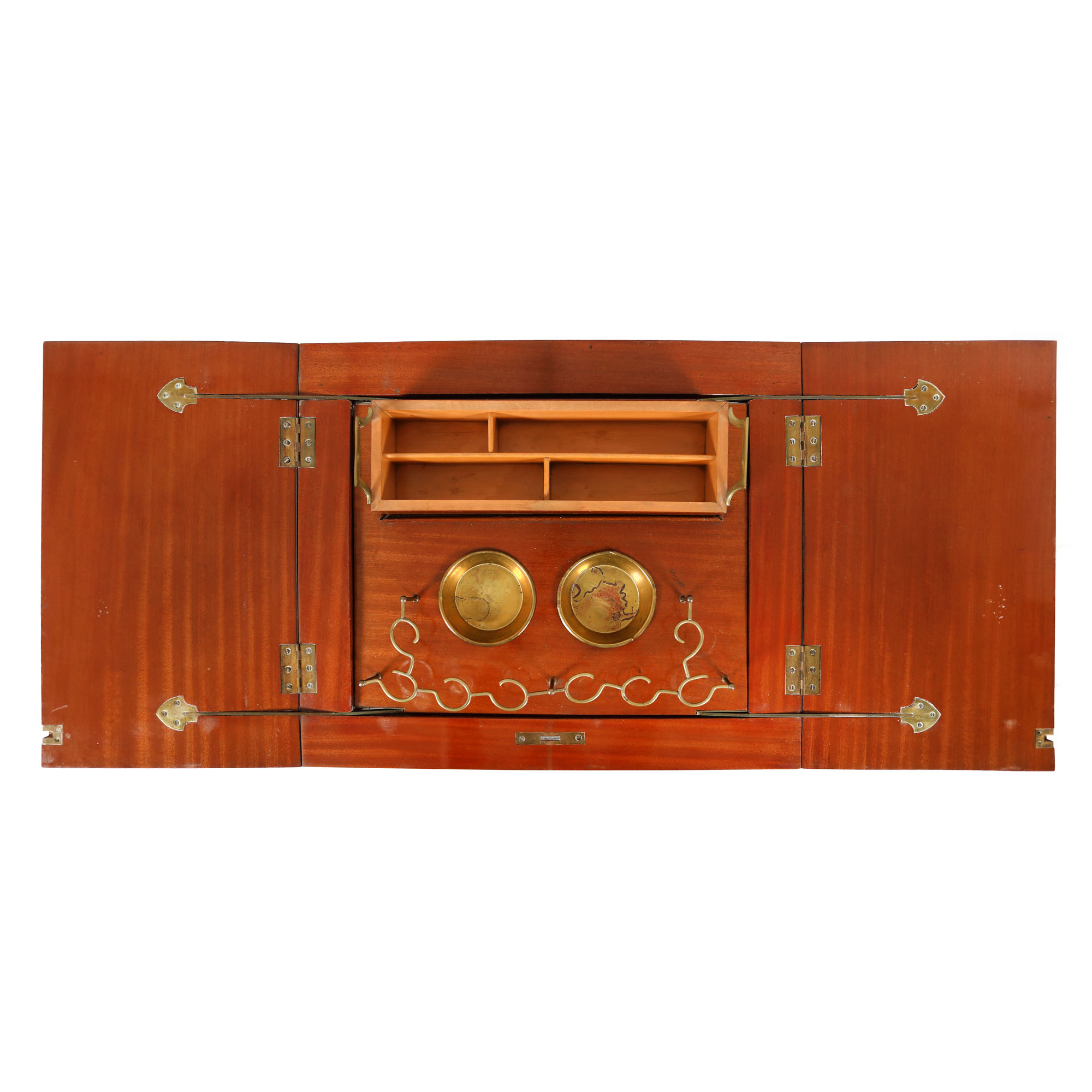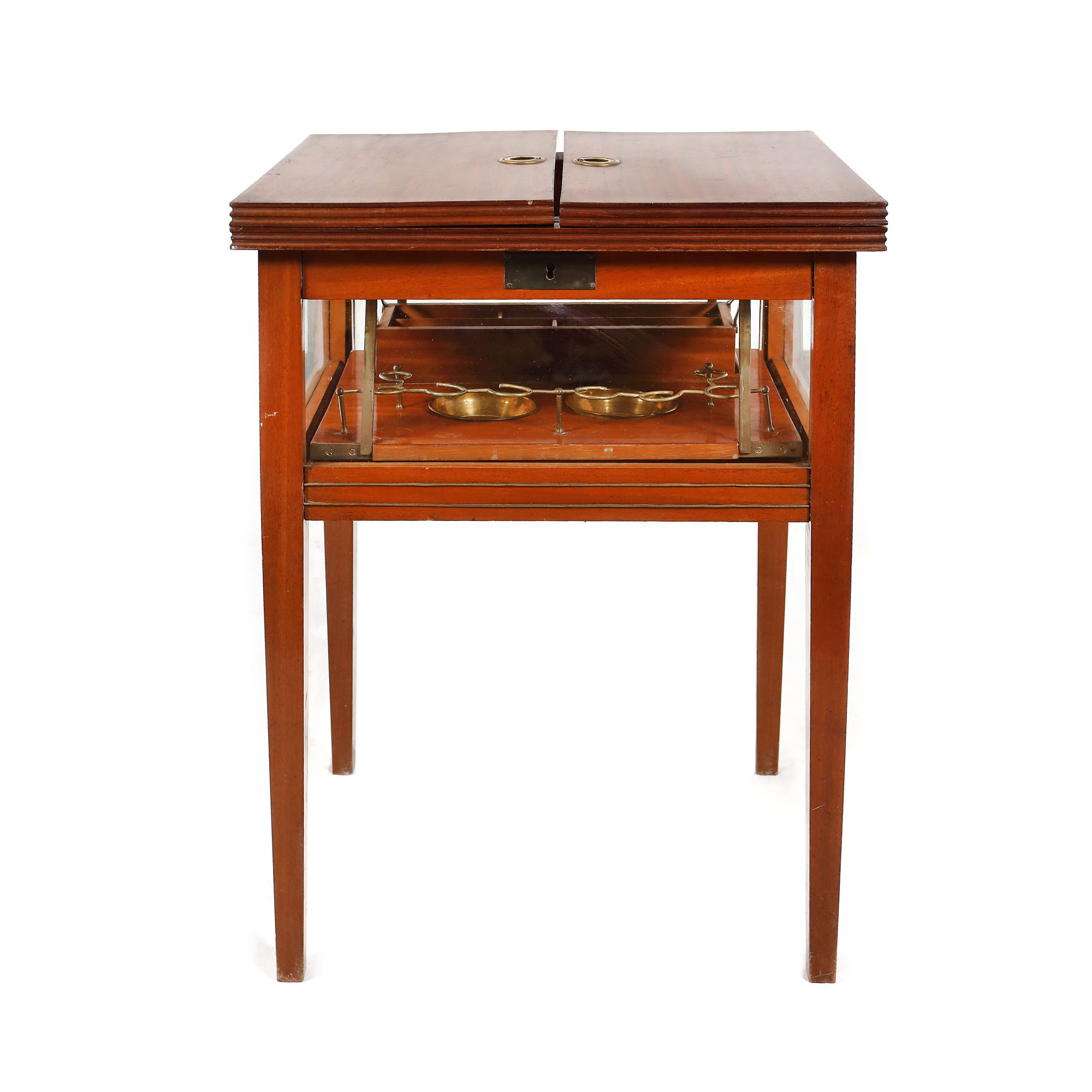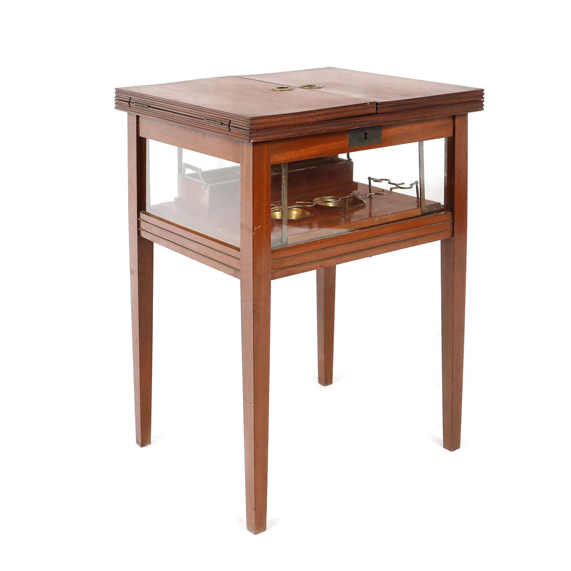 lemn de mahon, strunjit, furniruit; alamă; sticlă