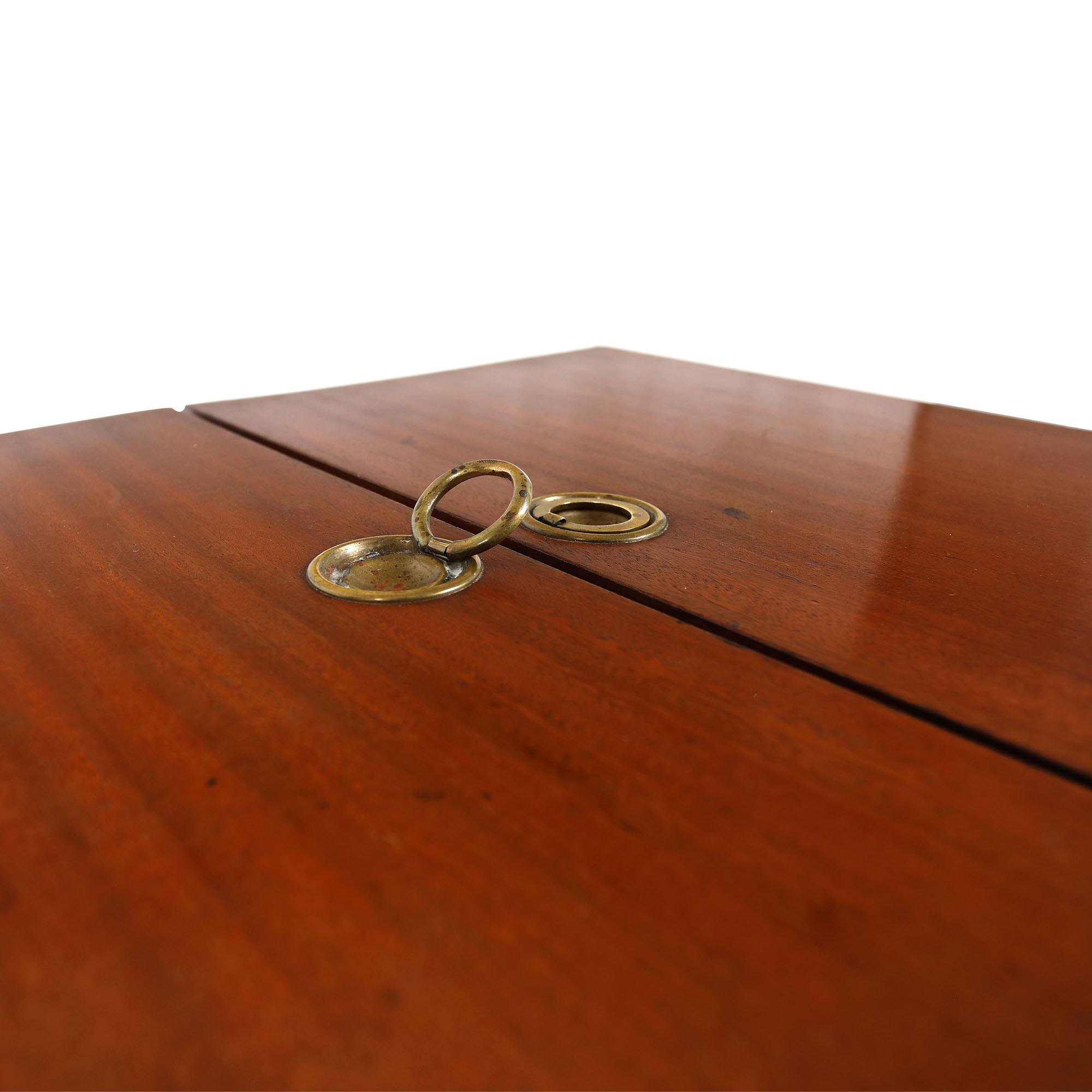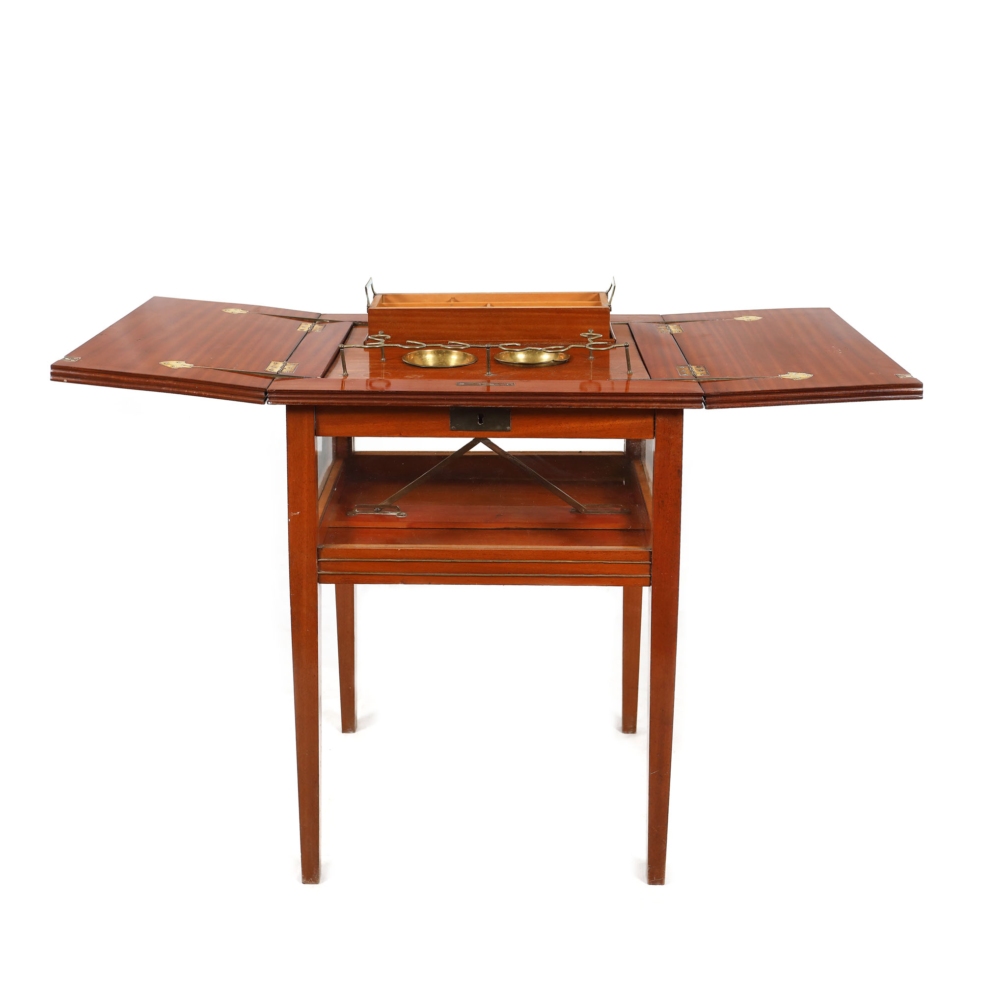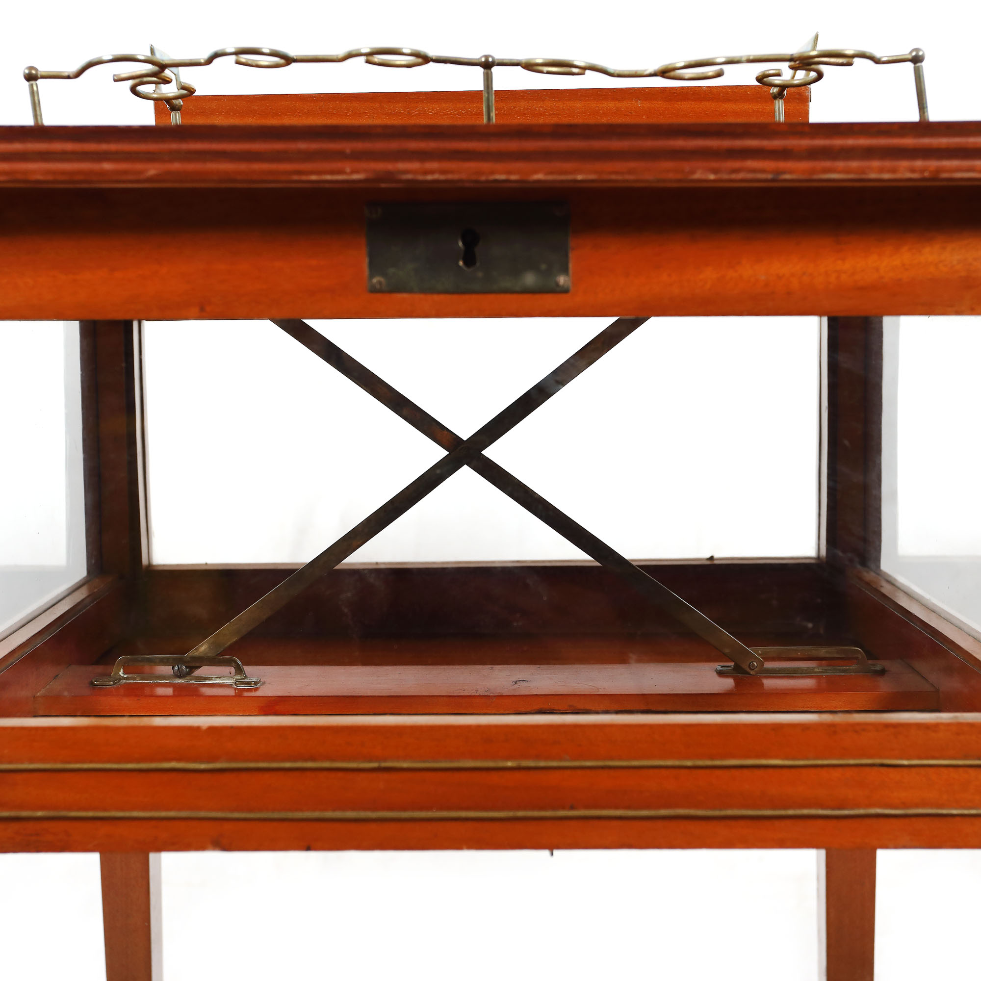 Măsuță de club cu centura lată din sticlă (vitrină), blat dreptunghiular, cu panouri rabatabile și interior compartimentat.