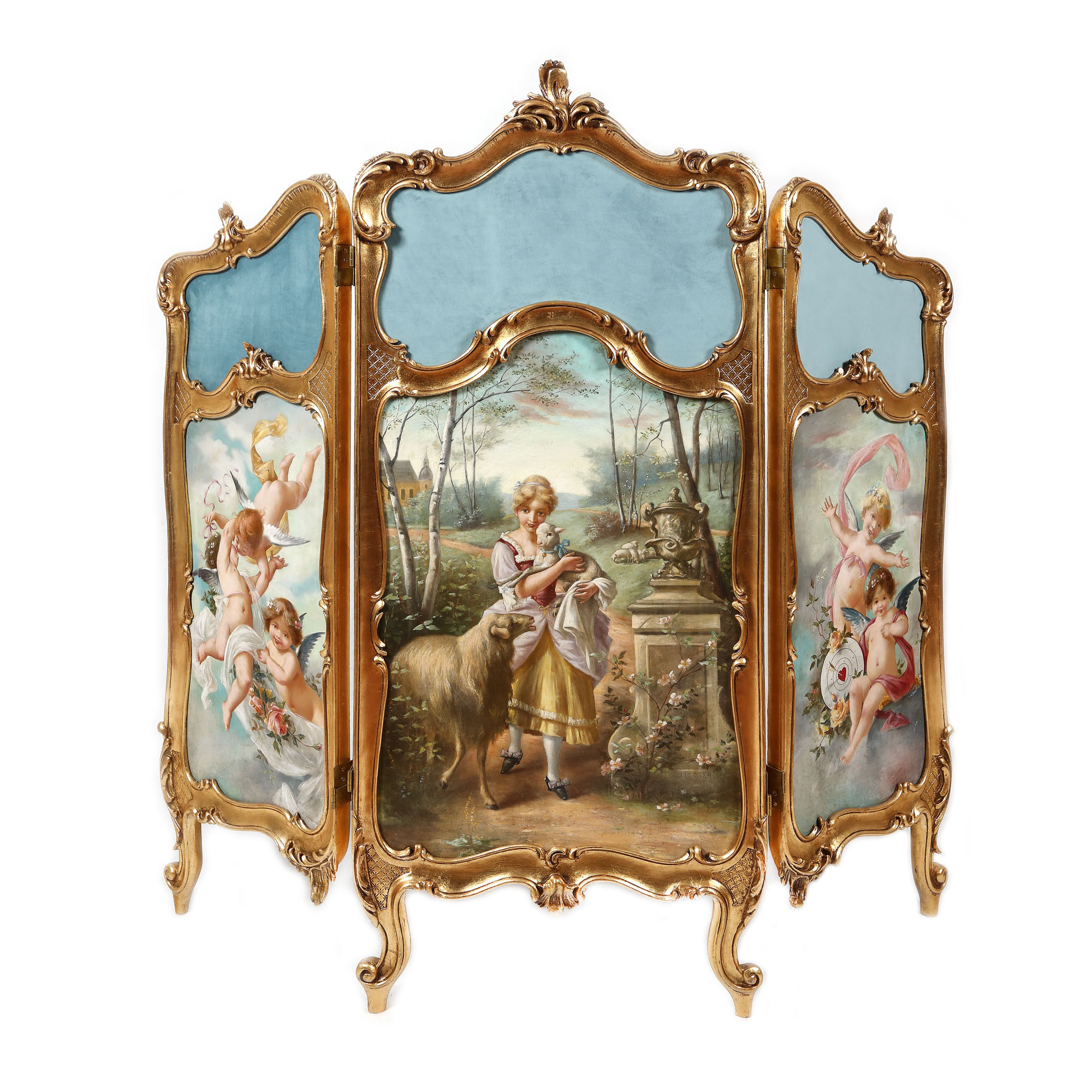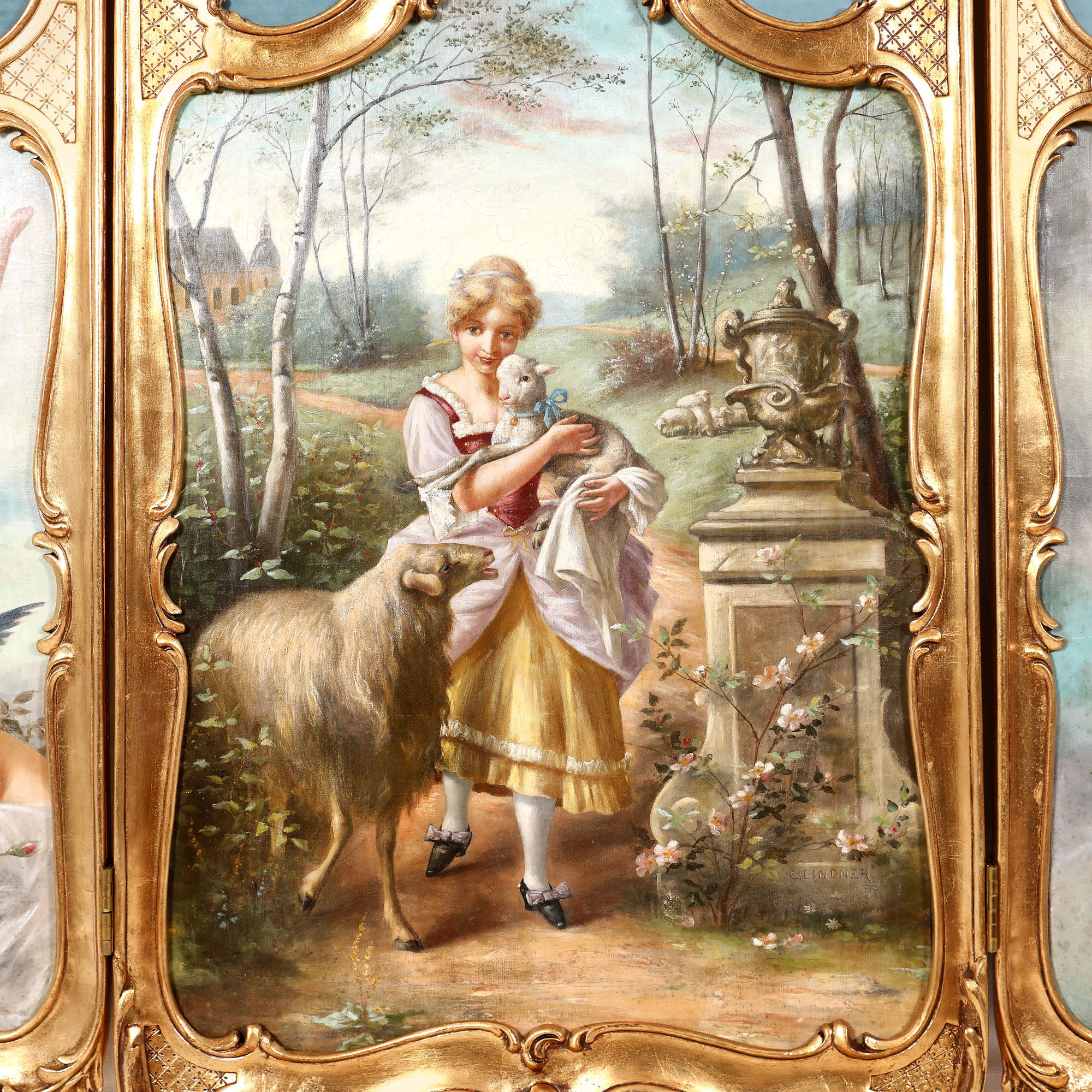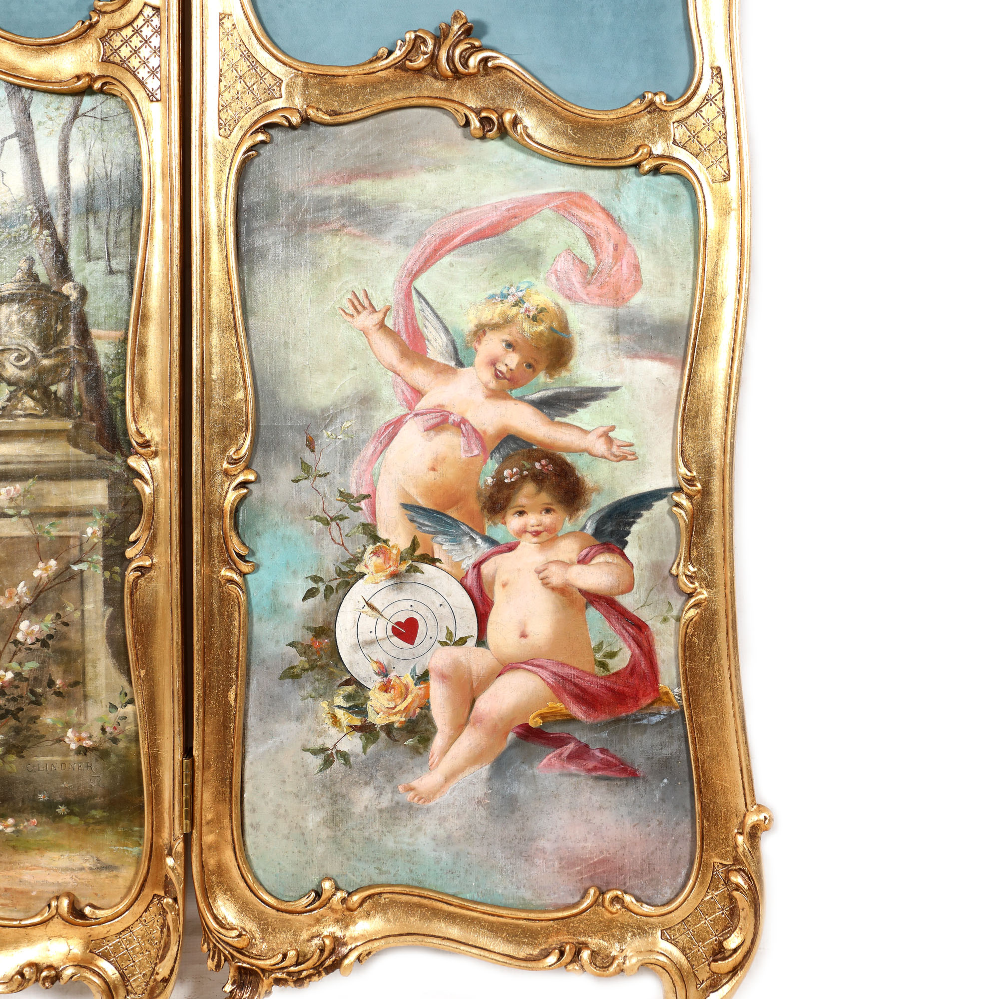 Panou decorativ tip paravan, format din trei foi, rame rocaille cu panouri inferioare având pânze încastrate, semnate „C. Lindner”, datate 1797, reprezentând central scenă campestră, iar lateral grupuri de cupidoni. Pictură de factură academistă.