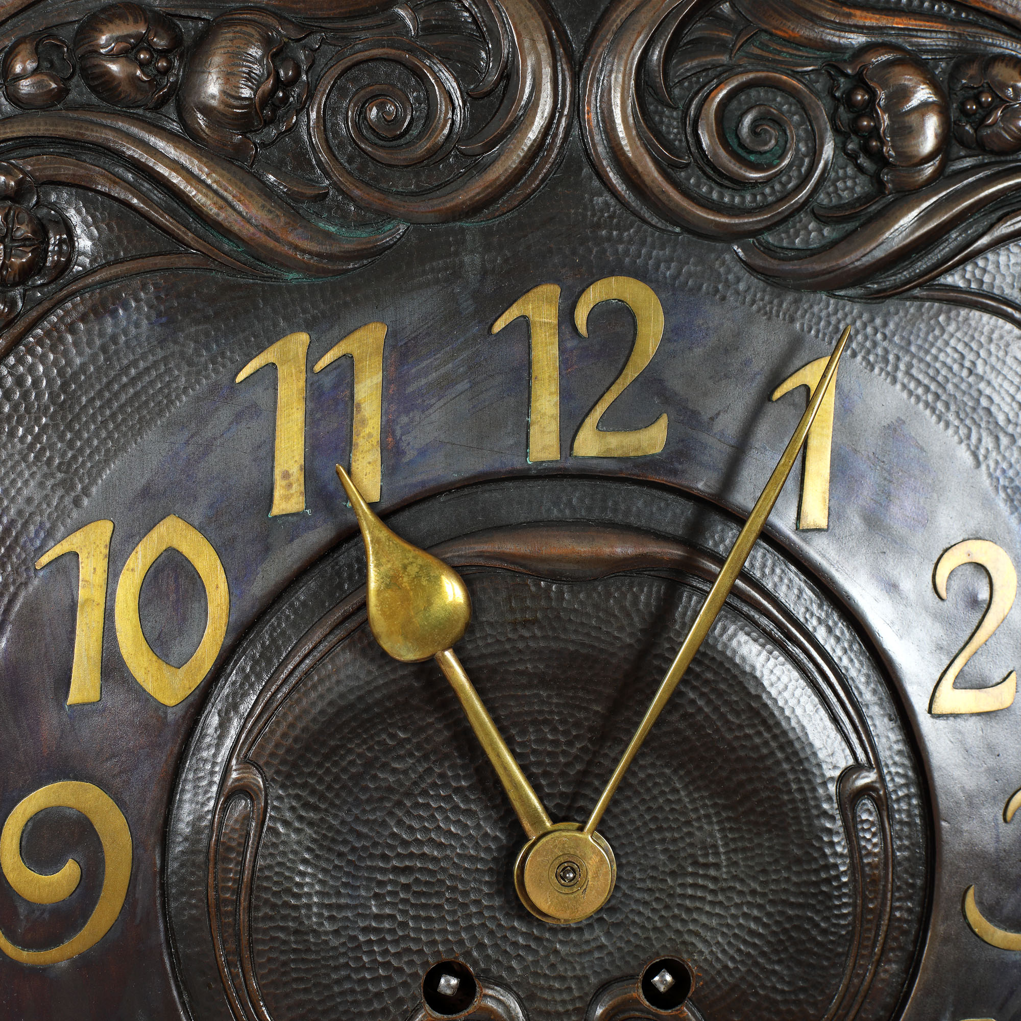 Pendulă de perete cu cadran bogat sculptat, decor volute vegetale și fructe, în cutie cu motive meandre vegetale. Mecanismul necesită revizie.