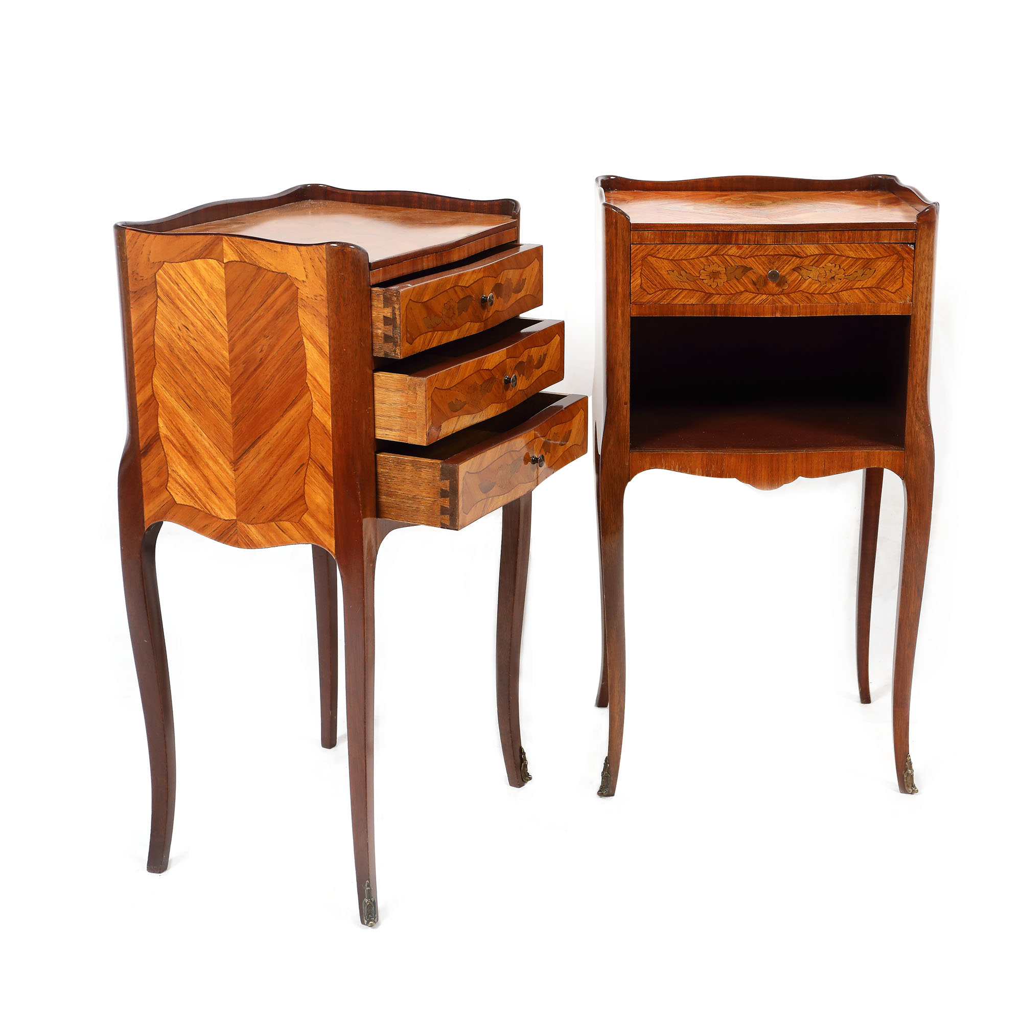 Pereche de noptiere, pe picioare ușor galbate, cu saboți metalici anteriori, cu trei sertare (una dintre ele prezintă doar un sertar și spațiu mic de depozitare). Ambele au blaturi dreptunghiulare decorate cu marchetărie motiv floral și bordură reliefată pe laturile blatului.