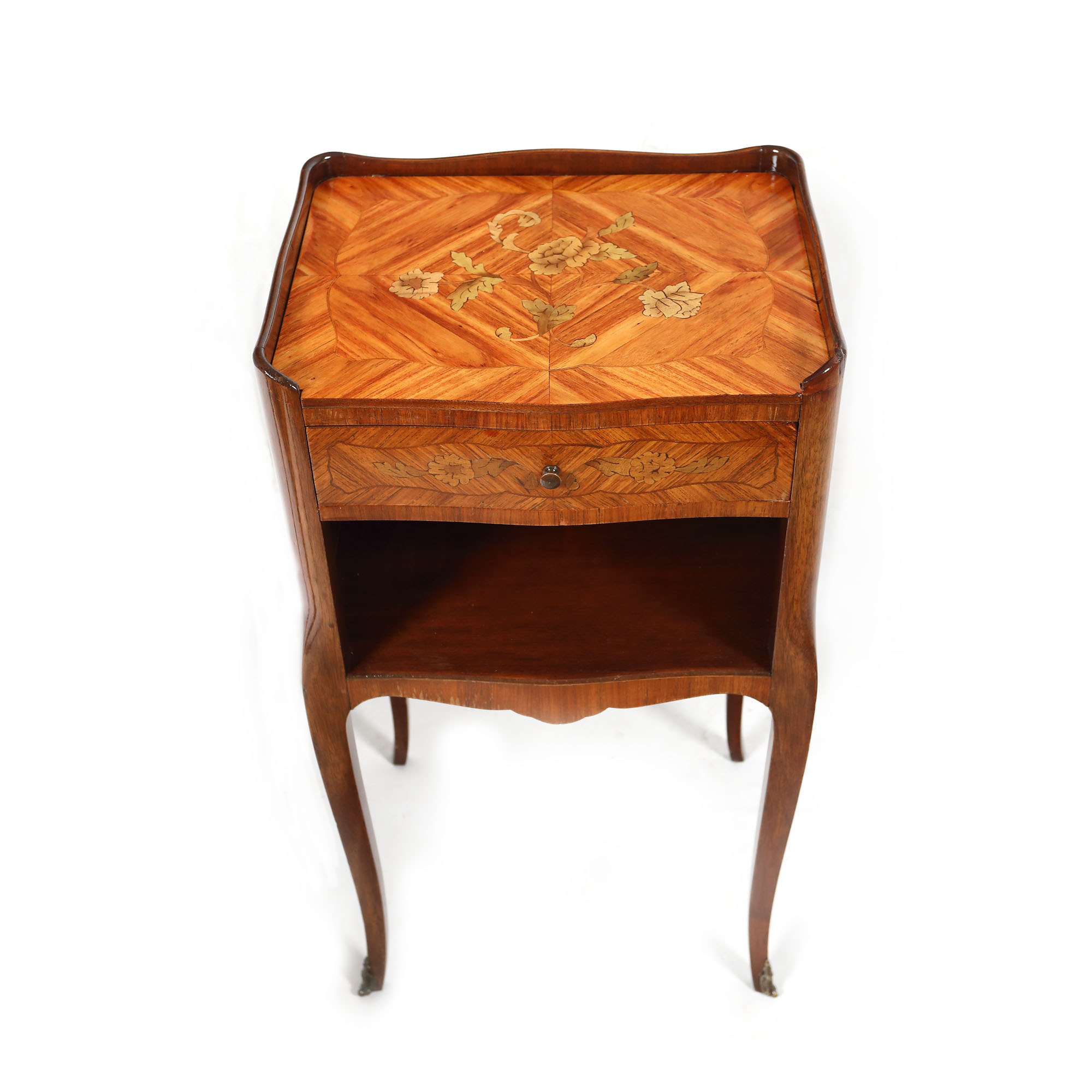 123. Pereche de noptiere în manieră Louis XV, cu motive florale intarsiate, începutul sec. XX, provine din colecția Prințului Ghica