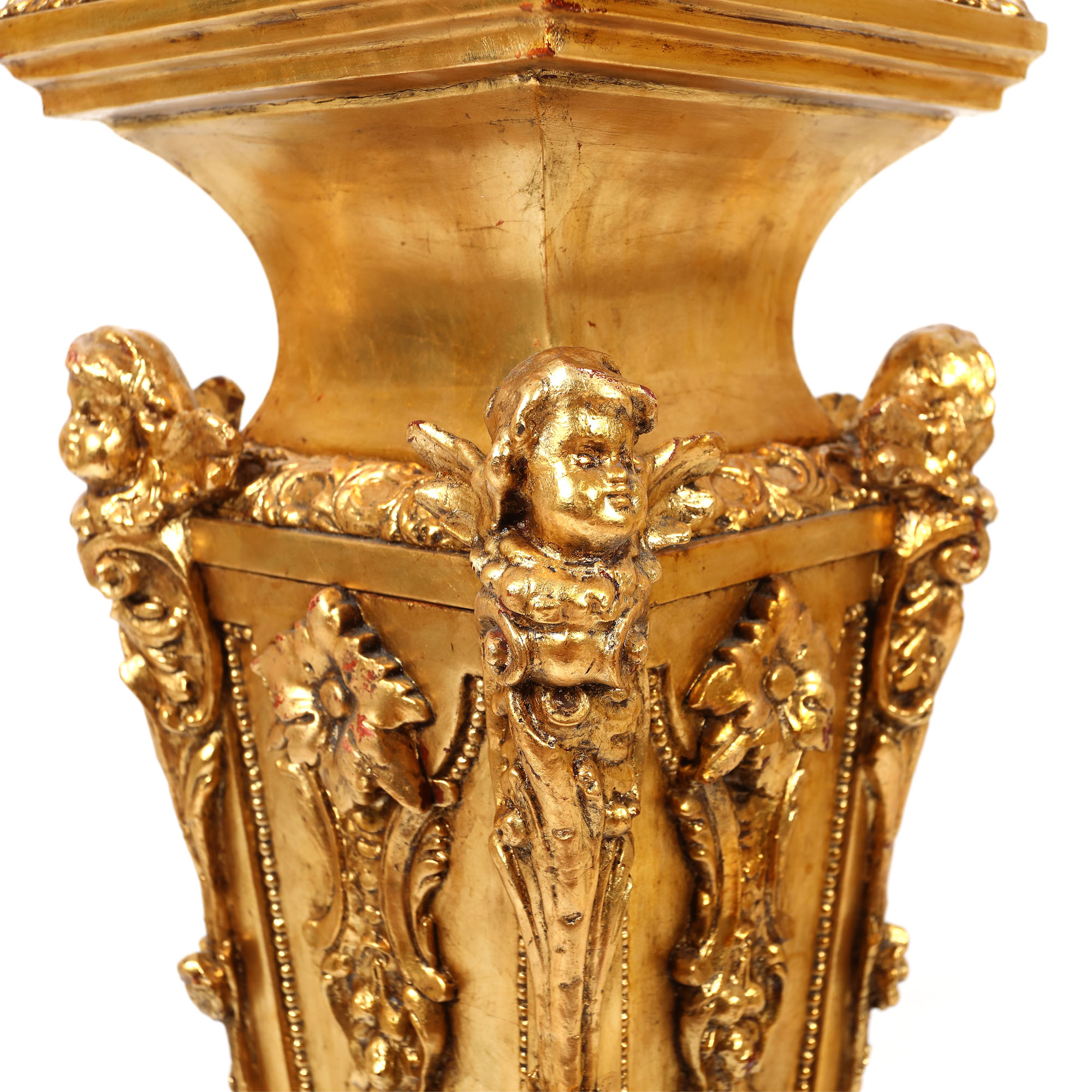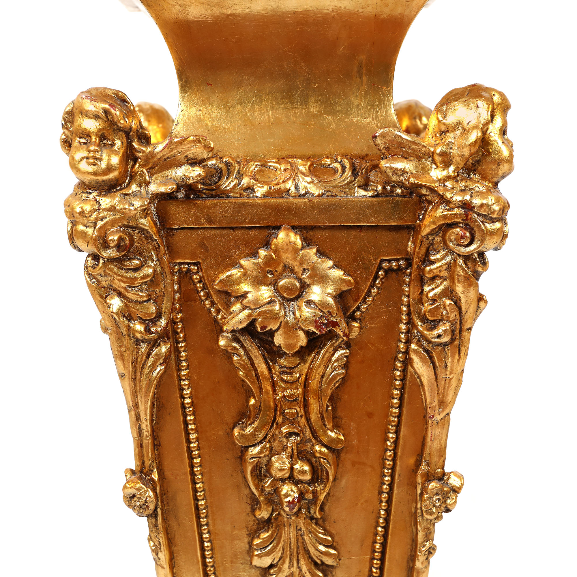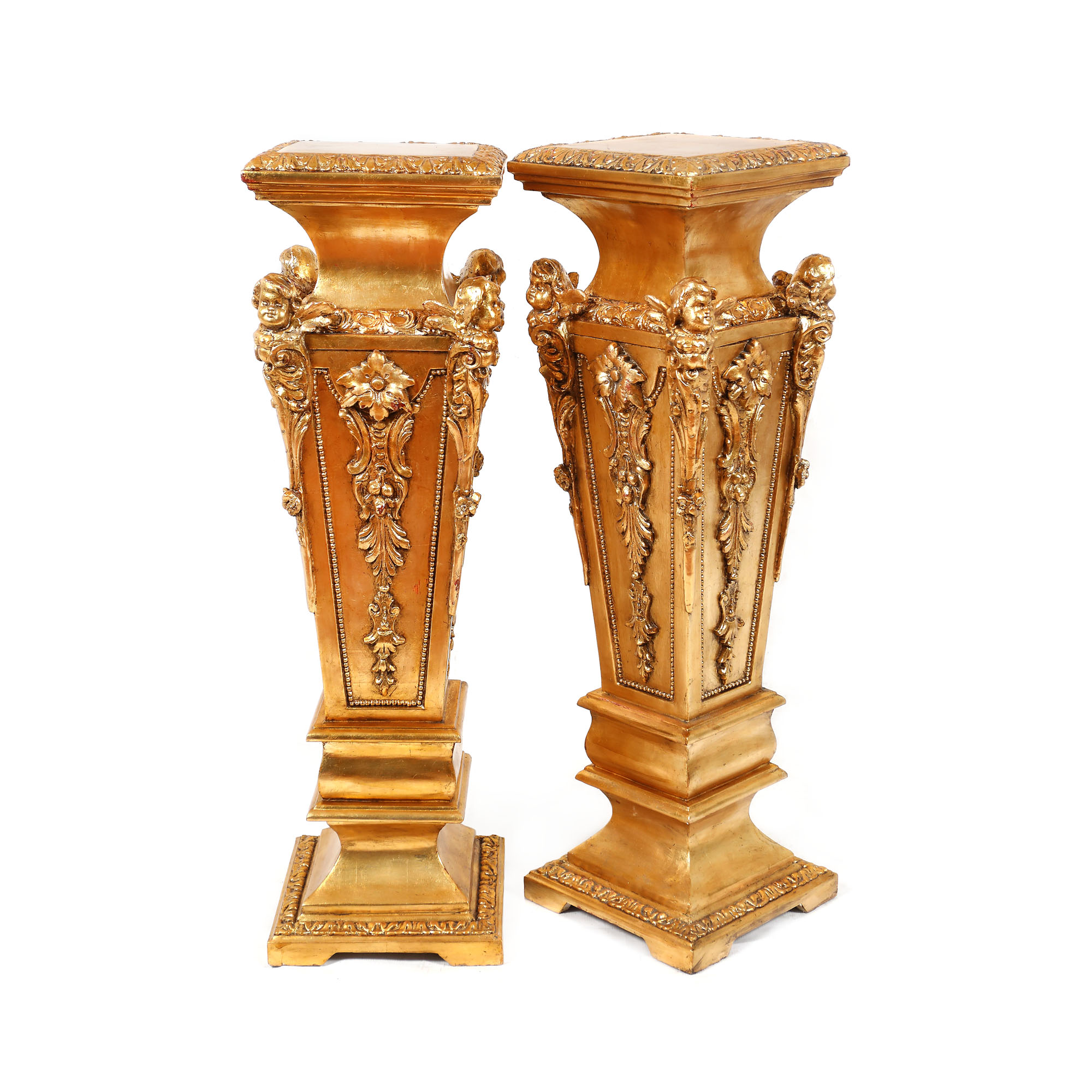 85. Pereche de piedestale Neo-Baroce, din lemn aurit, bogat decorată cu putti și ghirlande de flori, sfârșitul sec. XIX