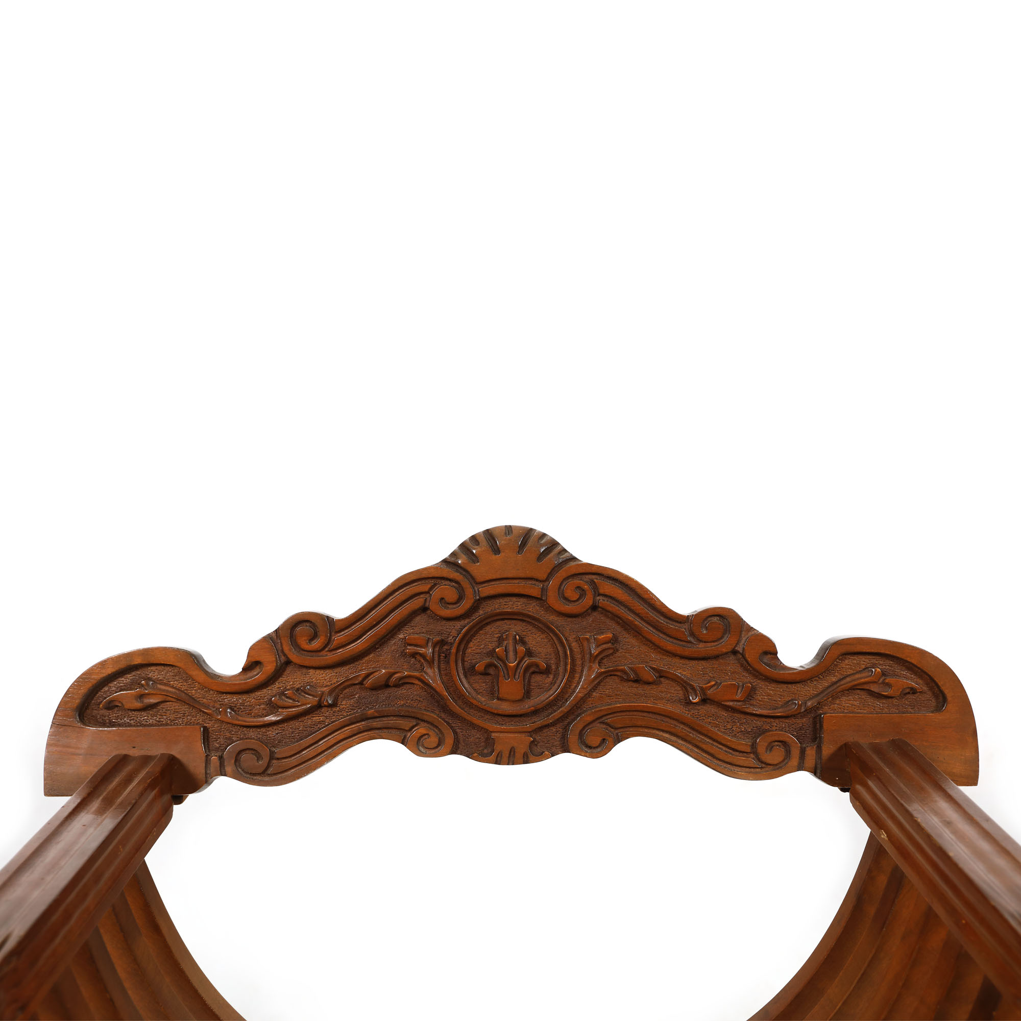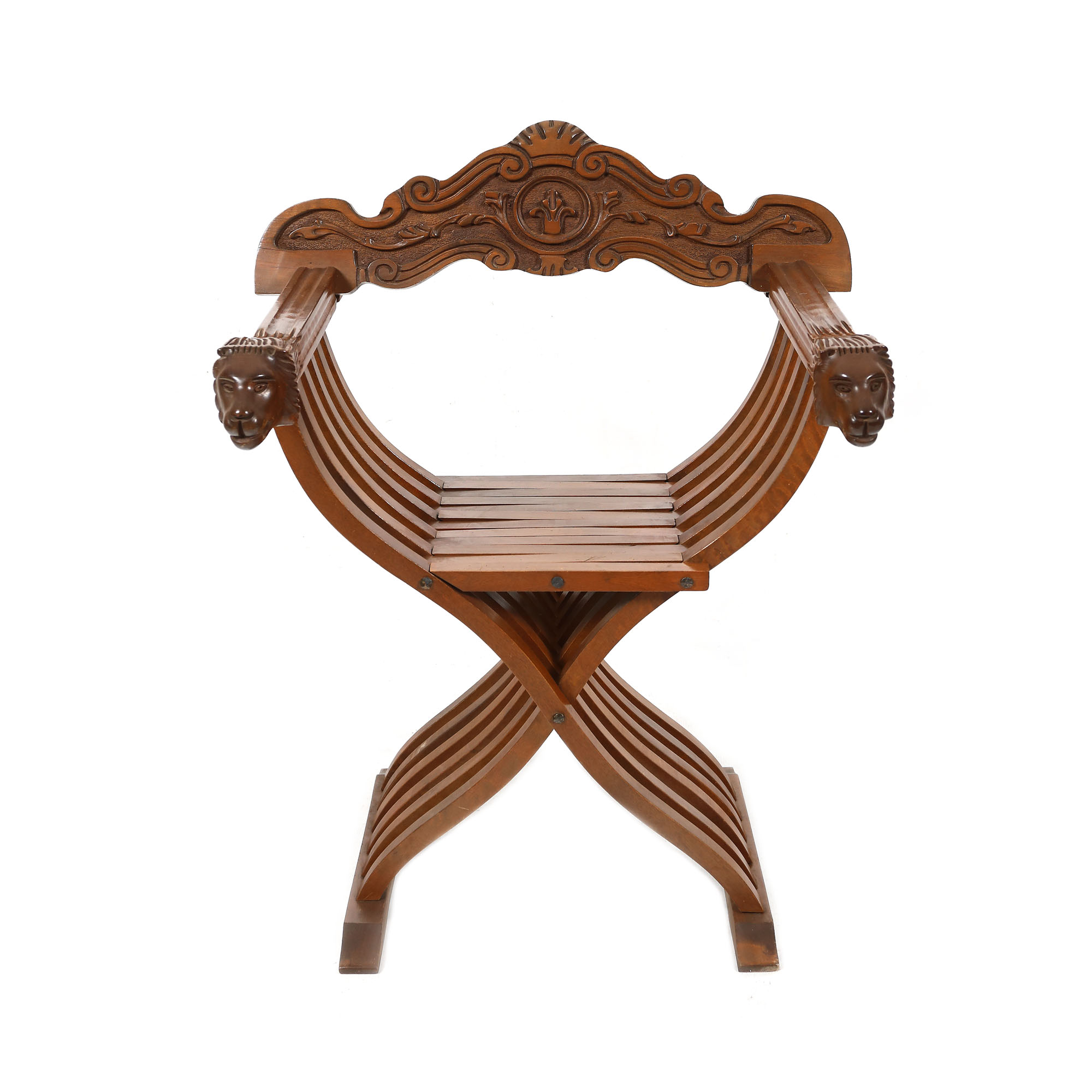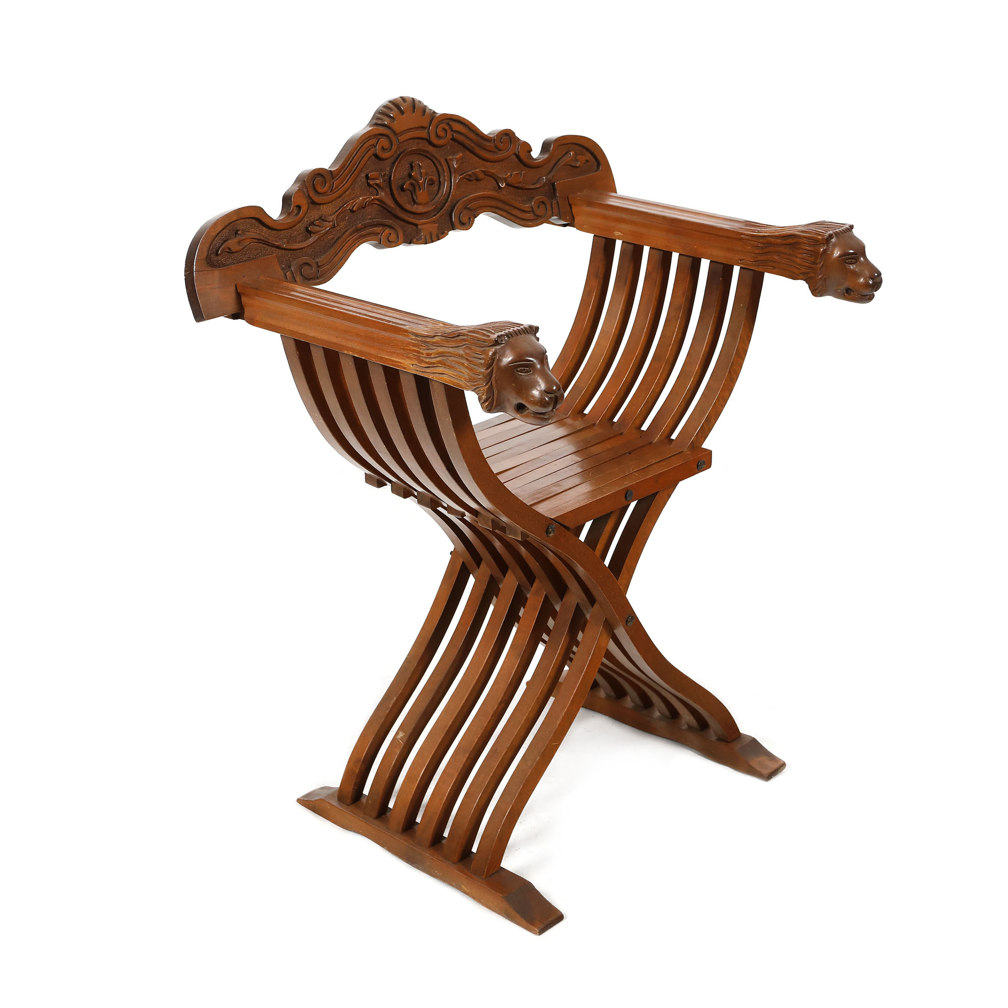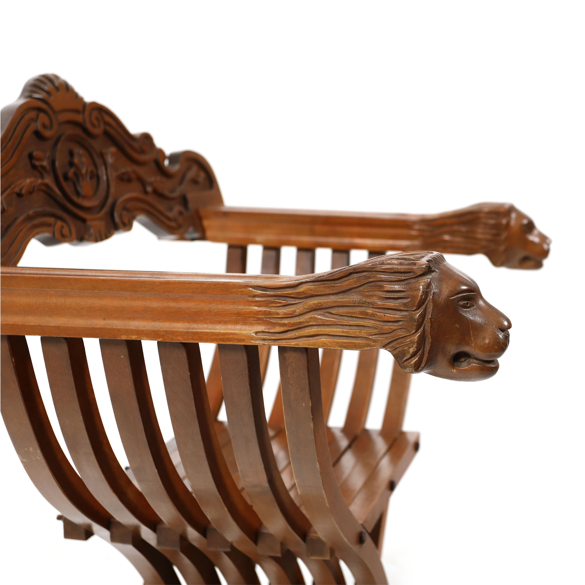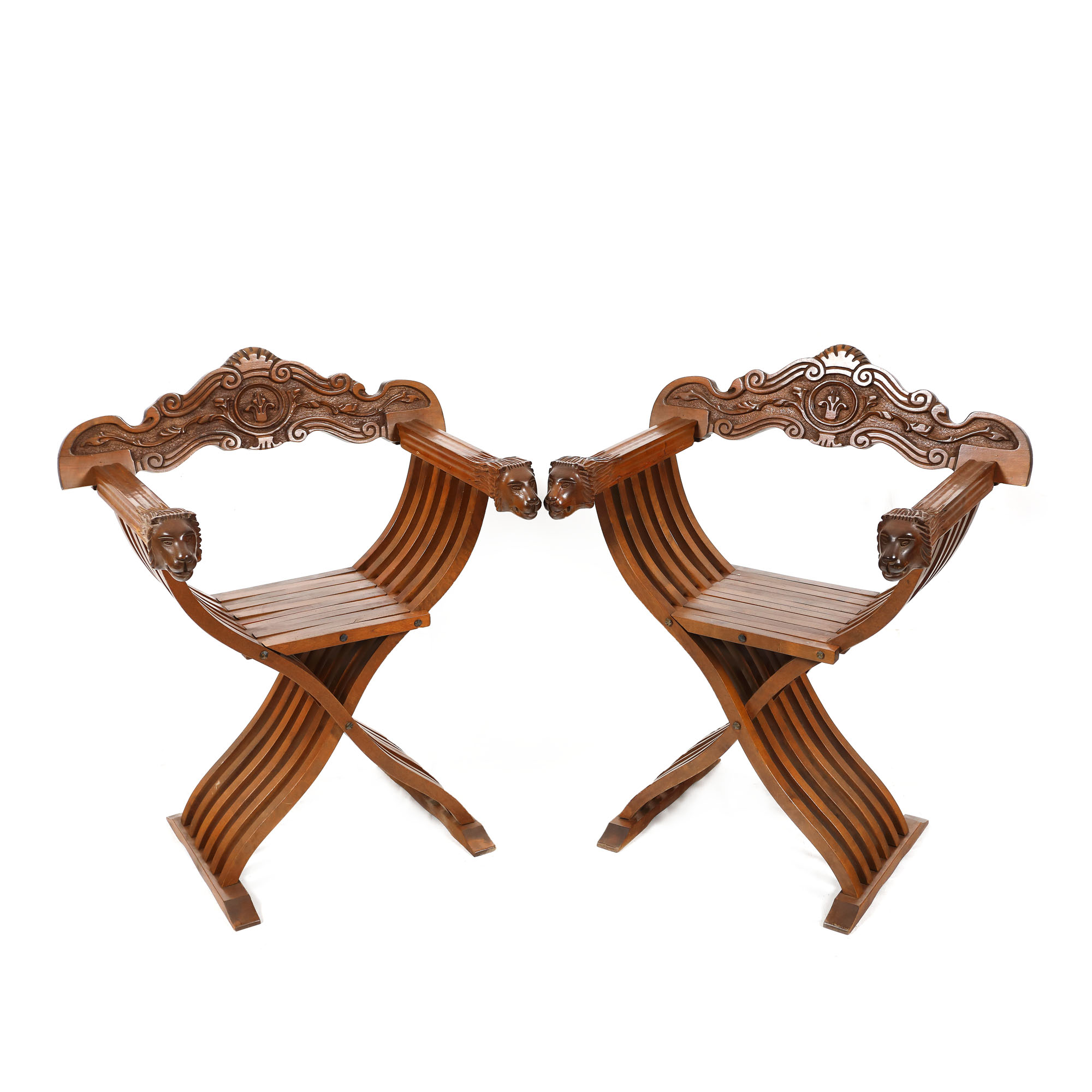 102. Pereche de scaune Dantesca, de inspirație Renaștere timpurie, decorată cu protome de lei, începutul sec. XX [Sec. XX]