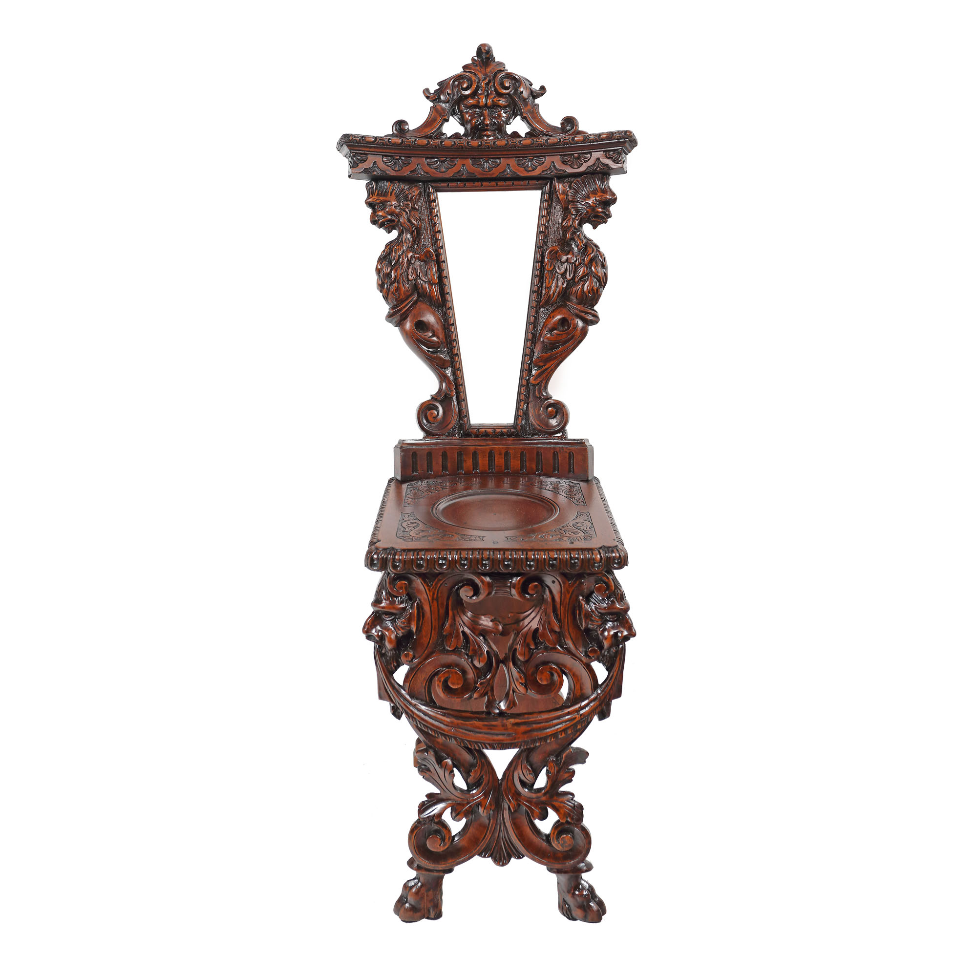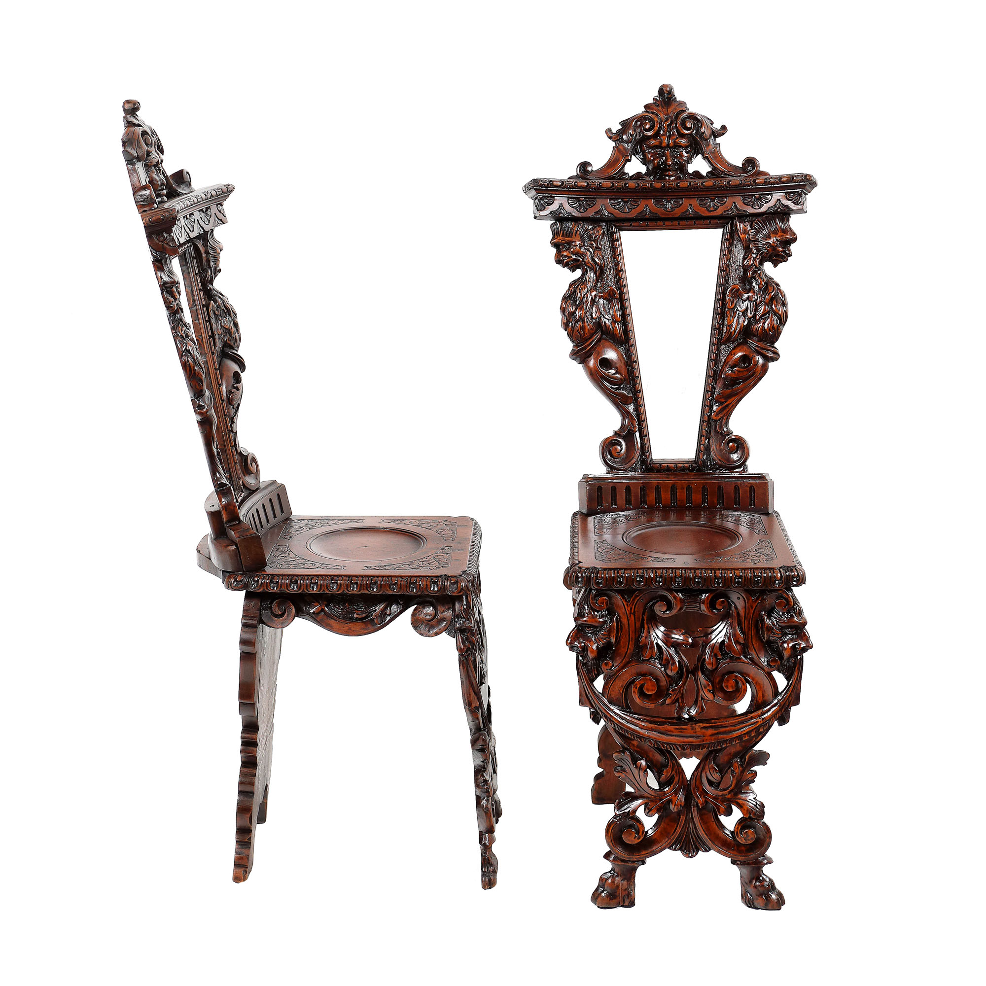 Pereche de scaune tip „sgabello”, cu picioare panouri decorate cu mascaroni și frunze de acant, șezută reducă, cu medalion central lis și spătar cu montanți grigoni, fronton cu mascaron. Lipsă panouri centrale.