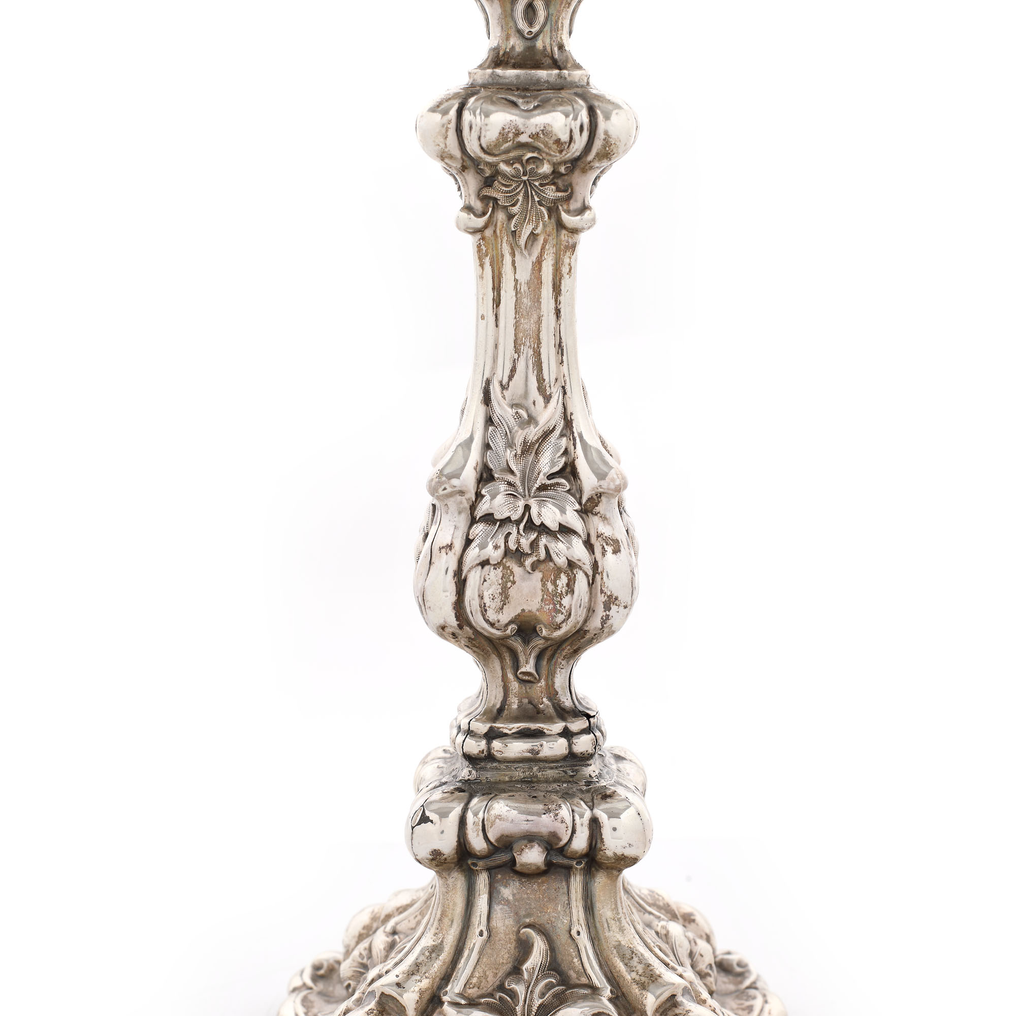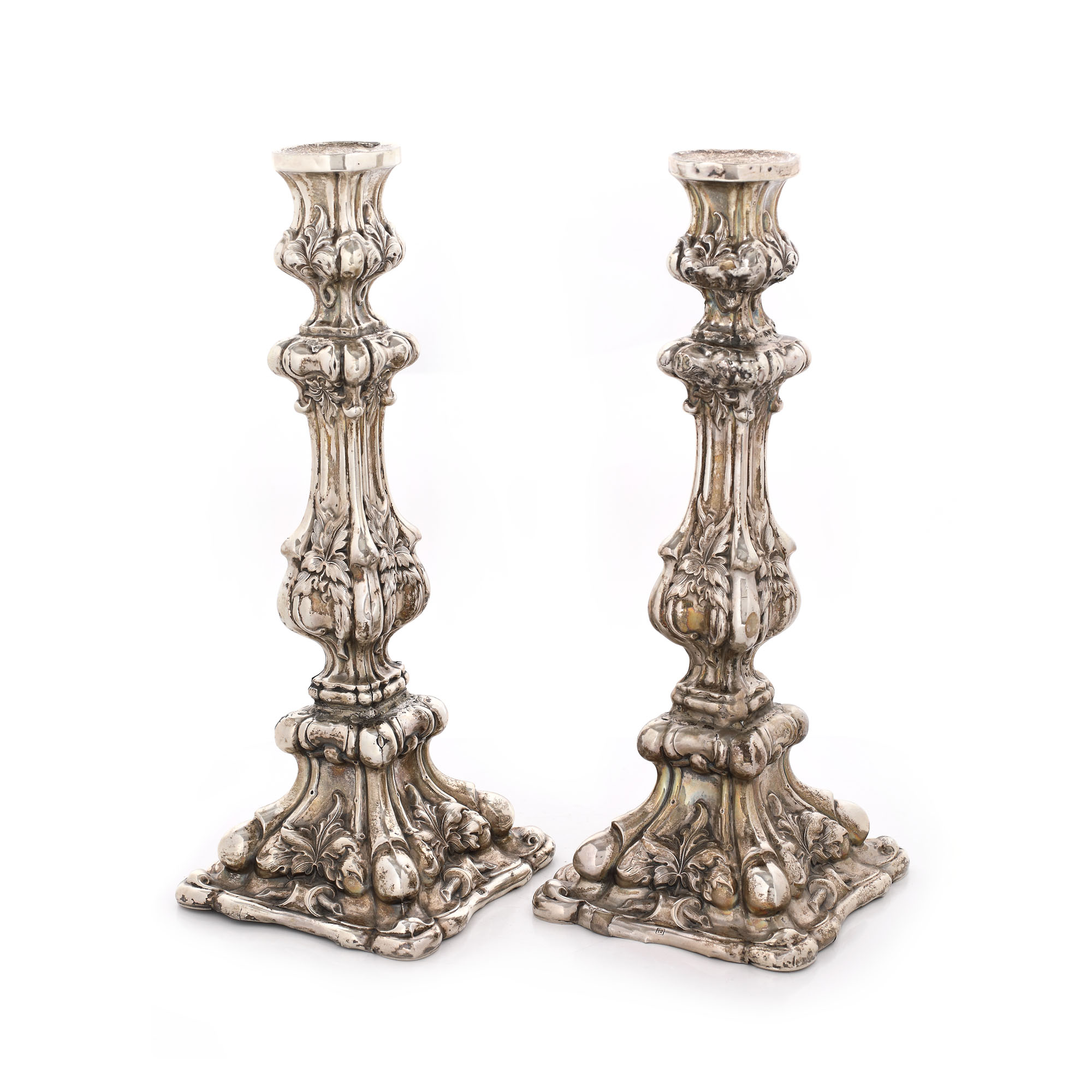 94. Pereche de sfeșnice Neo-Rococo, din argint, decorată cu elemente vegetale, jumătatea sec. XIX