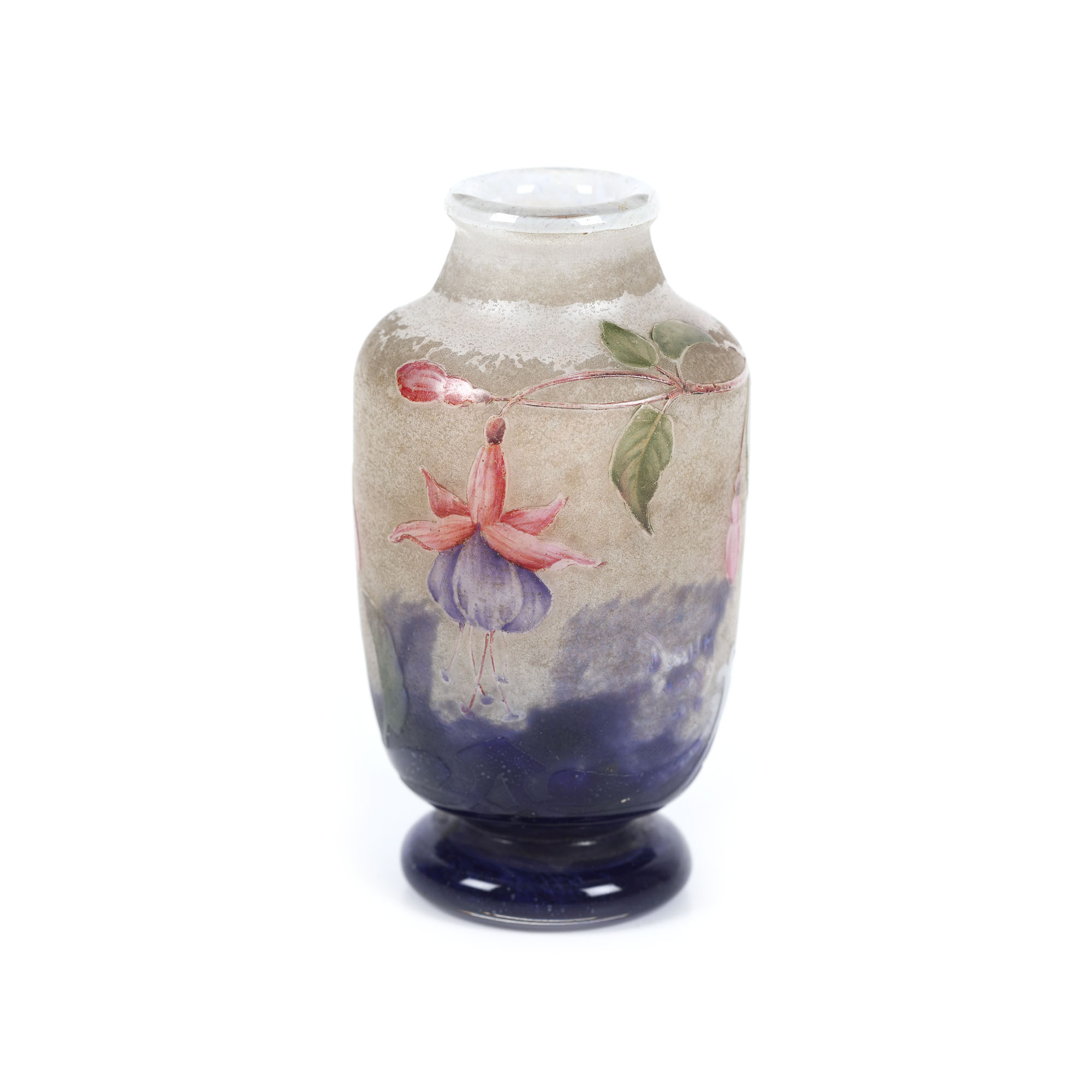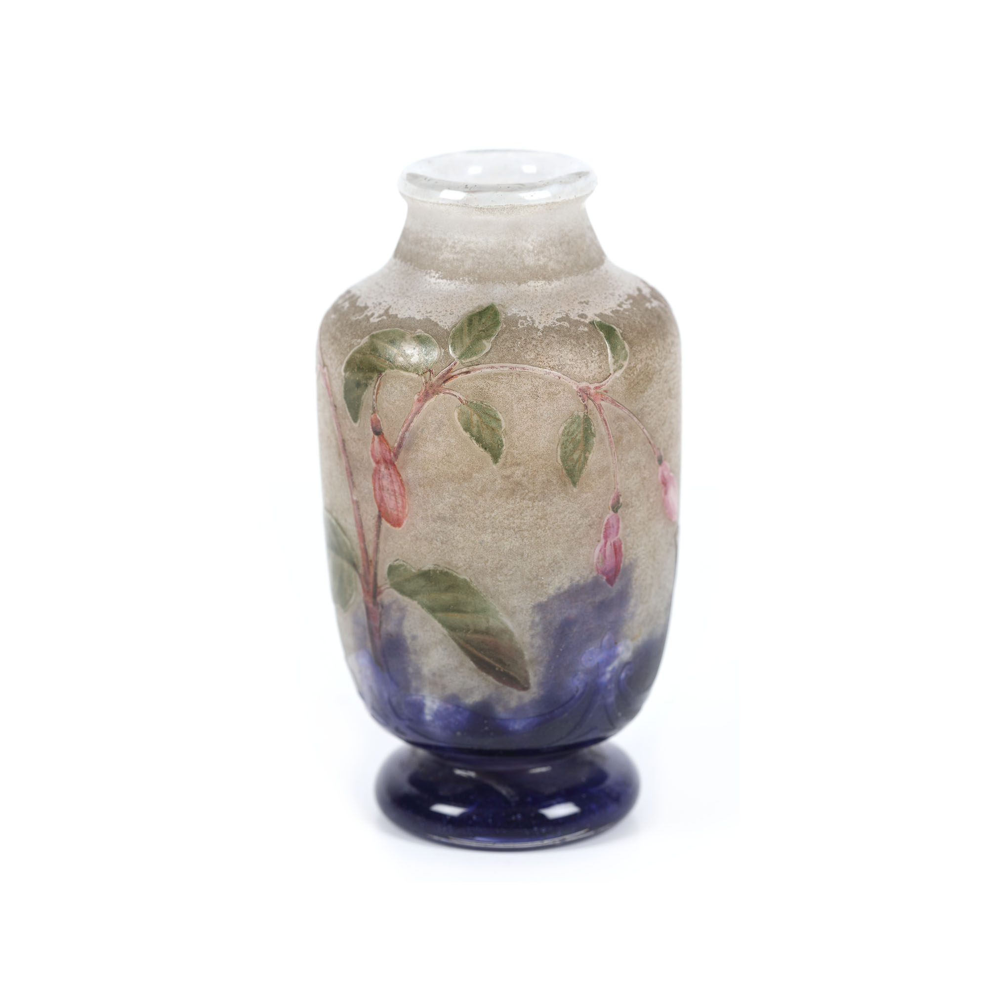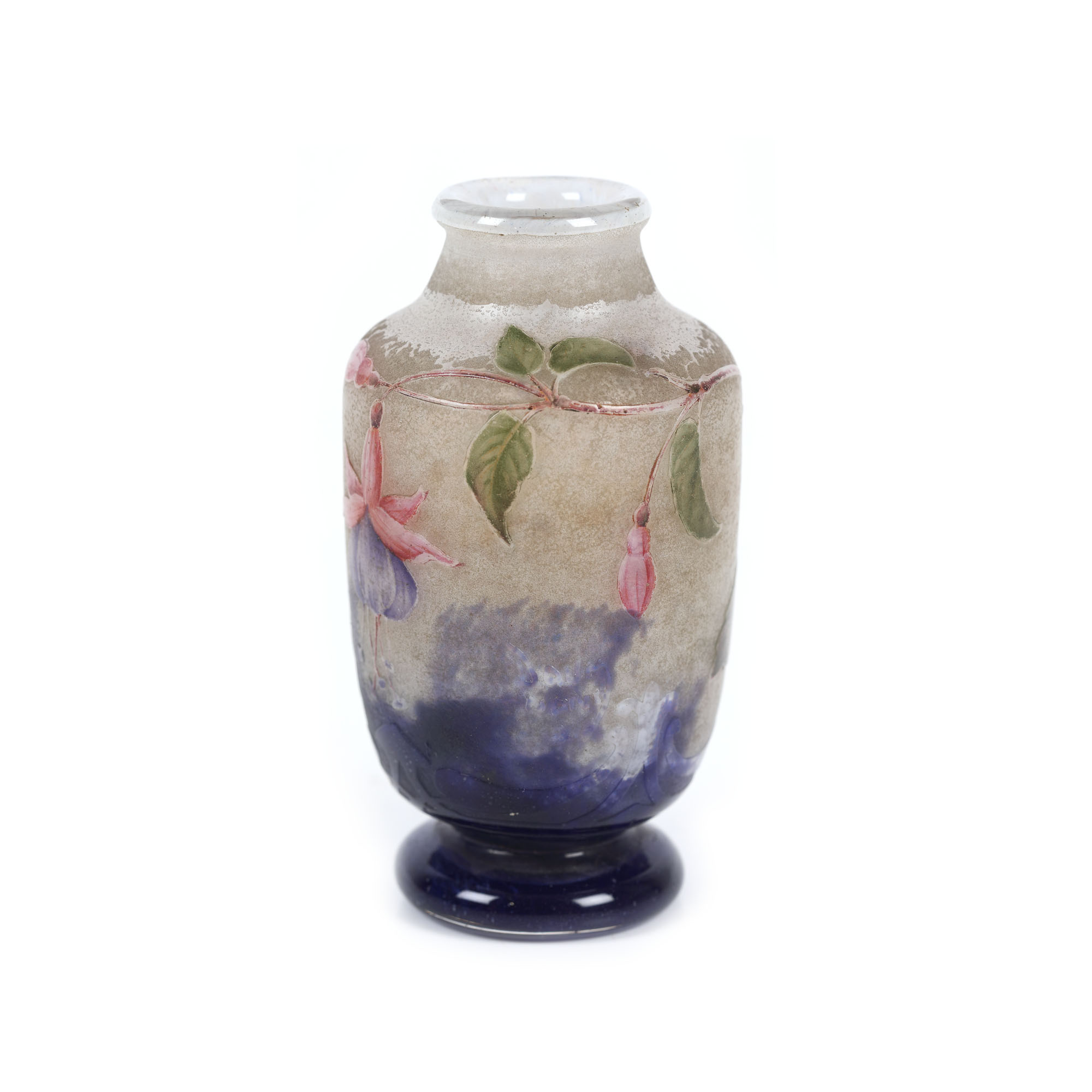 51. ”Purple bell” - mic vas Daum Nancy, din sticlă, decorat cu motiv floral în tonuri de mov și fucsia, cca. 1905