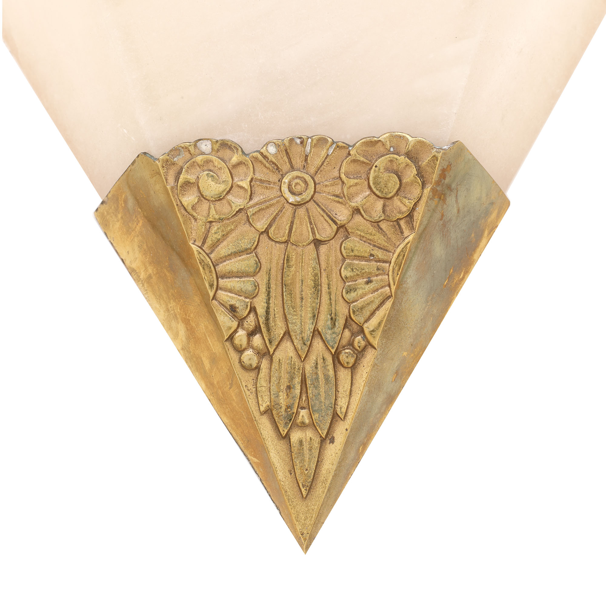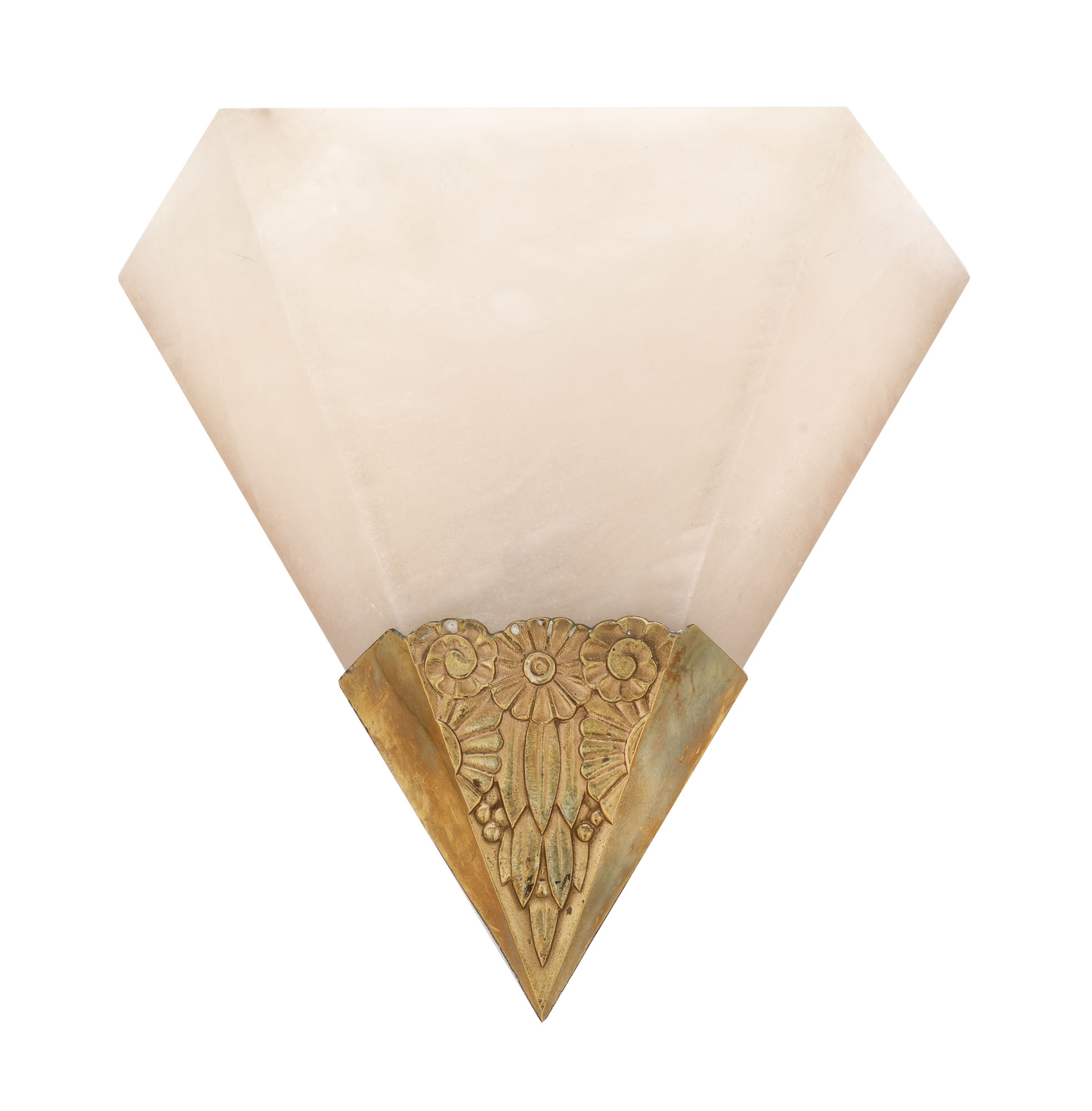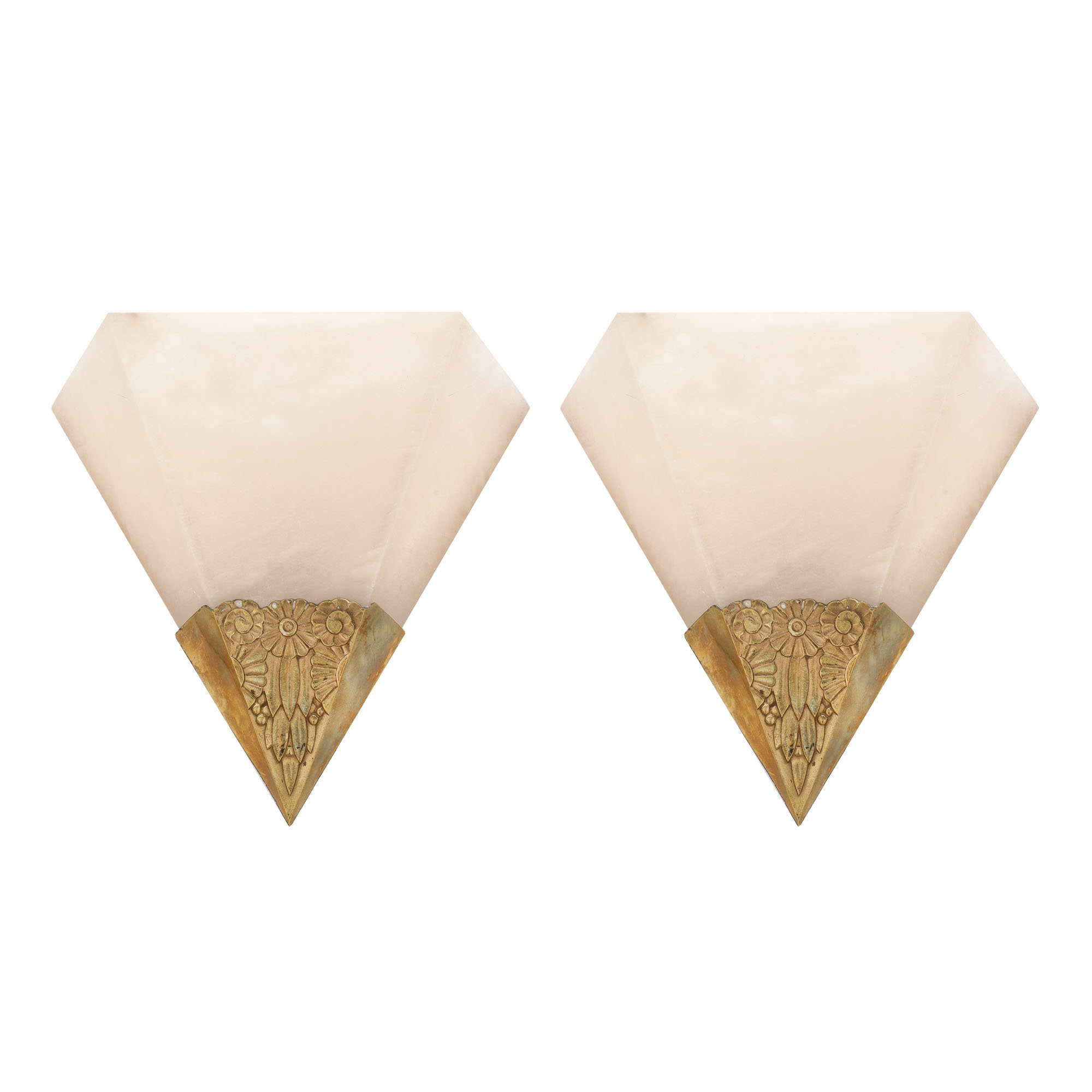 129. Superbă pereche de aplice Art Deco, realizată în manieră Edgar Brandt, din alabastru și bronz doré, cca. 1930