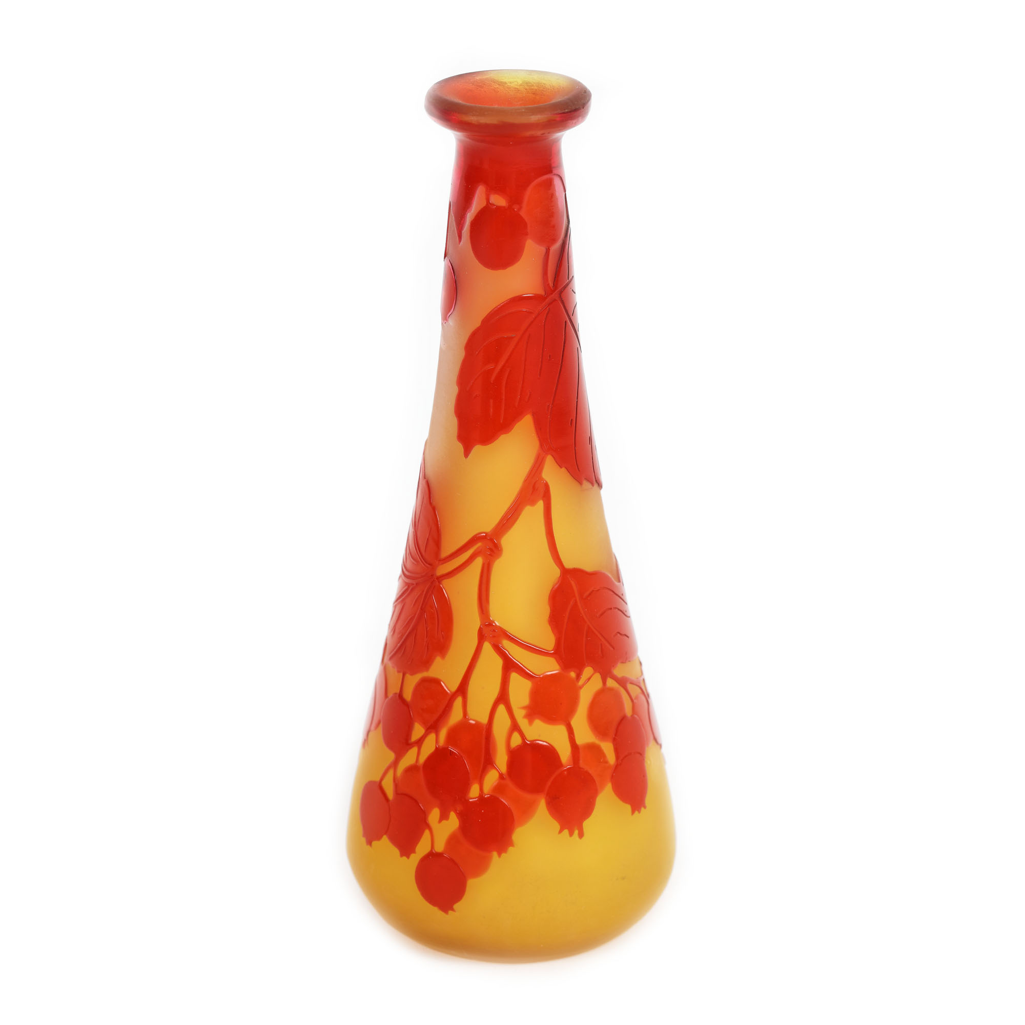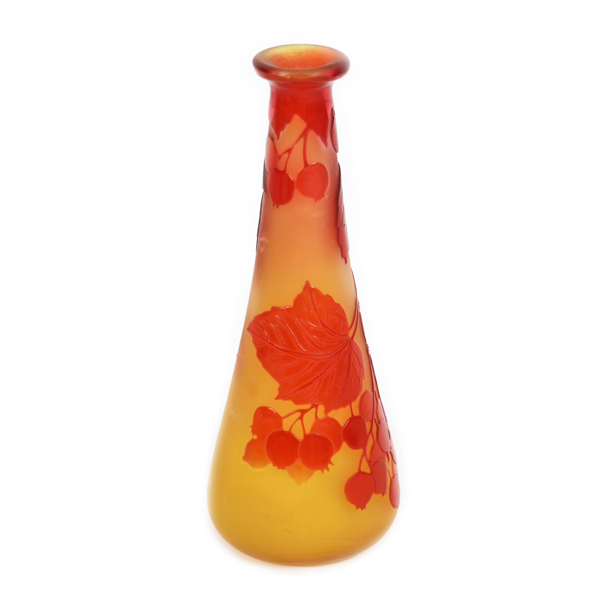 Vas tronconic, îngustat spre buză, cu decor reliefat, decorat cu ramuri de coacăz. În stil Art Nouveau.