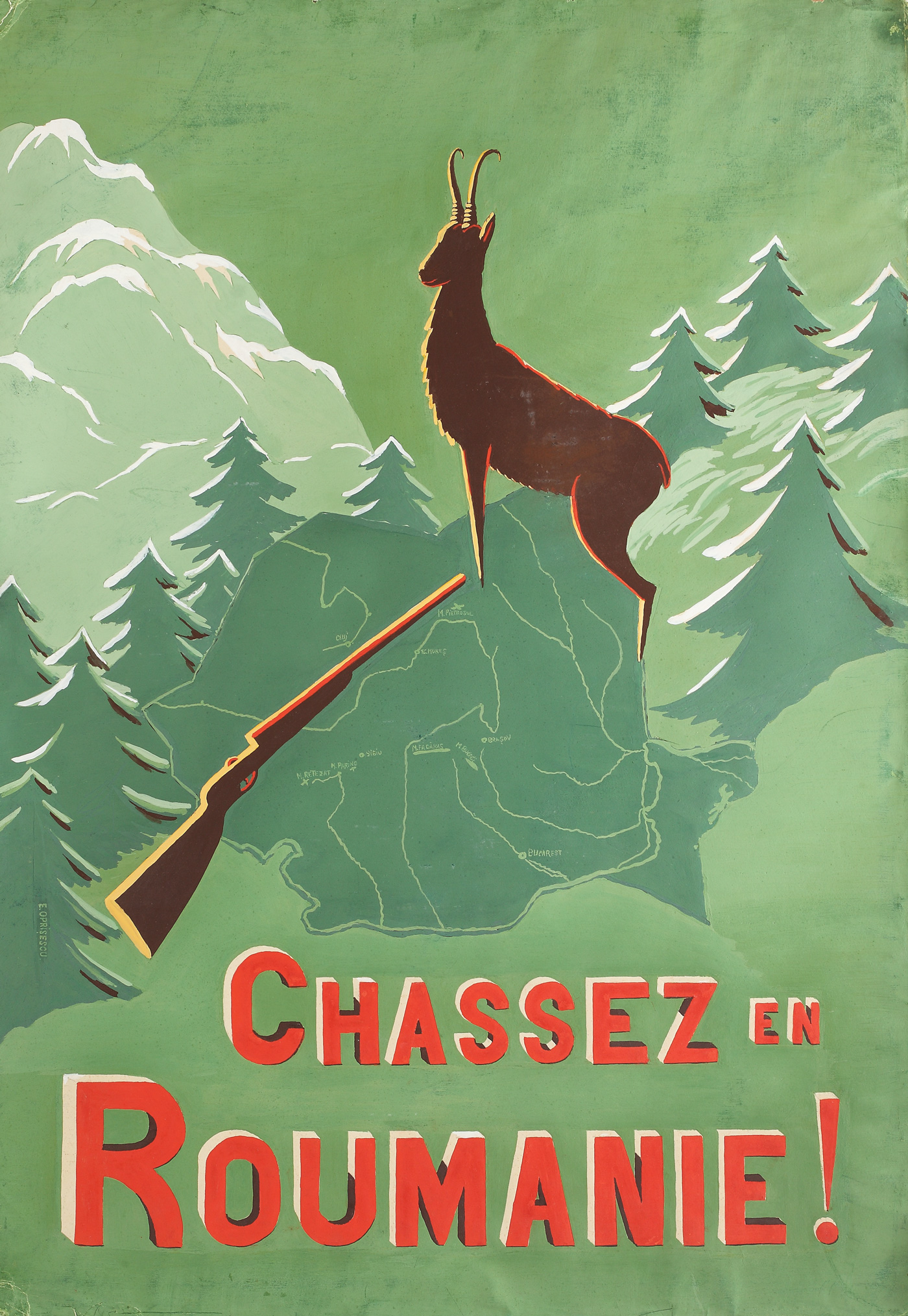 105. Afiș de propagandă "Chassez en Roumanie", ilustrator E. Oprișescu, anii '50