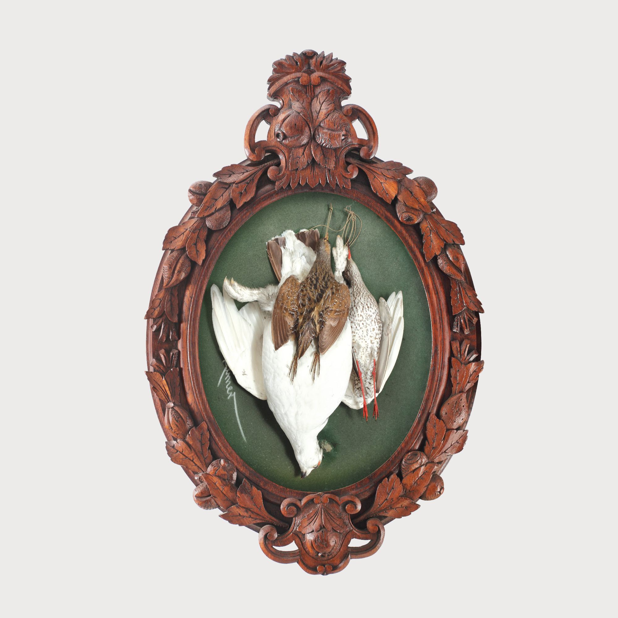 Cele trei păsări care trăiesc în părțile de deal și de munte ale Franței sunt prinse într-un medalion din sticlă cu ramă din lemn bogat decorată cu elemente vegetale stilizate. Pe verso se află eticheta care atestă participarea la Expoziția Universală din 1889.