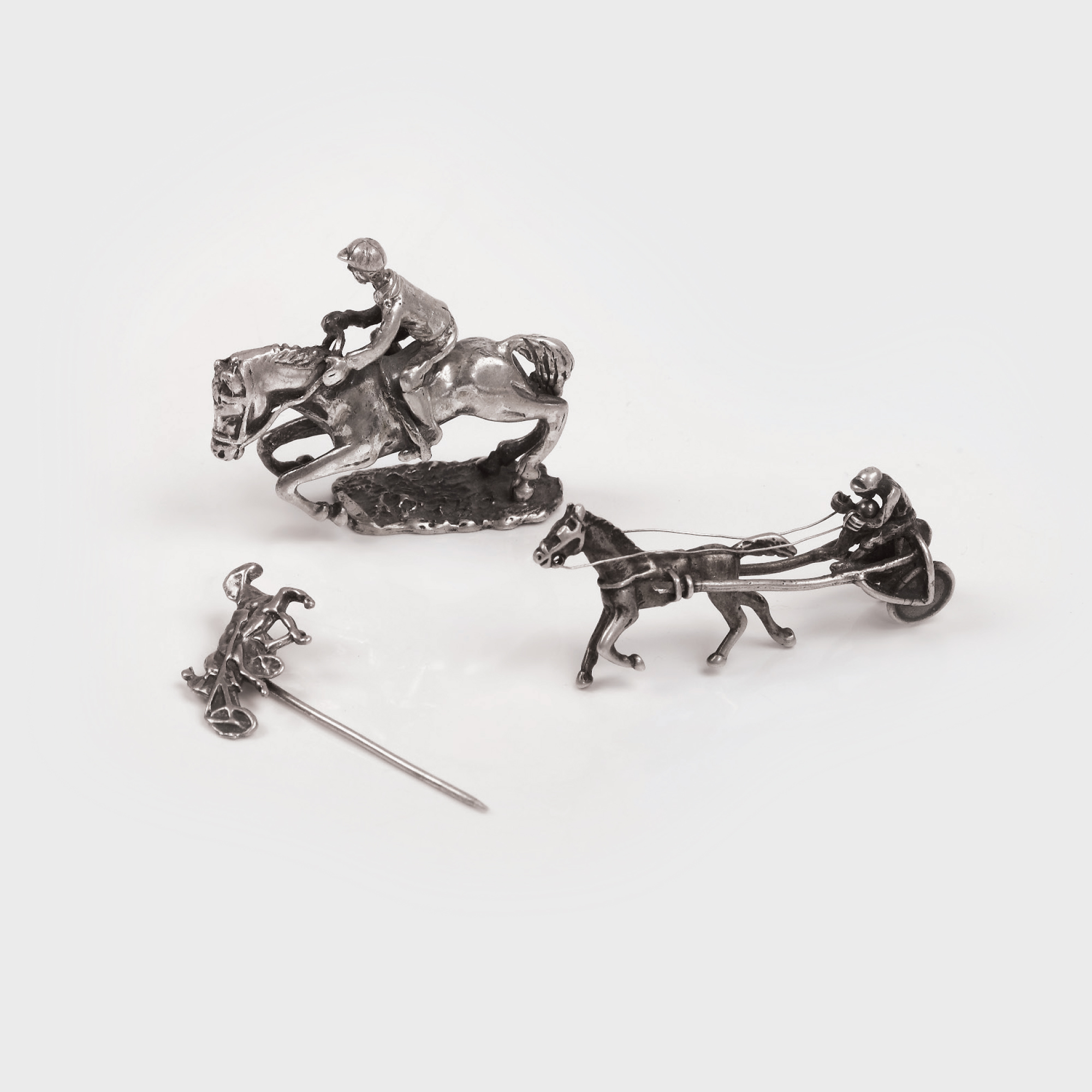 Figurine din argint turnat, reprezentând pe rând o insignă cu o mică trăsură cu jocheu în mers, un cal cu călăreț în plin avânt și o trăsură cu jocheu în cursă, toate fiind fin executate ca piese de vitrină.