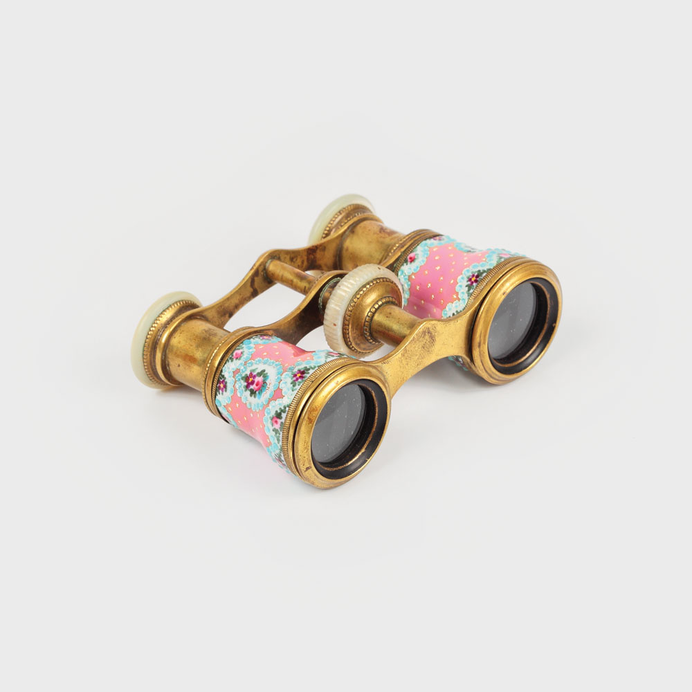 Splendid binoclu de spectacol, decorat în manieră Napoleon al III-lea, cu mici buchete florale tratate policrom conturate de șir perlat turcoaz pe un fundal emailat roz-somon. Ocularele şi rotiţa de focalizare sunt din sidef polisat.
