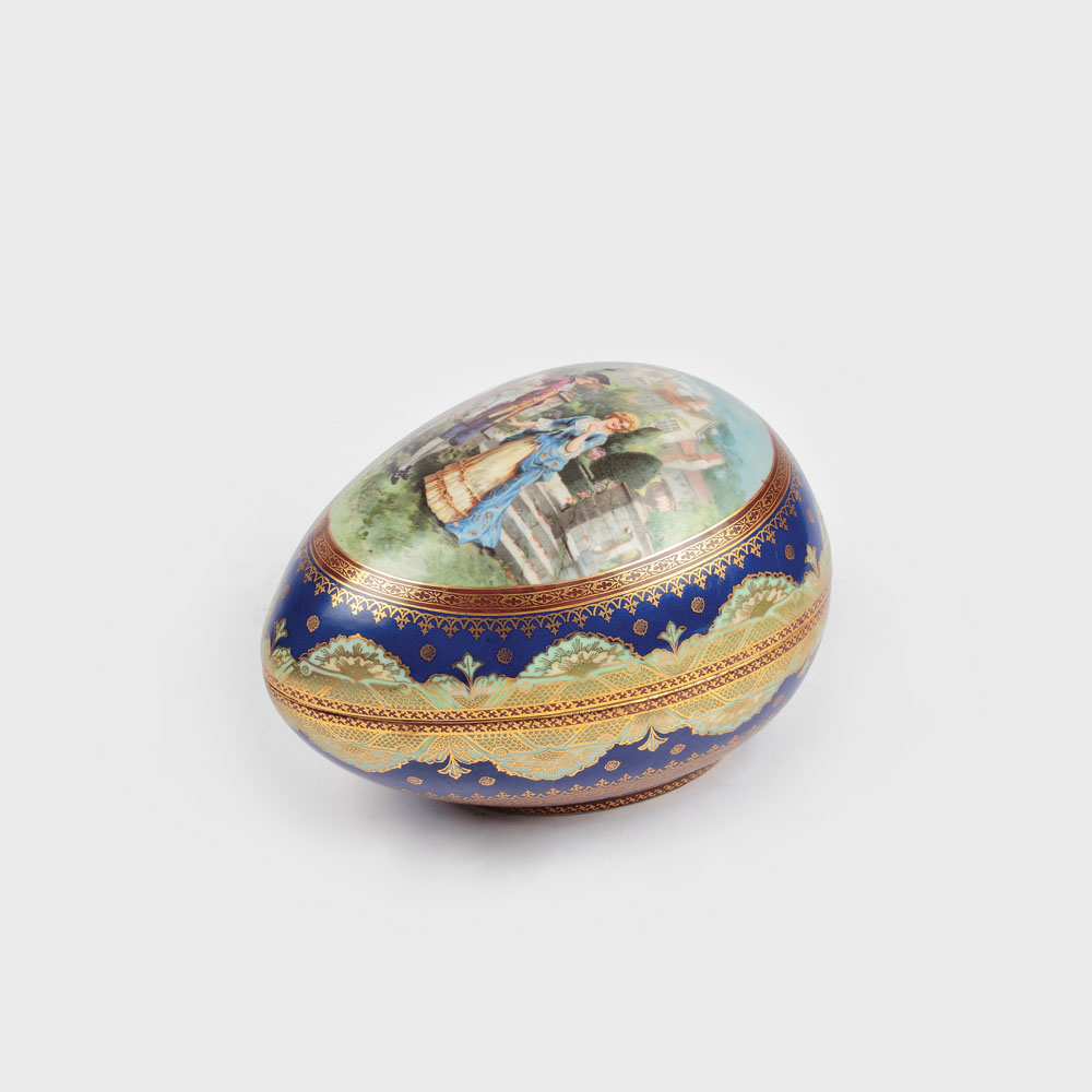 Casetă în formă de ou, având bază ovală și capac detașabil constituind jumătate din suprafața piesei. Decorul, detașat pe suprafața colorată în albastru clar, ce imită albastrul de Sèvres, constă în registre diverse, cu fond de aur coloidal, formate din val grecesc, anthemion, motive trilobate și cvadrilobate, polul de atenție fiind constituit din lambrechine colorate în verde-celadon. Pe capac, decorul este susținut amplu de medalion în rezervă, cu pictură reprezentând scenă de gen – pereche în costume caracteristice celei de a doua jumătăți a secolului al XVIII-lea, în fața unui conac Neo-gotic, înconjurat de parc englezesc.