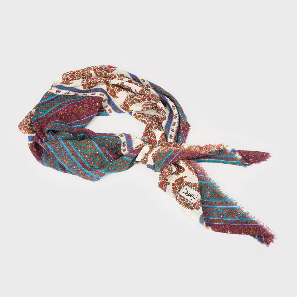 Delicatul șal este realizat într-o manieră impecabilă, specifică casei Yves Saint-Laurent, creat pentru plimbările romantice din nopţile reci de vară sau pentru o alură șic de zi cu zi. Este confecționat din lână fină și în colțul din stânga este marcat cu monograma casei YSL. Yves Saint-Laurent creează astfel de accesorii pentru a pune în valoare femeia puternică și îndrăzneață, subliniind feminitatea și eleganța înnăscută.