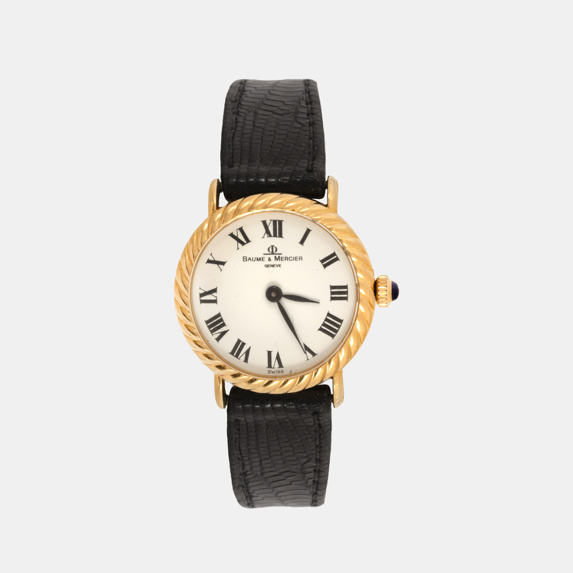 Ceas Baume & Mercier, din aur, de mână, de damă, referință 36662. Mecanism cu armare manuală. Cadran de culoare alb, indici numerale romane. Curea adăugată aftermarket, din piele, de culoare neagră, cu sistem de închidere de tip clasic cu cataramă. Accesorii: cutia originală.