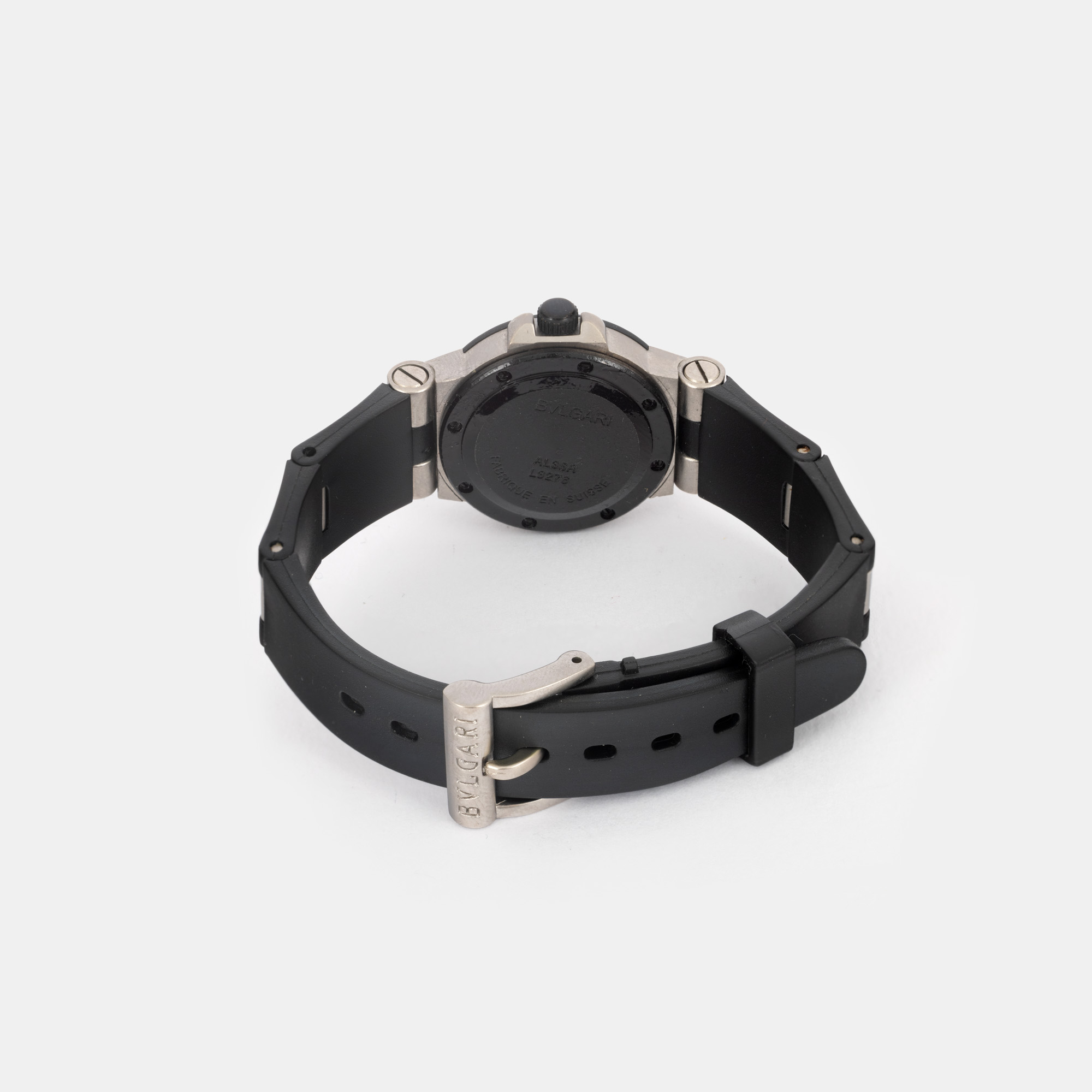 Ceas Bvlgari Diagono Aluminium, de mână, de damă. Mecanism quartz. Cadran de culoare argintiu, indici numerale arabe pentru orele 6 și 12 și baghete pentru restul orelor. Curea originală, din cauciuc, cu sistem de închidere clasic cu cataramă. Observații: capac anterior adăugat aftermarket.