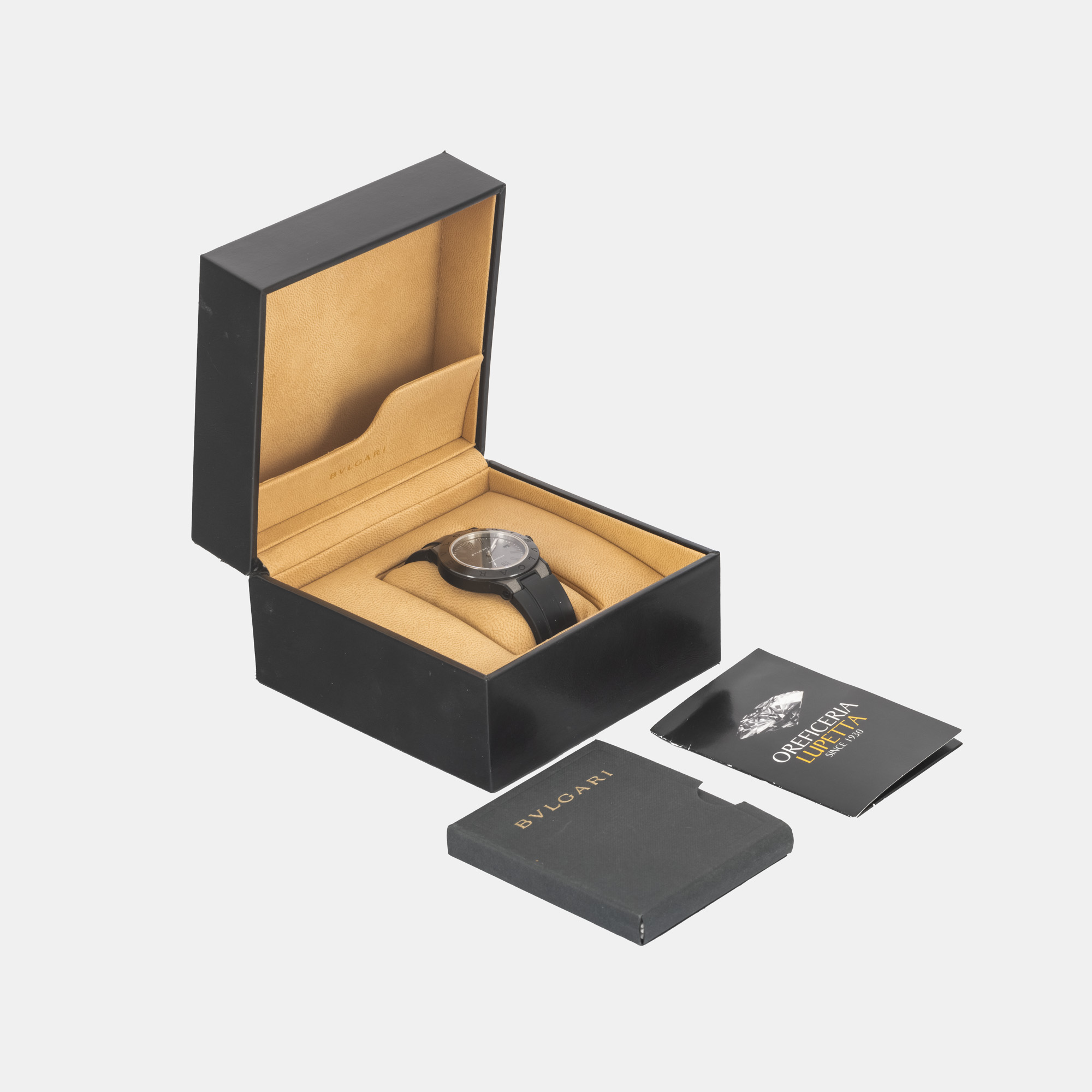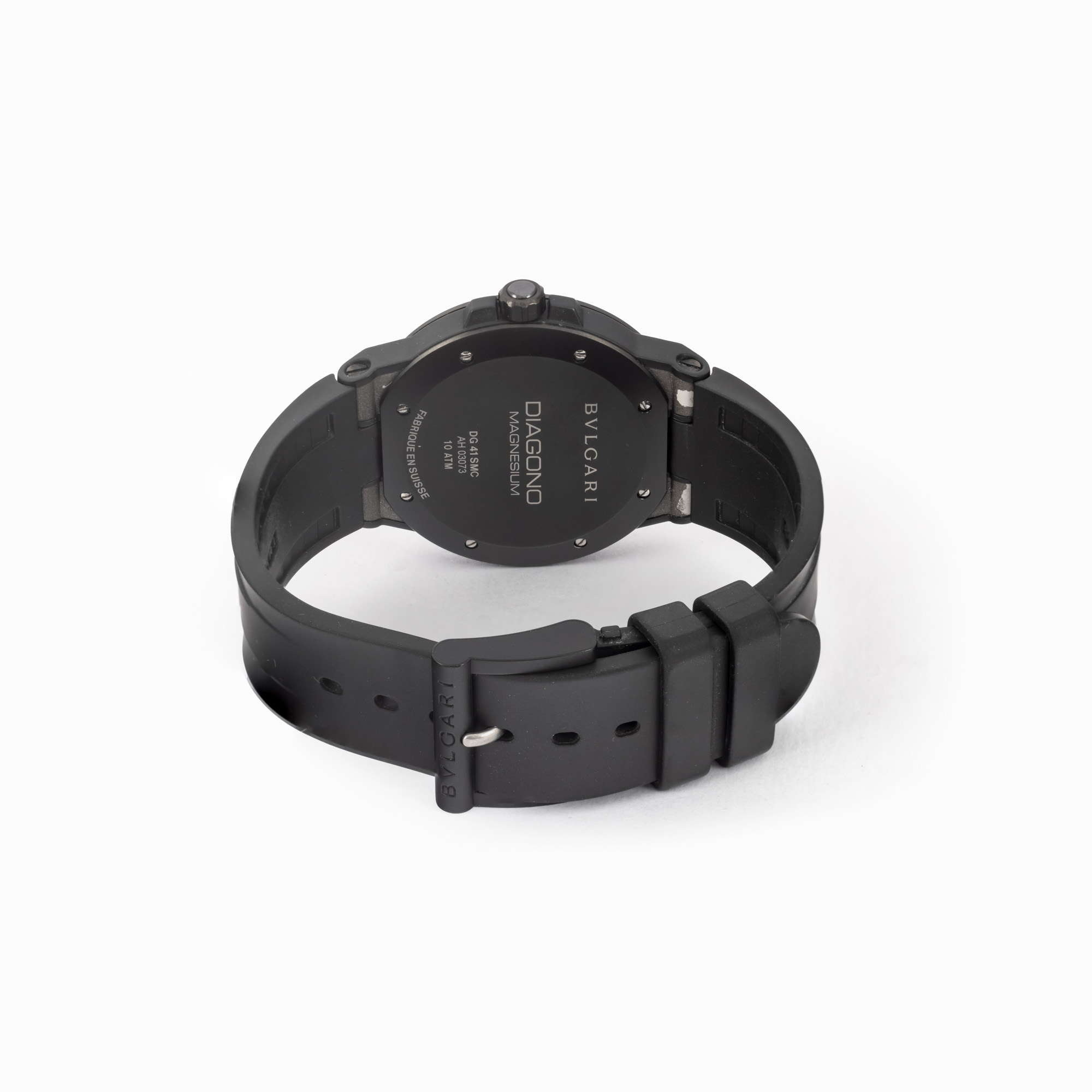 Ceas Bvlgari Diagono Magnesium, de mână, bărbătesc, referință DG 41 SMC. Mecanism automatic. Cadran de culoare gri, indici liniari și numerale arabe prntru orele 6 și 12, registru pentru dată în dreptul orei 3. Curea originală, din cauciuc, de culoare neagră, cu sistem de închidere clasic cu cataramă. Accesorii: cutia originală, certificat de garanție și broșură.