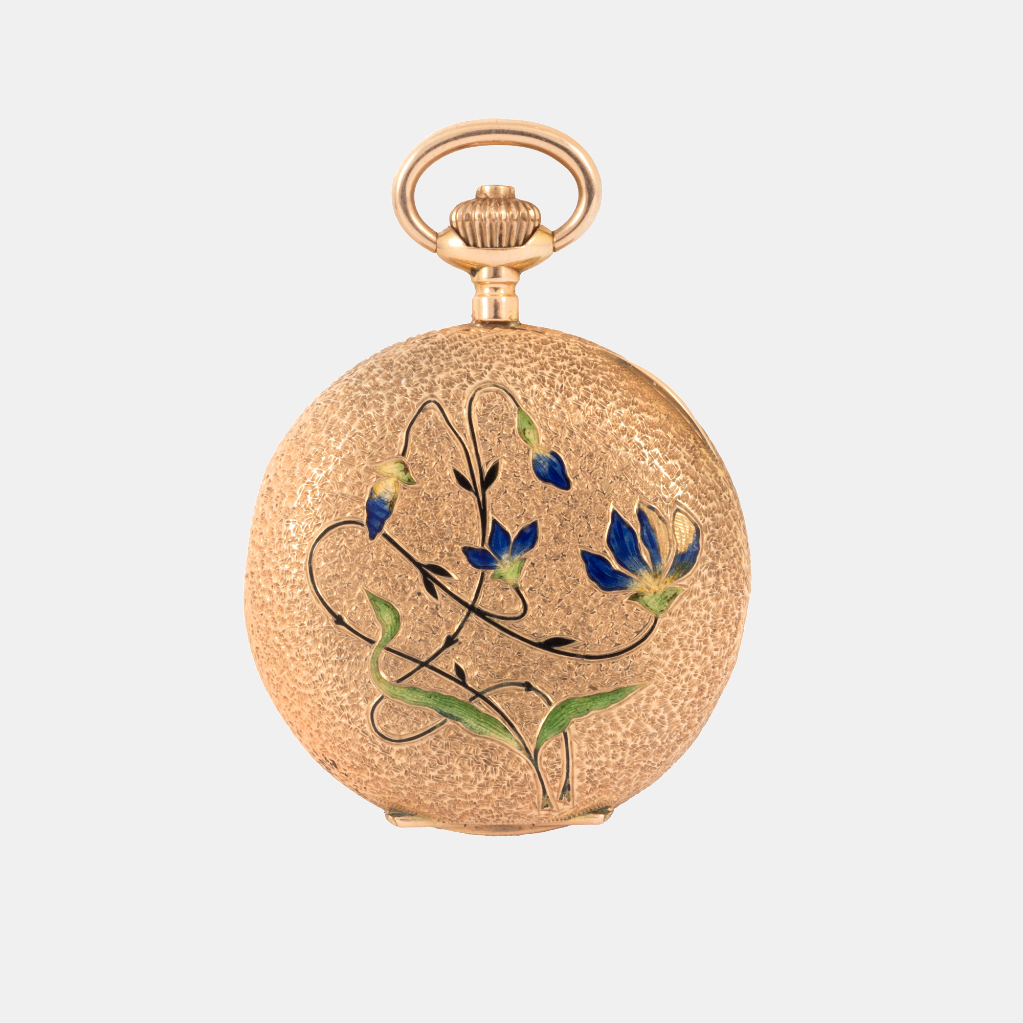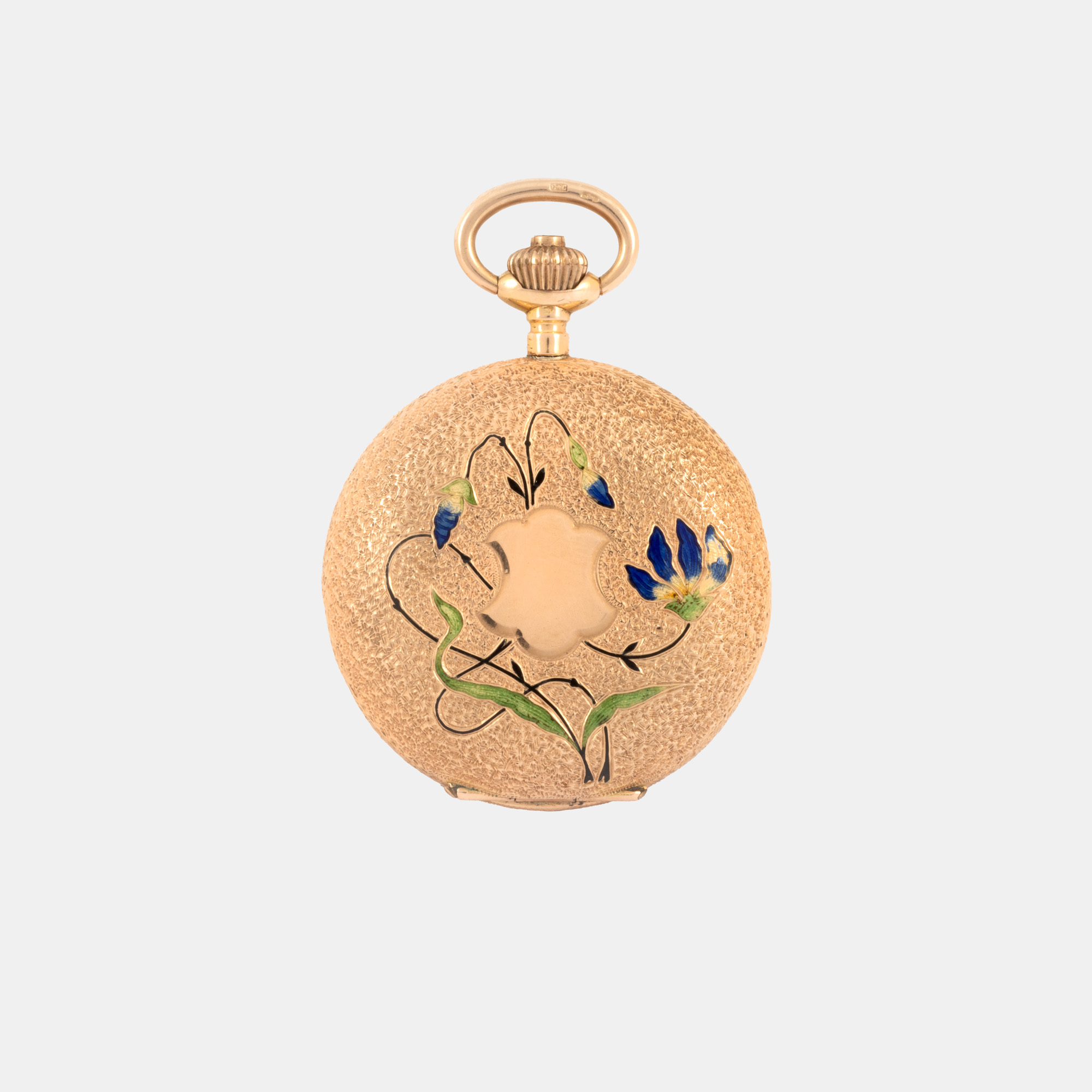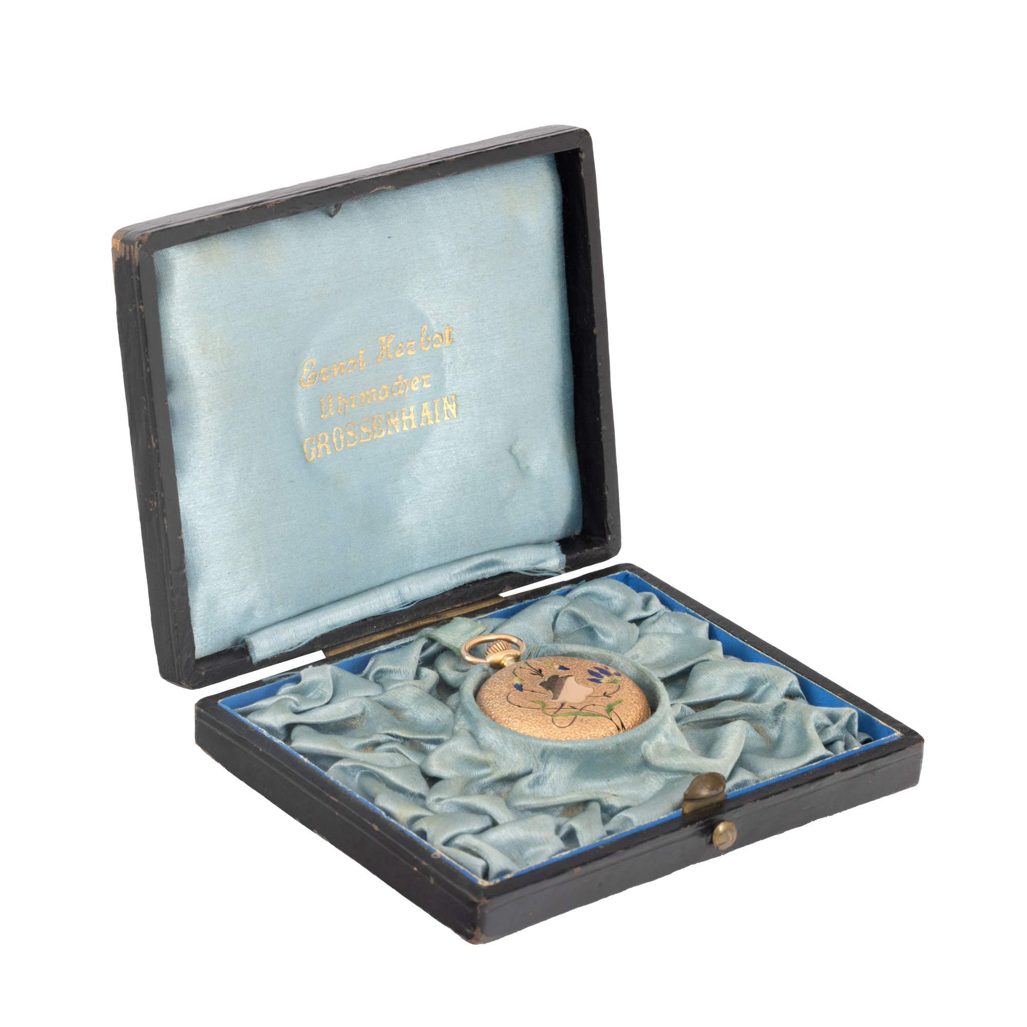 95. Ceas din aur, carcasa decorată cu motive florale, de buzunar, de damă, bijutier Grossenhain, însoțit de cutia de perioadă a distribuitorului [Cca. 1910]
