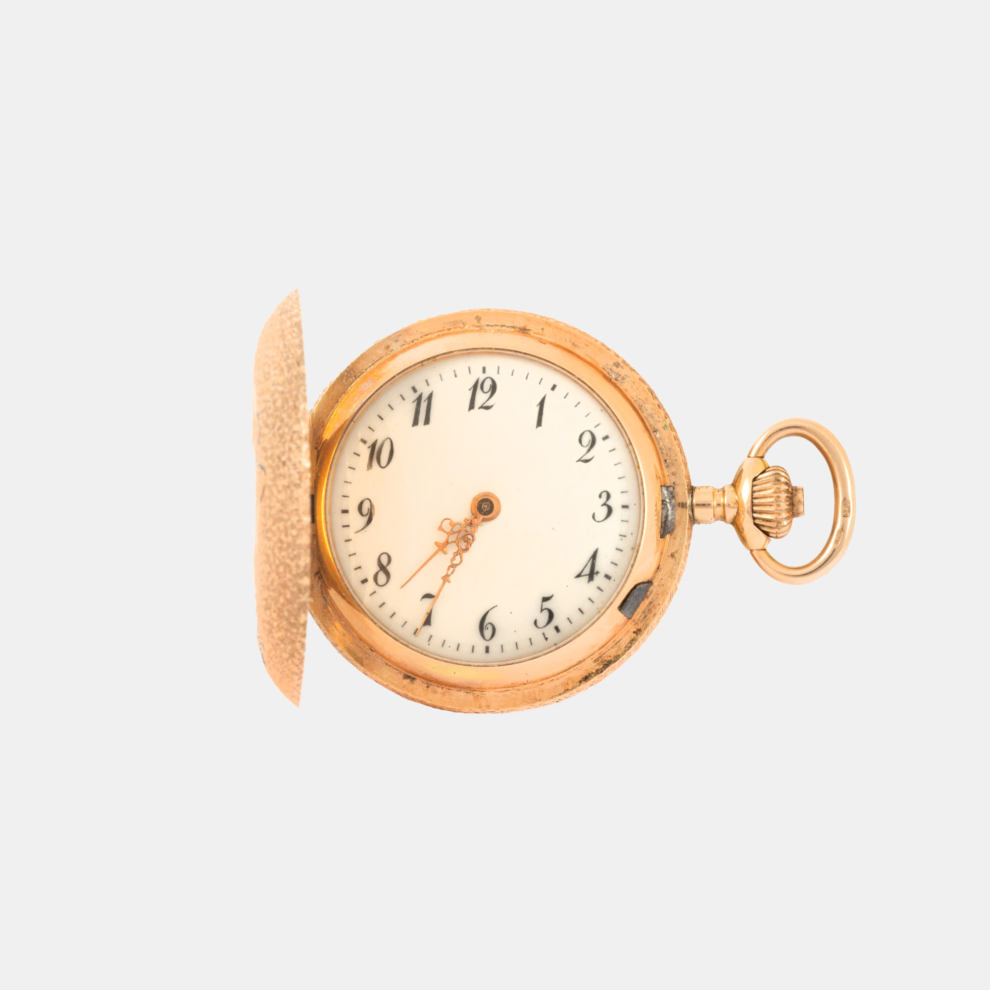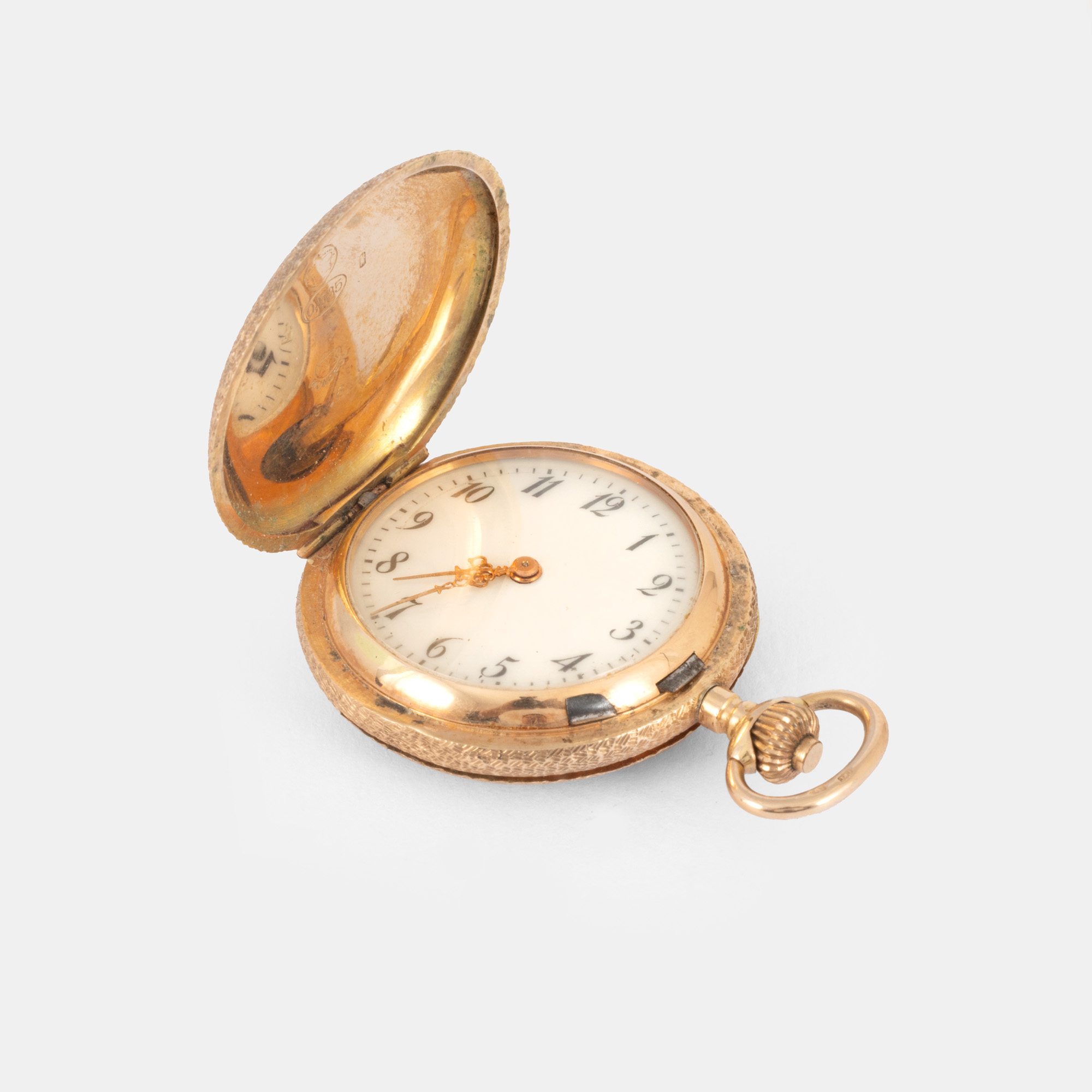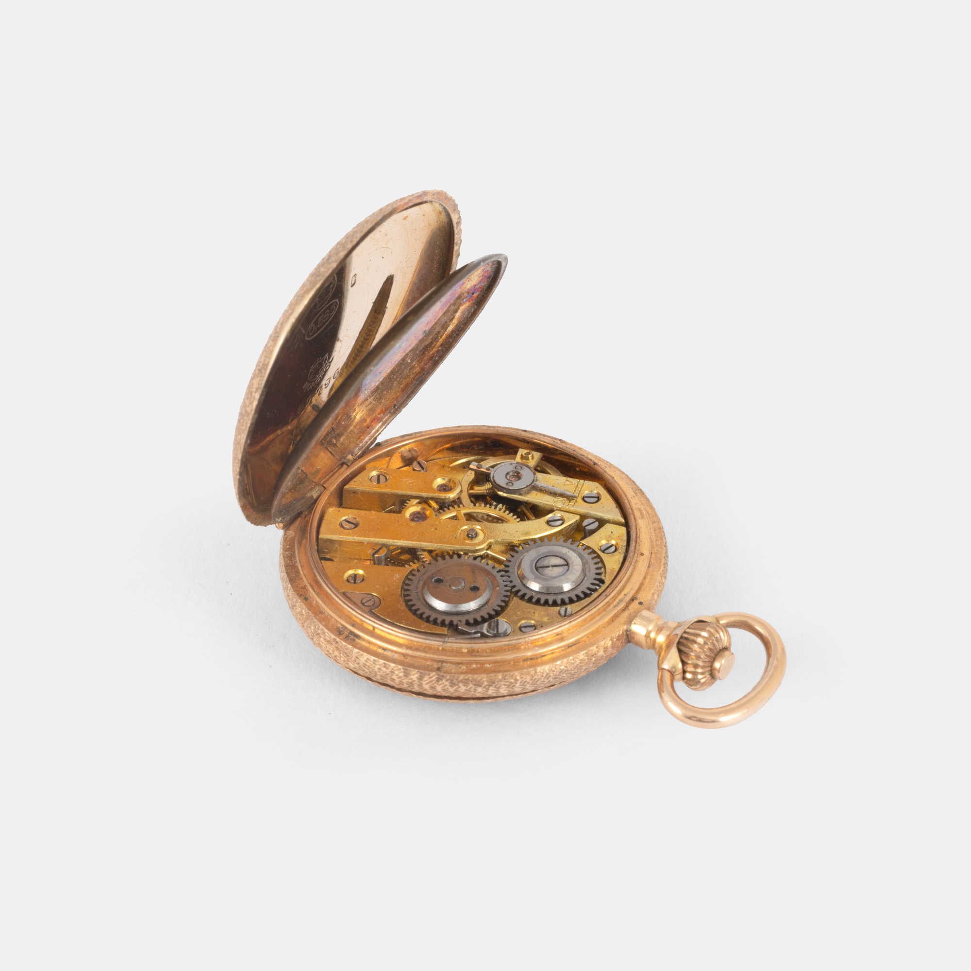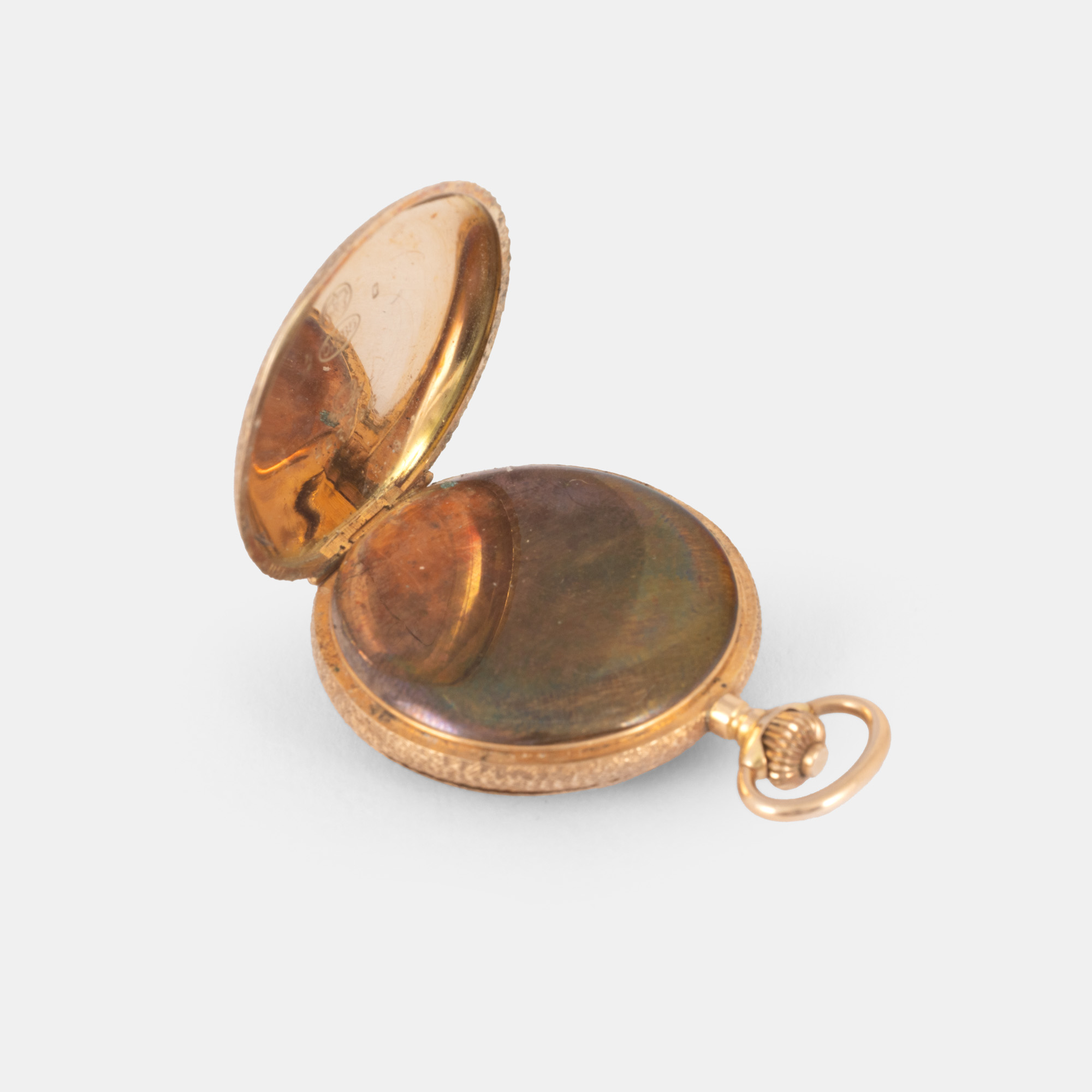 Ceas din aur, de buzunar, de damă. Mecanism cu armare manuală. Cadran de culoare alb, indici numerale arabe.