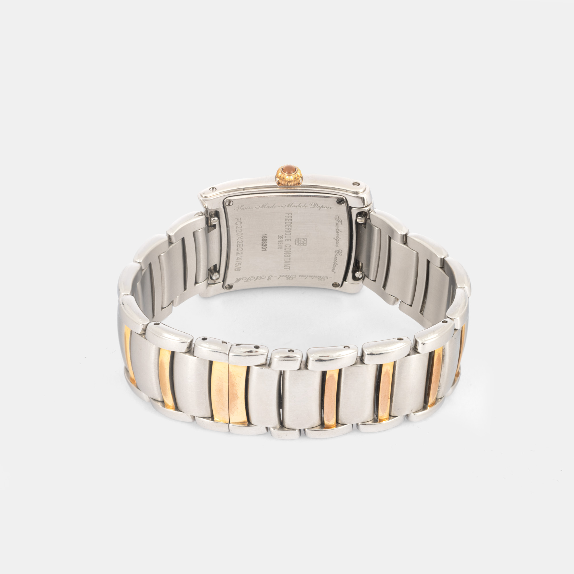 Ceas Frederique Constant, din oțel, cu diamante, de mână, de damă, referința FC220X2EC2/4/5/6. Mecanism quartz. Cadran din sidef, indici numerale arabe pentru orele cardinale și diamante pentru restul orelor, registru pentru dată în dreptul orei 6. Brățară originală, din oțel, cu sistem de închidere de tip deployant. Observații: cadran crăpat în dreptul orelor 7 și 8.