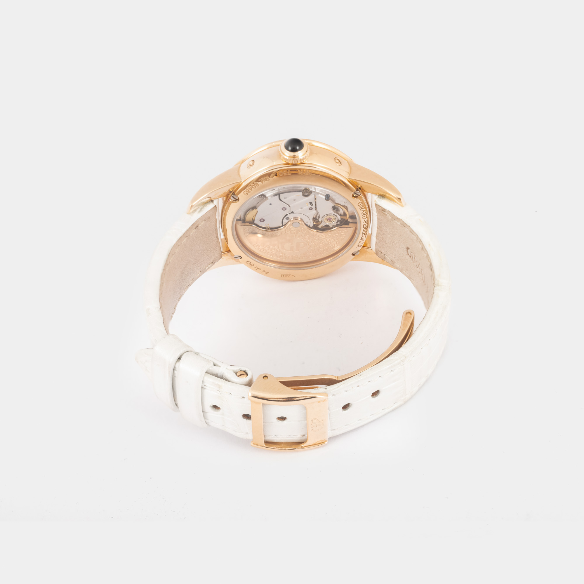 Ceas Girard Perregaux Cat's Eye Bi Retrograde, din aur, cu diamante, de mână, de damă, referință 80485D52A761-KK7A. Mecanism automatic, calibrul GP03309-8LW60, anterior vitrat, bezel fix, decorat cu diamante. Cadran din sidef, indici numerale arabe pentru orele 3 și 9 și diamante pentru restul orelor, registru pentru fazele lunii în dreptul orei 12, registru pentru dată în dreptul orei 6, registru pentru zilele săptămânii desfășurat retrograd între orele 3 și 5, registru pentru secundar desfășurat retrograd între orele 7 și 9. Curea originală, din piele, de culoare albă, cu sistem de închidere de tip deployant, din aur. Accesorii: cutia originală, card de garanție, certificat gemologic, manual de utilizare
