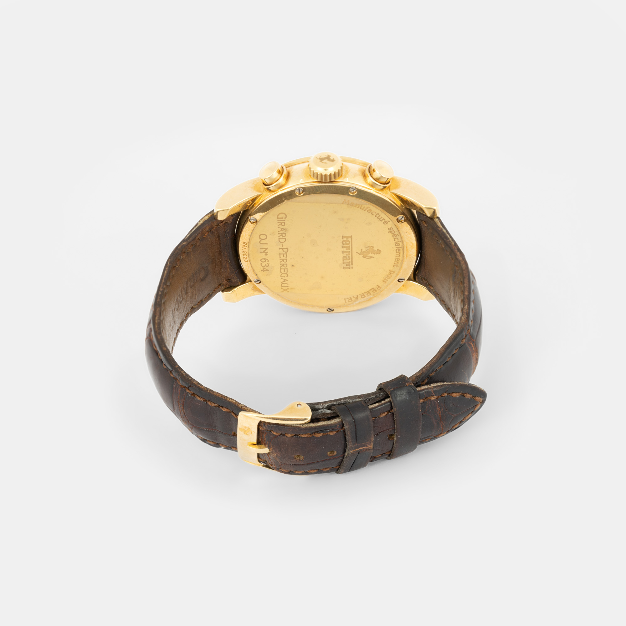 Ceas Girard Perregaux, din aur, ediție specială Ferrari, de mână, bărbătesc, referința 8020. Mecanism automatic, calibrul 2280-881 cu 57 de rubine, cu funcție de chronograph. Cadran de culoare champagne, indici baghete, registru pentru secundar în dreptul orei 3, registru pentru dată între orele 4 și 5, două registre pentru chronograph în dreptul orelor 6 și 9. Curea originală, din piele, de culoare maro, cu sistem de închidere clasic, cu catarama originală din aur.