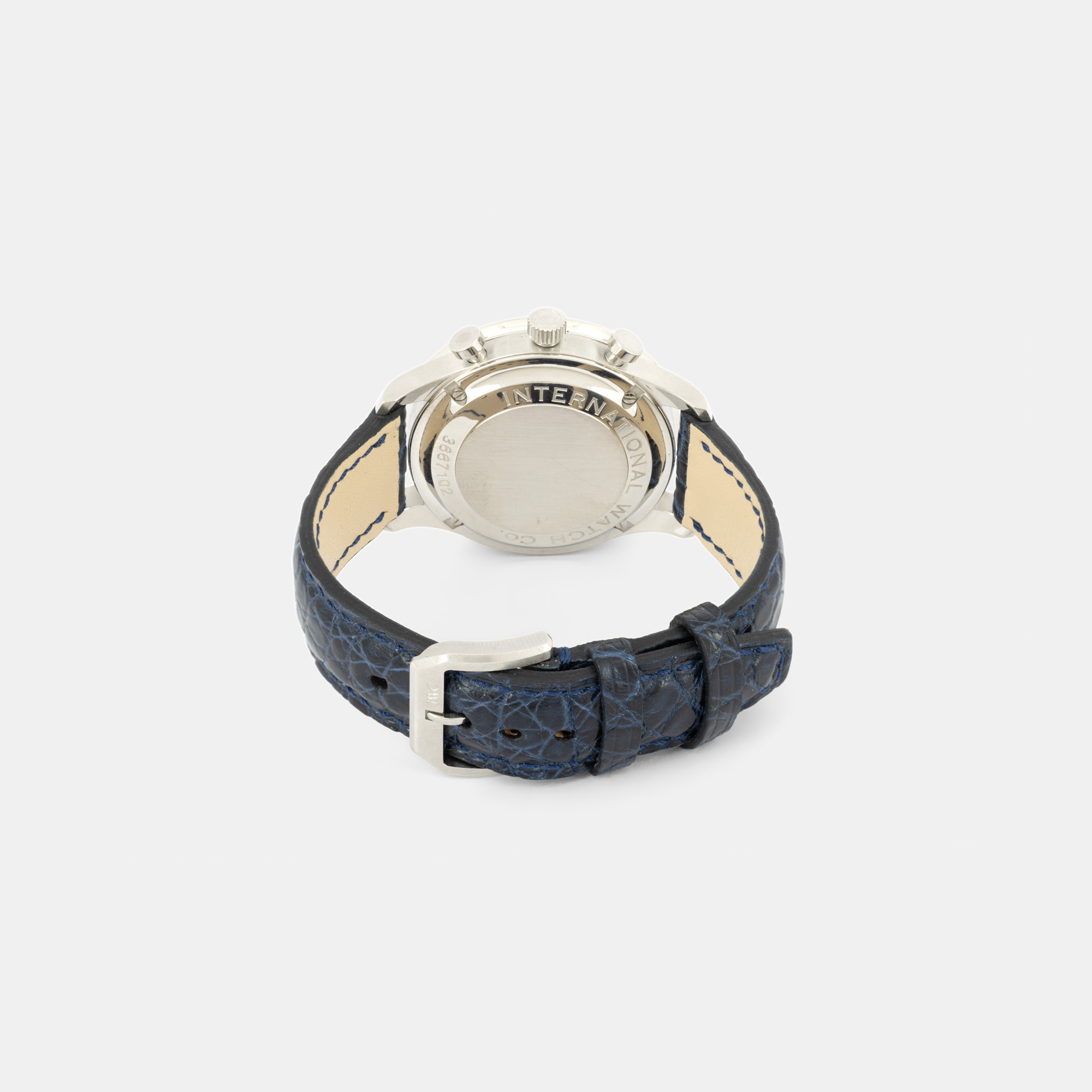 Ceas IWC Portugueser Chronograph, de mână, bărbătesc, referință 3714-001. Mecanism automatic, calibrul 79350 cu 31 de rubine, funcție chronograph. Cadran de culoare alb, indici numerale arabe, registru pentru secundar în dreptul orei 6, registru pentru funcția de chronograph în dreptul orei 12. Curea adăugată aftermarket, din piele, de culoare albastră, cu sistem de închidere de tip clasic.
