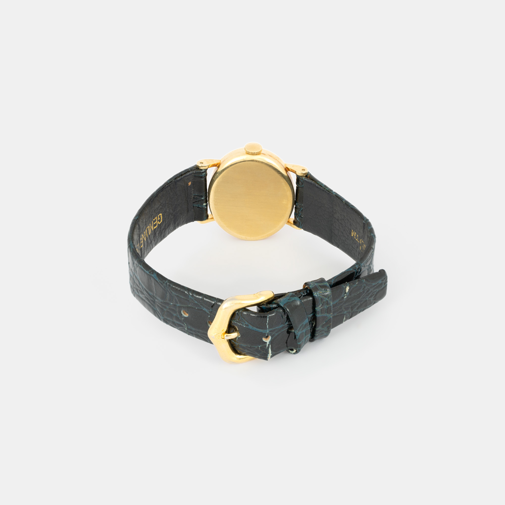 Rar ceas IWC, din aur, de mână, de damă, referință 218808. Mecanism cu armare manuală, calibrul 412. Cadran de culoare bleumarin, indici baghetă aplicați. Curea adăugată aftermarket, din piele, de culoare bleumarin, cu sistem de închidere de tip clasic cu cataramă.
