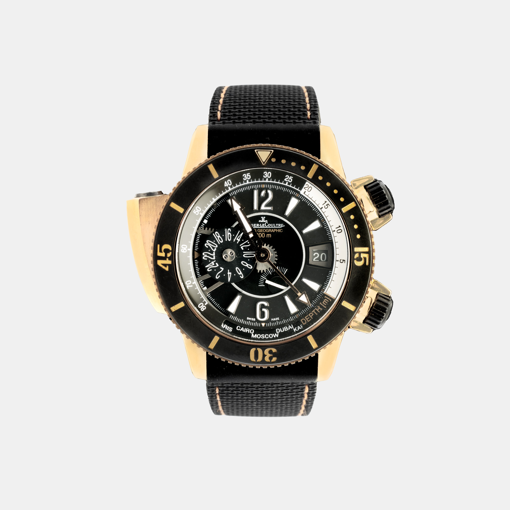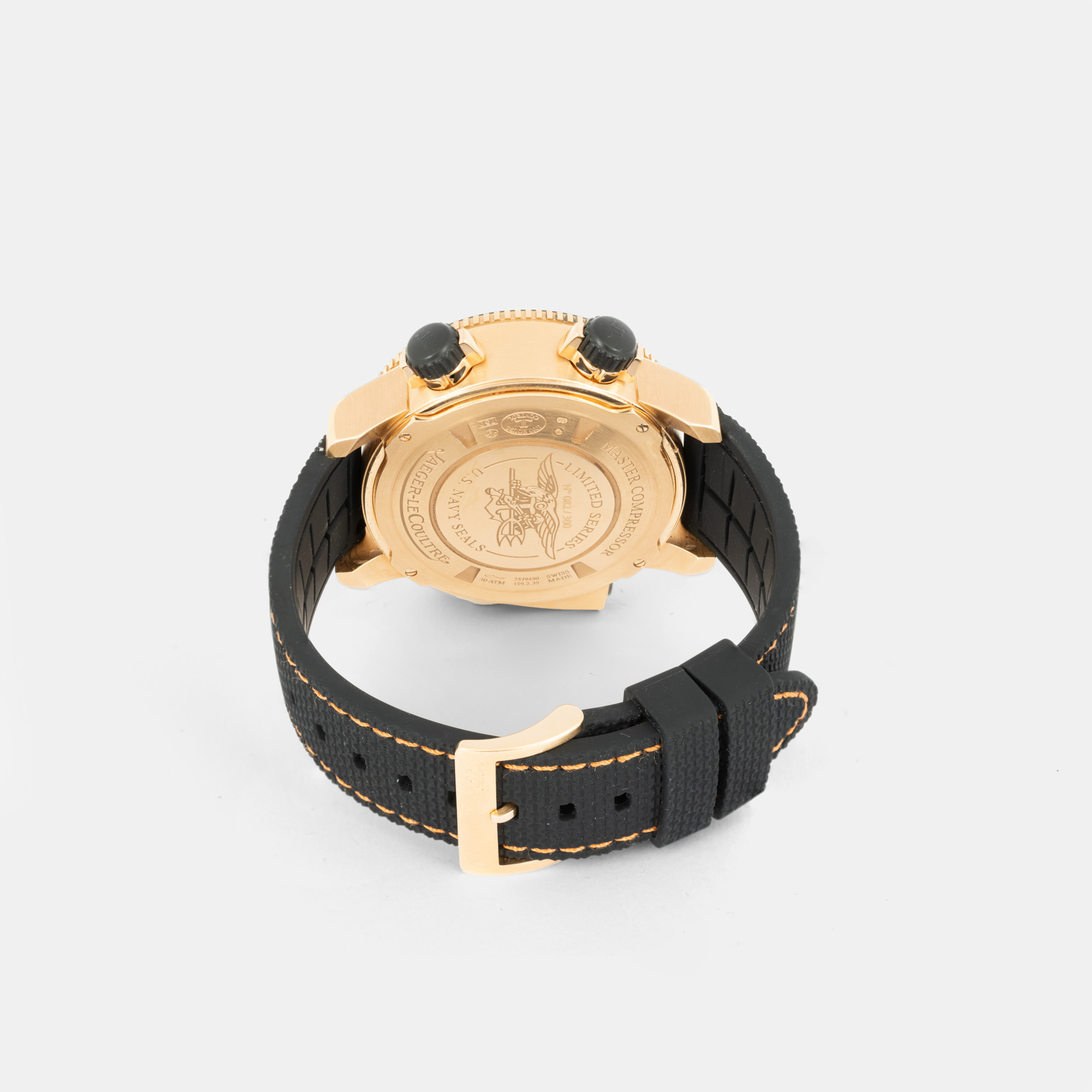 Ceas Jaeger LeCoultre Master Compressor Diving Pro Geographic, din aur, ediție limitată Navy SEALs No 82/300 de mână, bărbătesc, referință 159.2.39. Mecanism automatic, calibrul Jaeger LeCoultre 979, cu funcție GMT. Cadran de culoare negru, indici numerale arabe și baghete, registru pentru dată în dreptul orei 3, registru desfășurat între orele 5 și 7 GMT pentru orașele lumii, registru GMT pentru oră în dreptul orei 9, registru retrograd desfășurat între orele 8 și 4 pentru afișarea adâncimii de scufundare ( în m). Curea originală, din cauciuc, de culoare neagră, cu sistem de închidere de tip clasic, cu catarama originală din aur roz. Accesorii: certificat de origine, manualul de utilizare și curea de schimb.