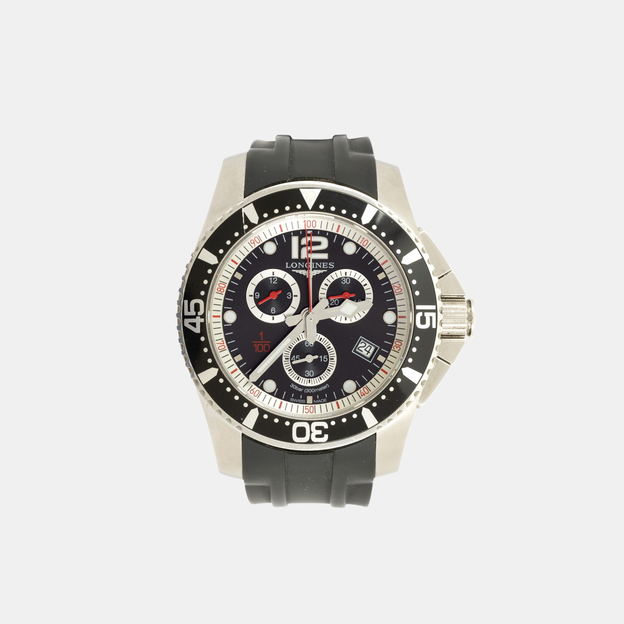 Ceas Longines Hydroconquest, de mână, bărbătesc, referință L3.843.4. Mecanism quartz, calibrul 440.2, cu funcție de chronograph. Cadran de culoare negru, indici circulari aplicați, cu un registru pentru secundar în dreptul orei 6 și două registre pentru funcția de chronograph în dreptul orelor 2 și 10. Curea originală, din cauciuc, de culoare neagră, cu sistem de închidere de tip clasic.