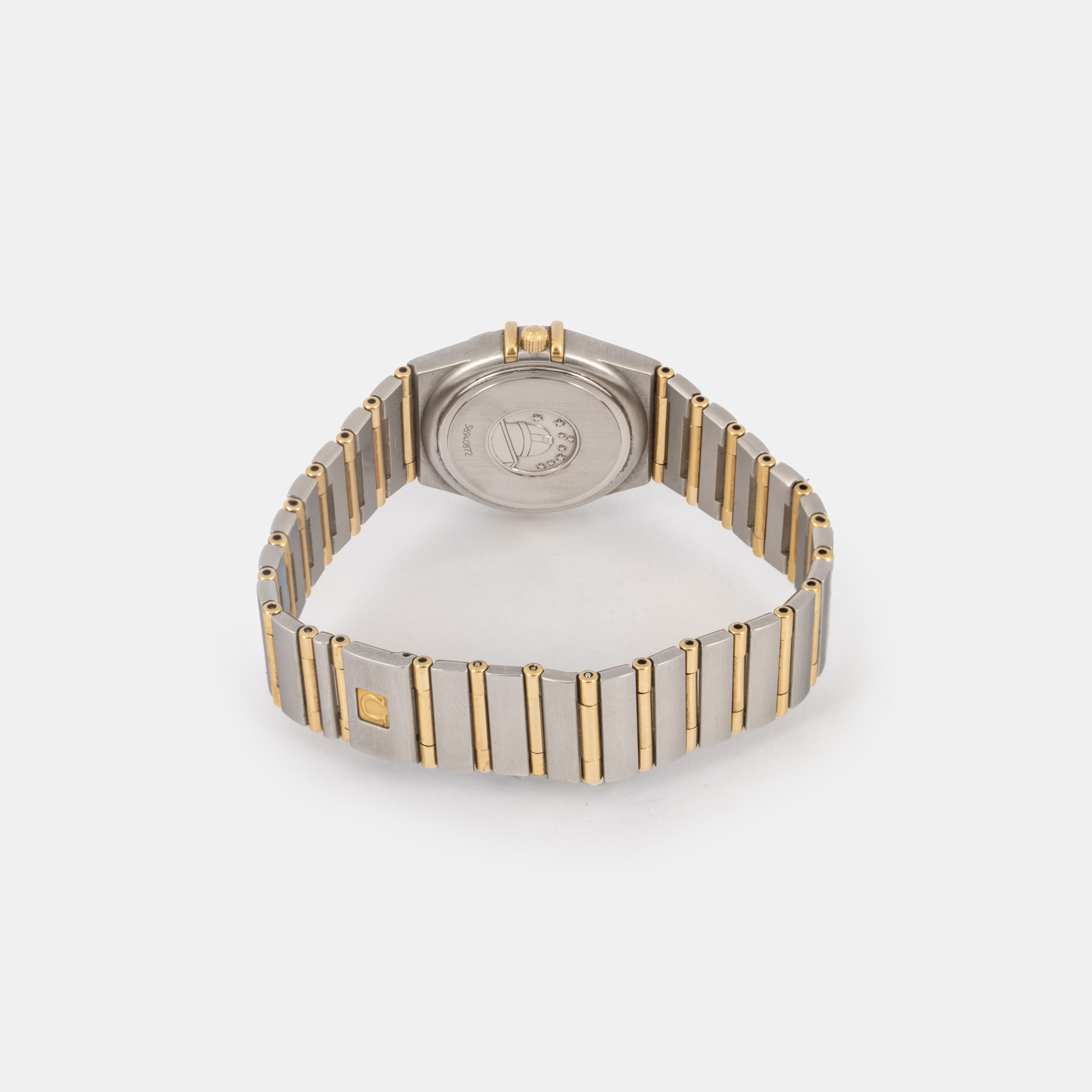 Ceas Omega Constelation My Choice, din aur și oțel, de mână, de damă. Mecanism quartz. Cadran din sidef, indici baghete, registru pentru dată în dreptul orei 3. Brățara originală, din aur și oțel, cu sistem de închidere de tip deployant. Accesorii: borseta de transport originală, card de garanție și za suplimentară.
