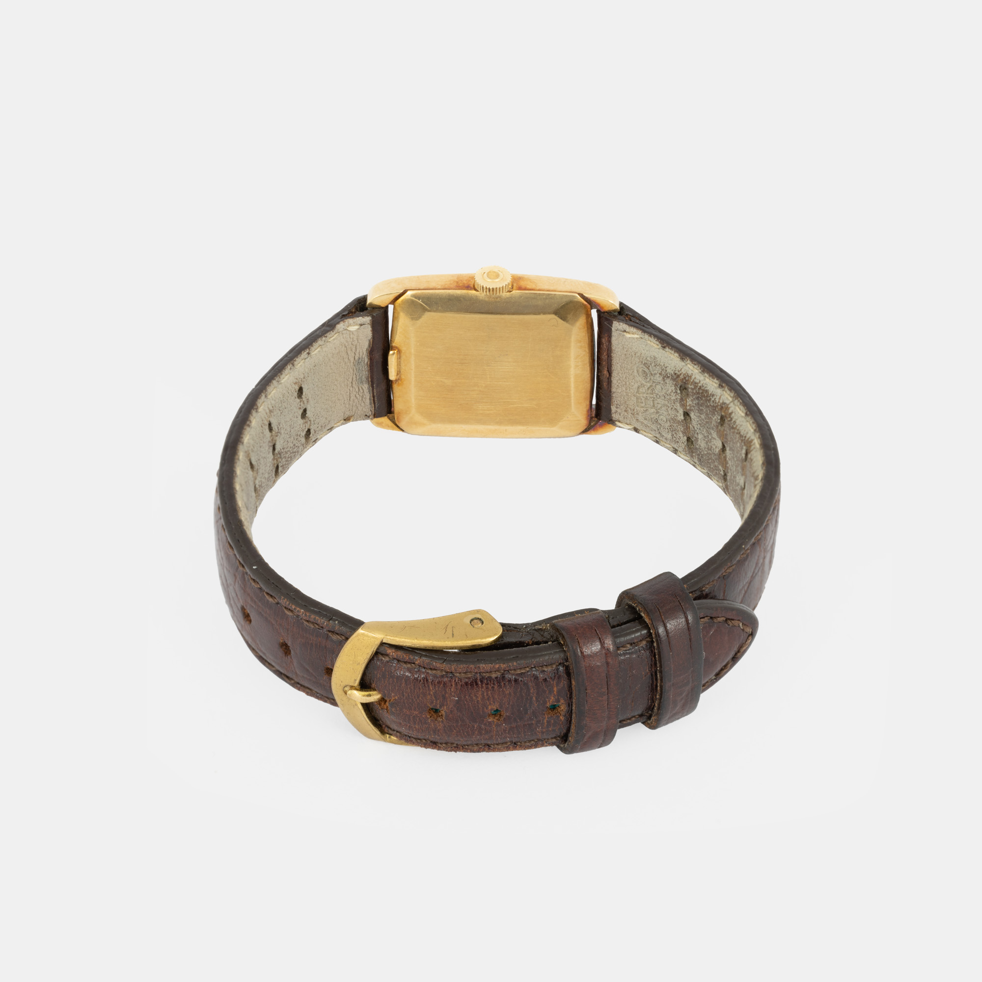 Ceas Omega De Ville, din aur, de mână, de damă. Mecanism cu armare manuală. Cadran de culoare auriu, indici puncte. Curea adăugată aftermarket, din piele, de culoare maronie, cu sistem de închidere de tip clasic cu cataramă. Observații: mecanismul are un avans de aproximativ 2 min/zi.