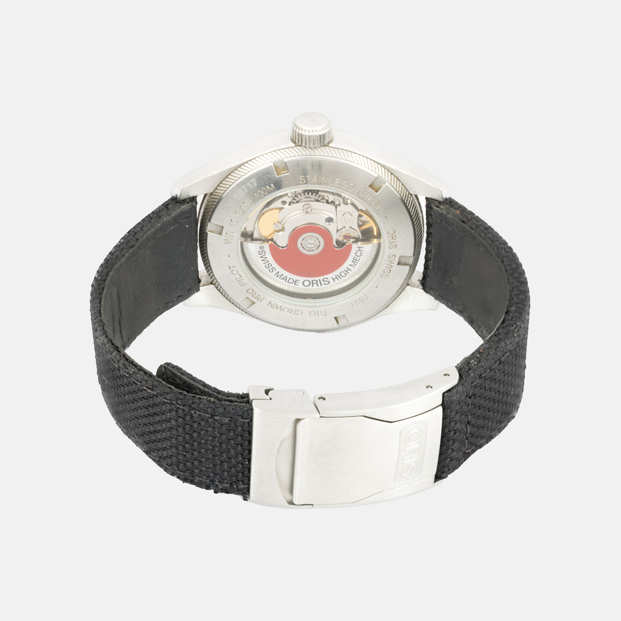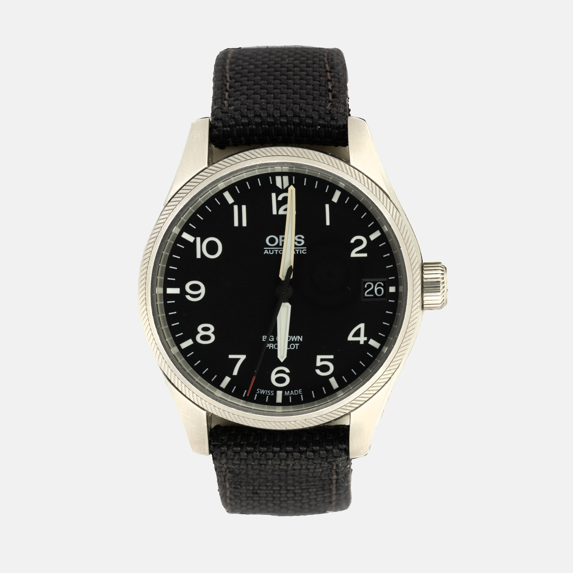 Ceas Oris Big Crown Pro Pilot, de mână, bărbătesc. Mecanism automatic, calibrul 751, anterior vitrat. Cadran de culoare negru, indici numerale arabe, registru pentru dată în dreptul orei 3. Curea originală, din piele și material textil, de culoare neagră, cu sistem de închidere de tip deployant.