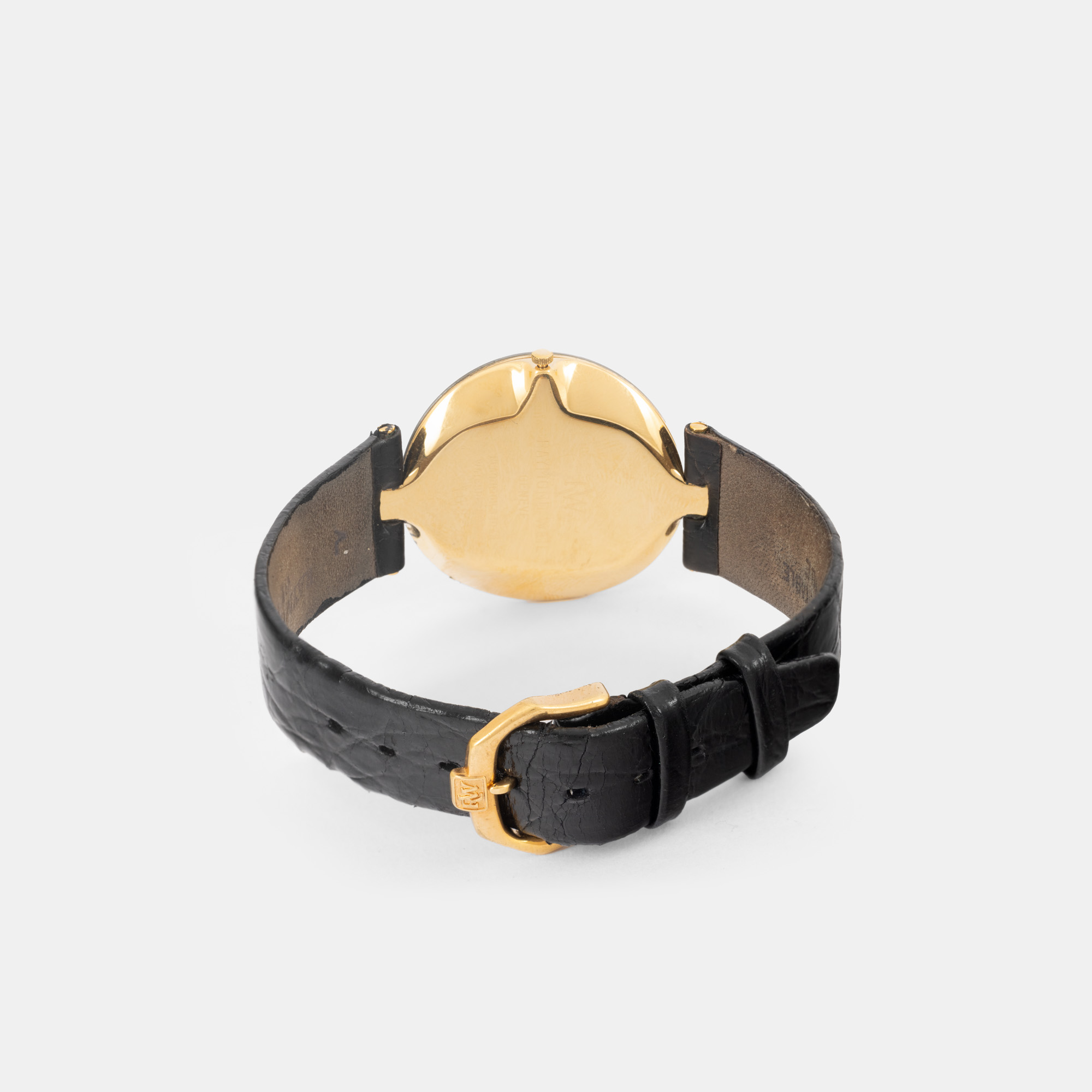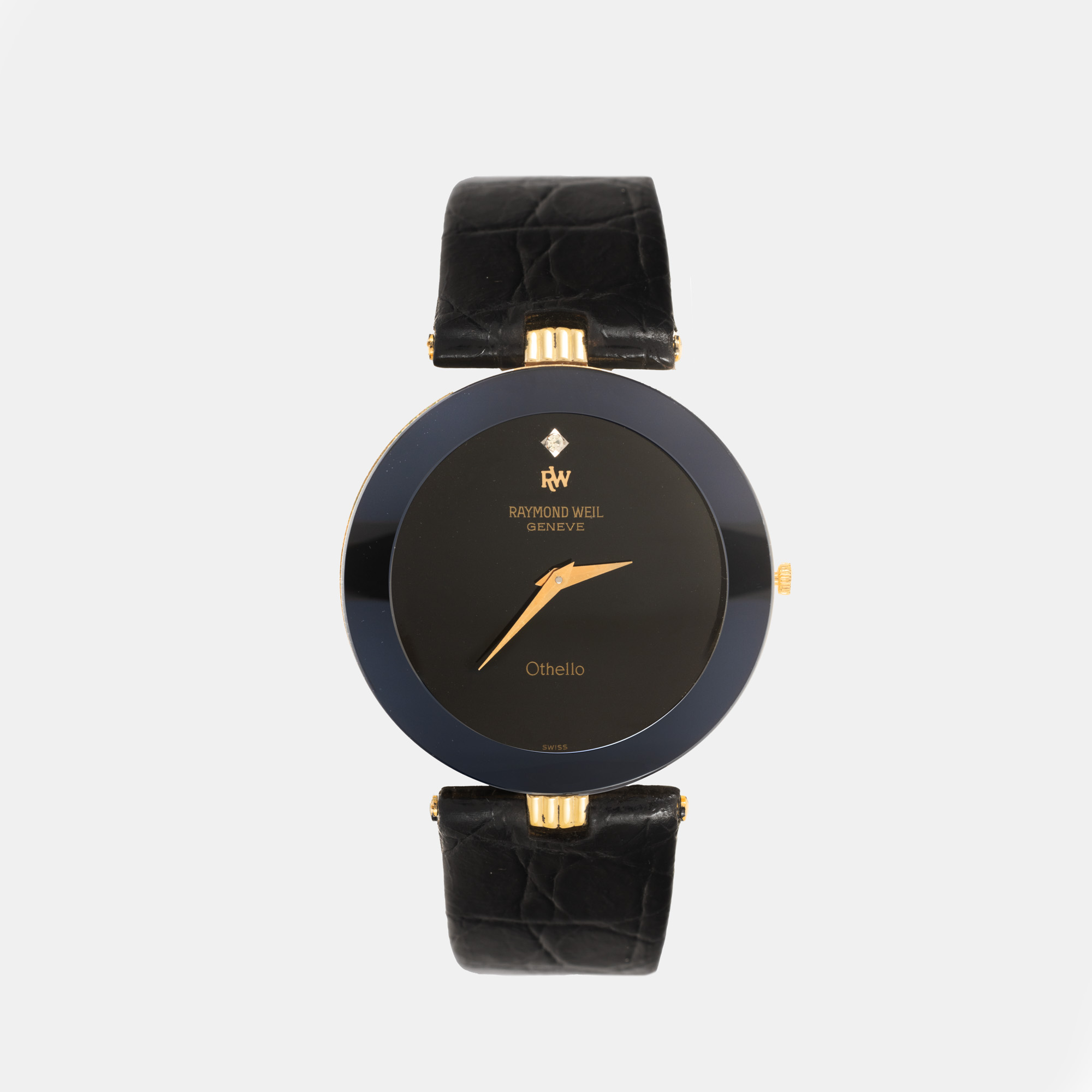 Ceas Raymond Weil Otello, de mână, de damă, referință 127-2. Mecanism quartz, calibrul ETA 282.001. Cadran de culoare negru, lipsit de indici, cu un safir în dreptul orei 12. Curea originală, din piele de aligator, de culoare neagră, cu sistem de închidere de tip clasic cu cataramă.